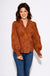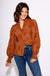 Embrace effortless elegance with this chestnut-colored floral applique embroidered top. Featuring long puff sleeves with smocked ruffle cuffs, a ruffled V-neckline, and a button-up front, it offers a delicate, feminine silhouette. Lightweight and fully lined, the woven fabric ensures comfort without transparency, making it perfect for both day and evening wear. Elevate your wardrobe with this romantic, timeless piece.