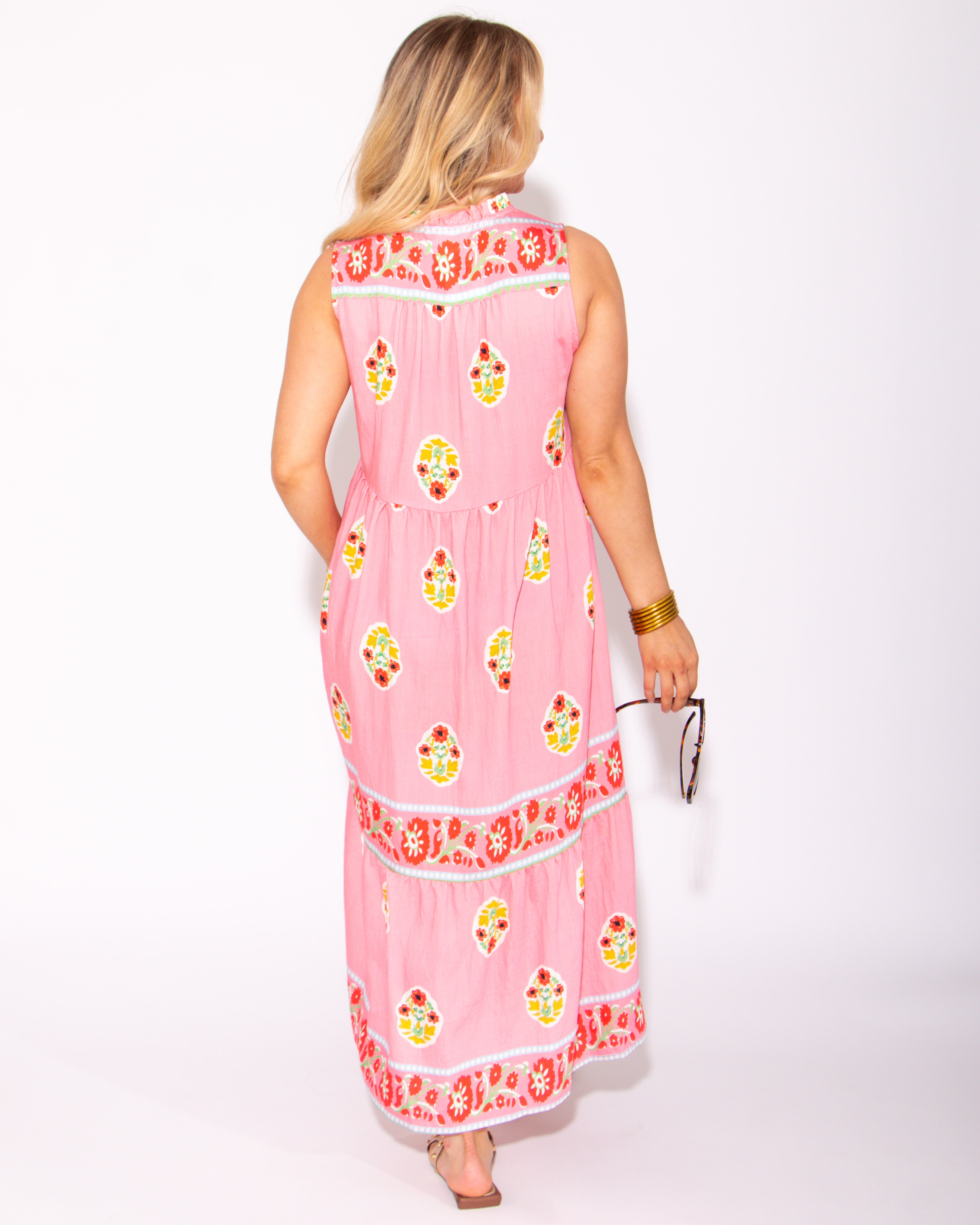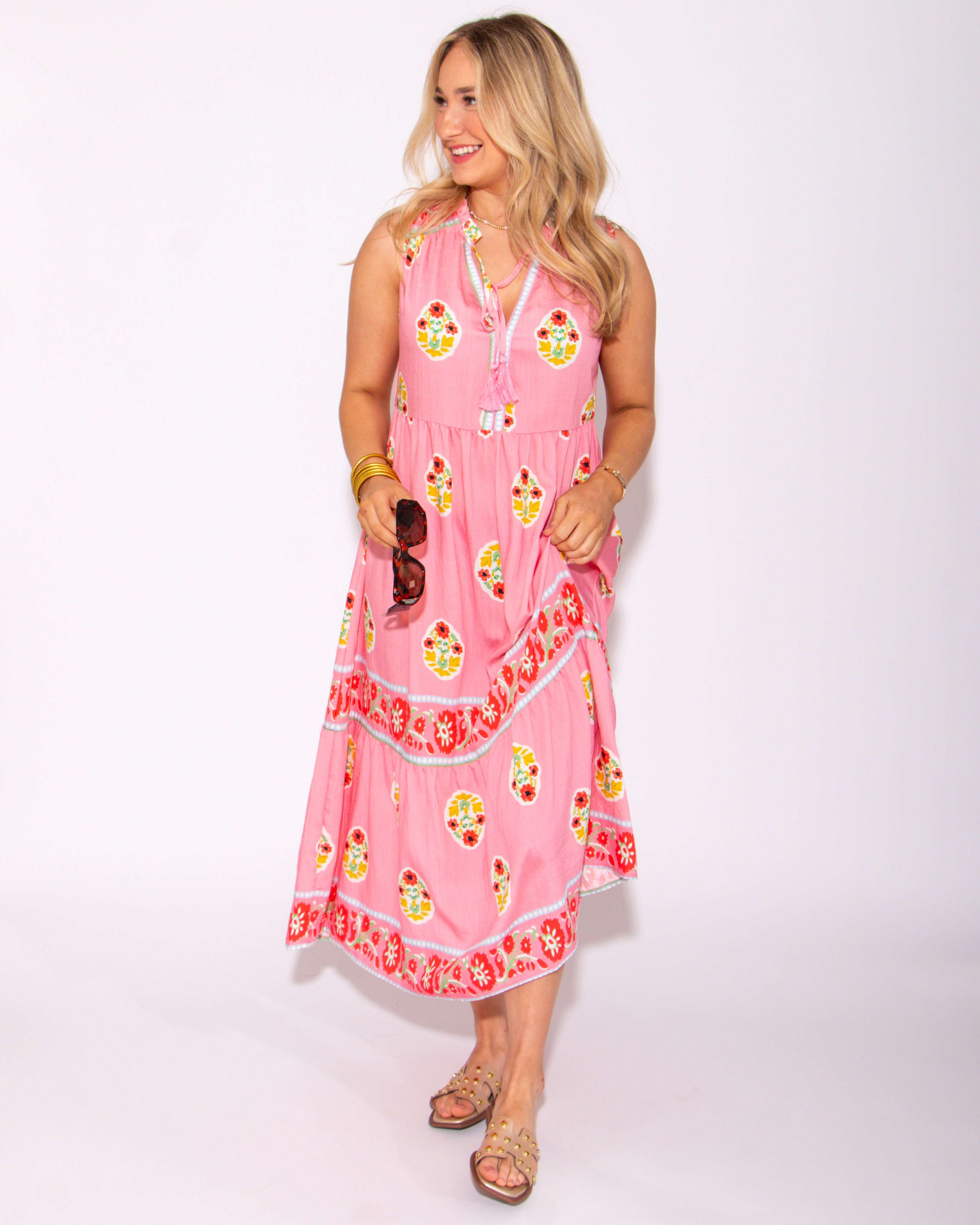 Embrace bohemian beauty in our Floral Print Border Midi Dress! With its vibrant, embroidered flowers and relaxed, tiered silhouette, this sleeveless maxi dress exudes effortless charm. The notched neckline adds a touch of allure while the maxi length keeps it versatile. Perfect for any occasion, this dress is sure to make a statement.