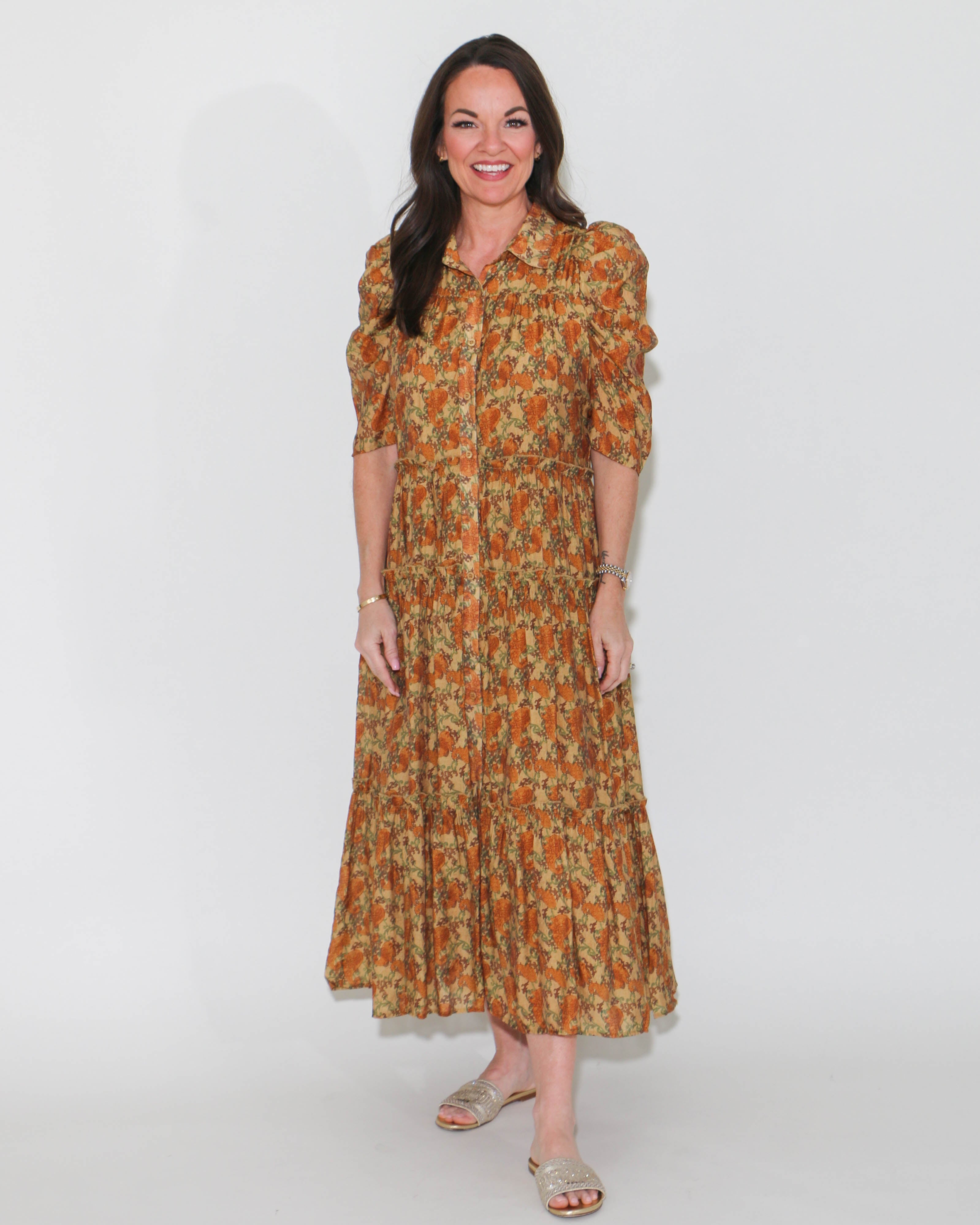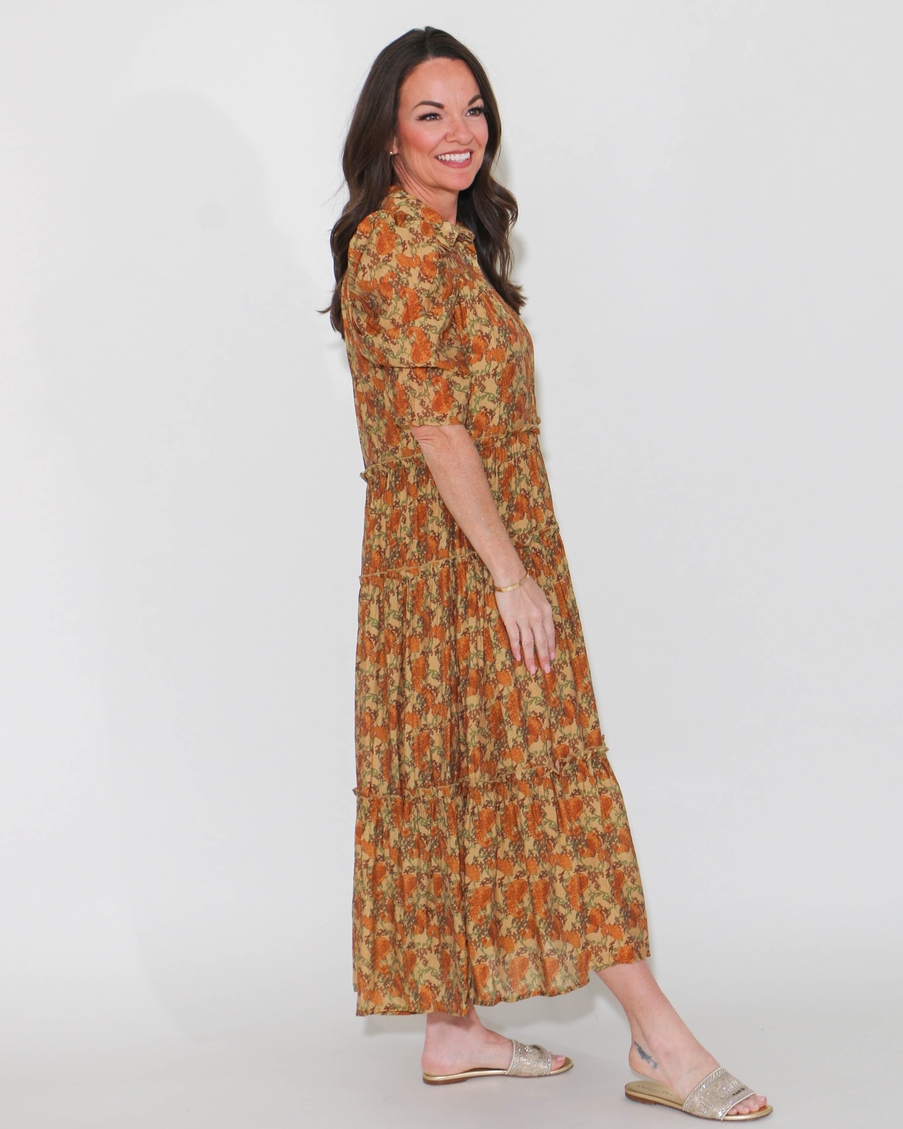The tiered skirt features delicate ruffle detailing, creating a graceful silhouette that moves effortlessly with you. Crafted from high-quality fabric, this midi dress ensures comfort and a flattering fit for all body types. Whether you're attending a garden party, brunch, or a special occasion, this dress is the perfect choice to make a memorable impression.