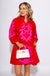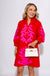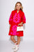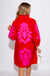 Elevate your everyday style with this striking shift dress featuring intricate baroque floral appliqué that commands attention. The ruffled high neckline and front button-up design add romantic sophistication, while the practical wide pockets keep you effortlessly put-together. Cut in a flattering mini silhouette with three-quarter sleeves, this red dress with delicate pink appliqué detailing transitions seamlessly from day to evening. A versatile piece that combines comfort with undeniable charm.