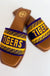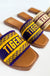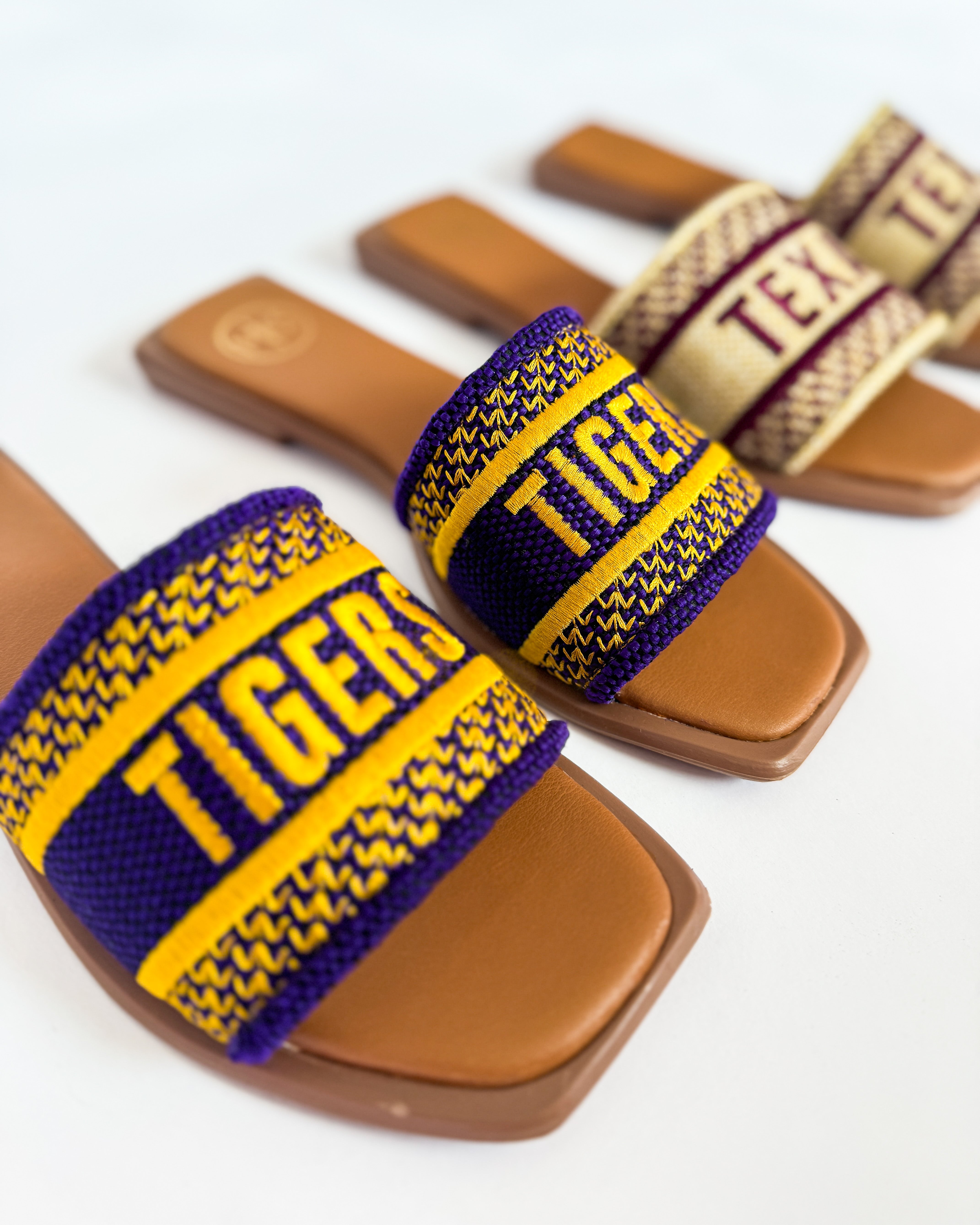 Show your team spirit with the Game Day Tiger Sandal in vibrant purple and gold. This essential sandal features a sleek, slip-on design with a single wide strap adorned with the names of your favorite teams. The square toe adds a modern touch to its classic silhouette. Perfect for game day or casual wear, this sandal blends style and team pride effortlessly.