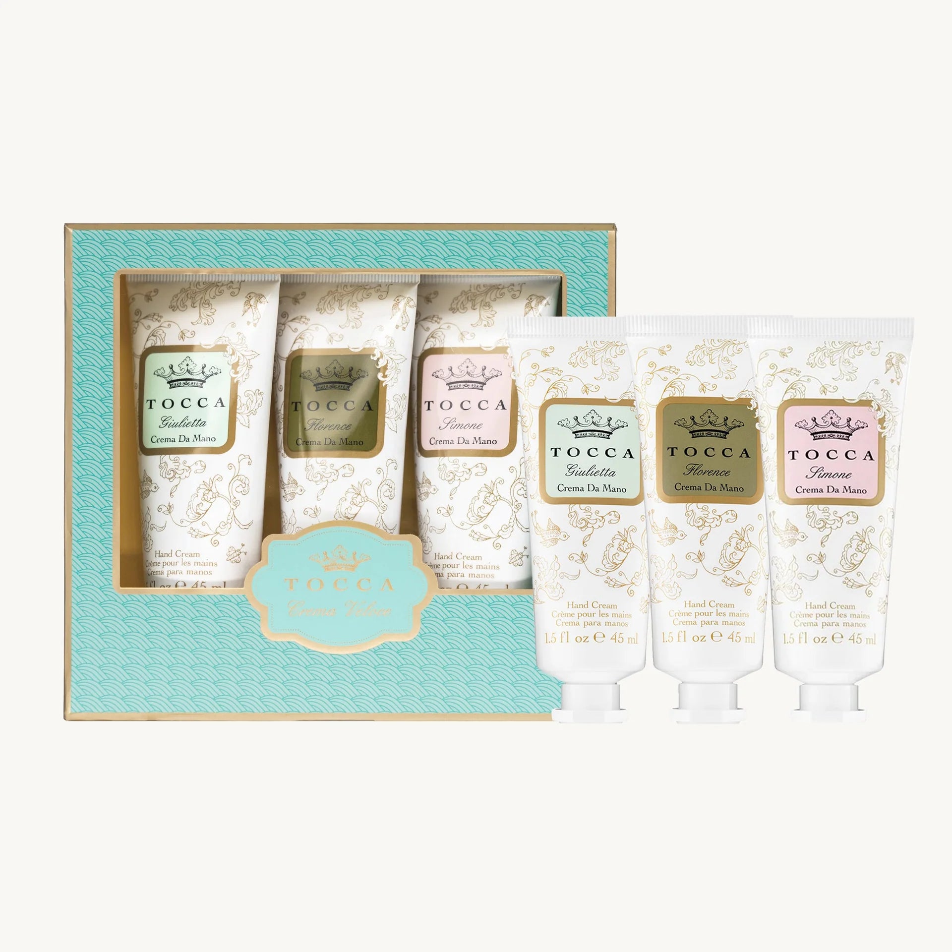 A trio of luxurious hand creams is tucked into this unique windowed keepsake box—the perfect springtime indulgence and ideal anytime gift. Hands become enveloped in a rich cream with nourishing coconut oil and shea butter infused with three iconic TOCCA scents.