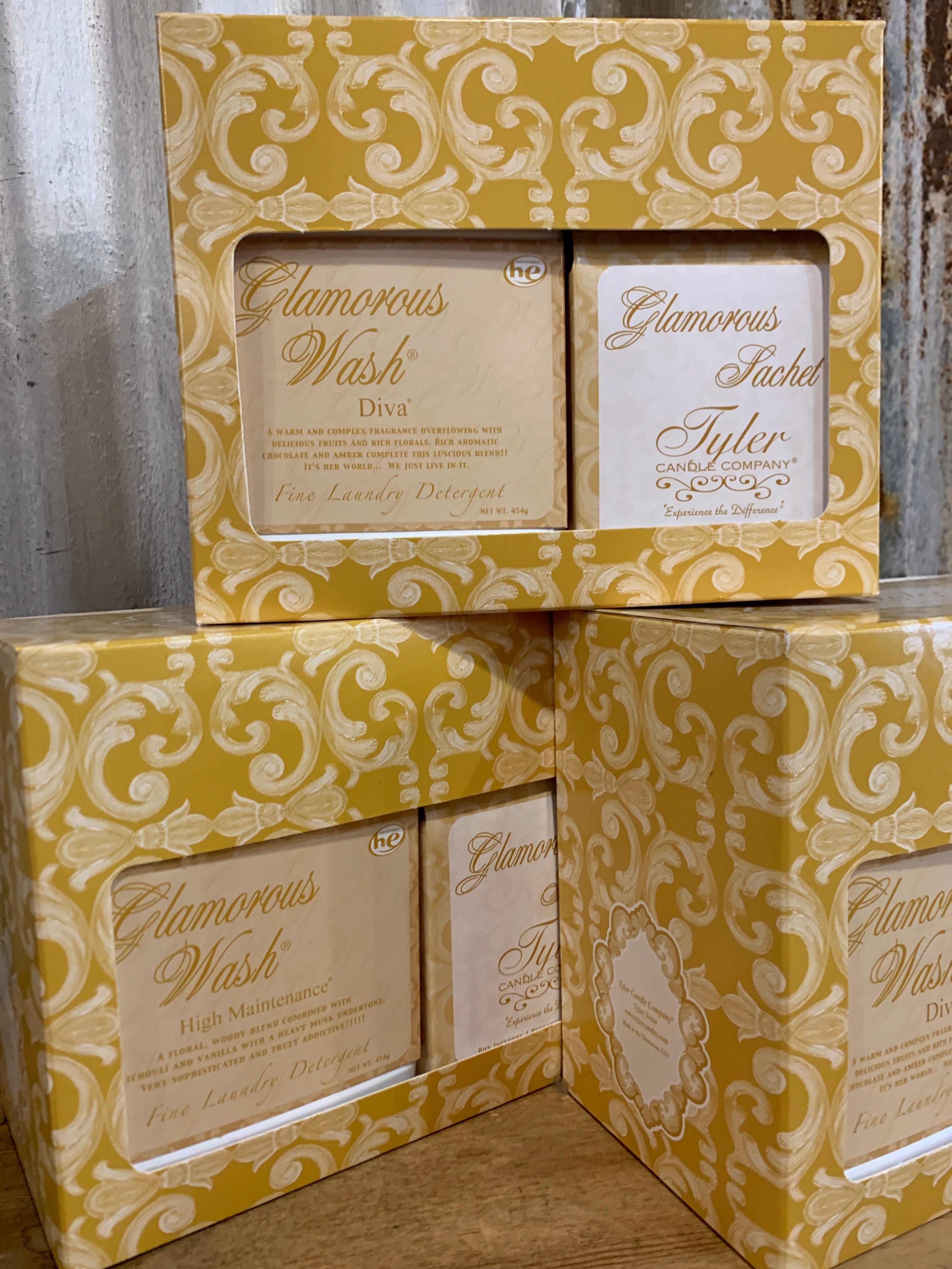 Glamorous Gift Suite V includes 2 bottles of phosphate-free, HE approved laundry detergent (Net Wt 454 g each) (16 oz) and a box of 4 reusable fragrance Dryer Satchet