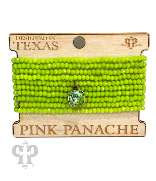 This stretch bracelet set has ten strands of neon green crystal beads with a 10 peridot Austrian crystal drop.