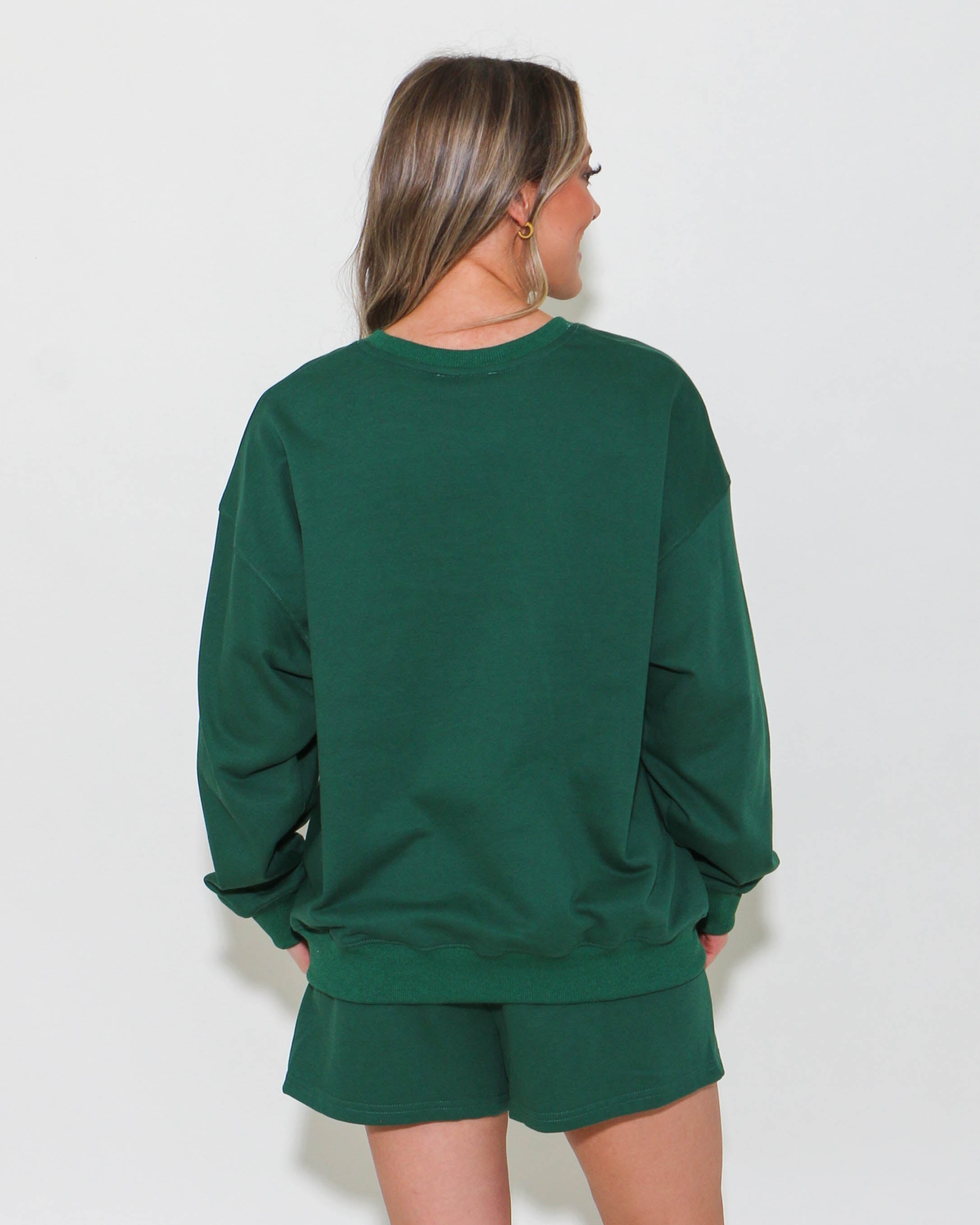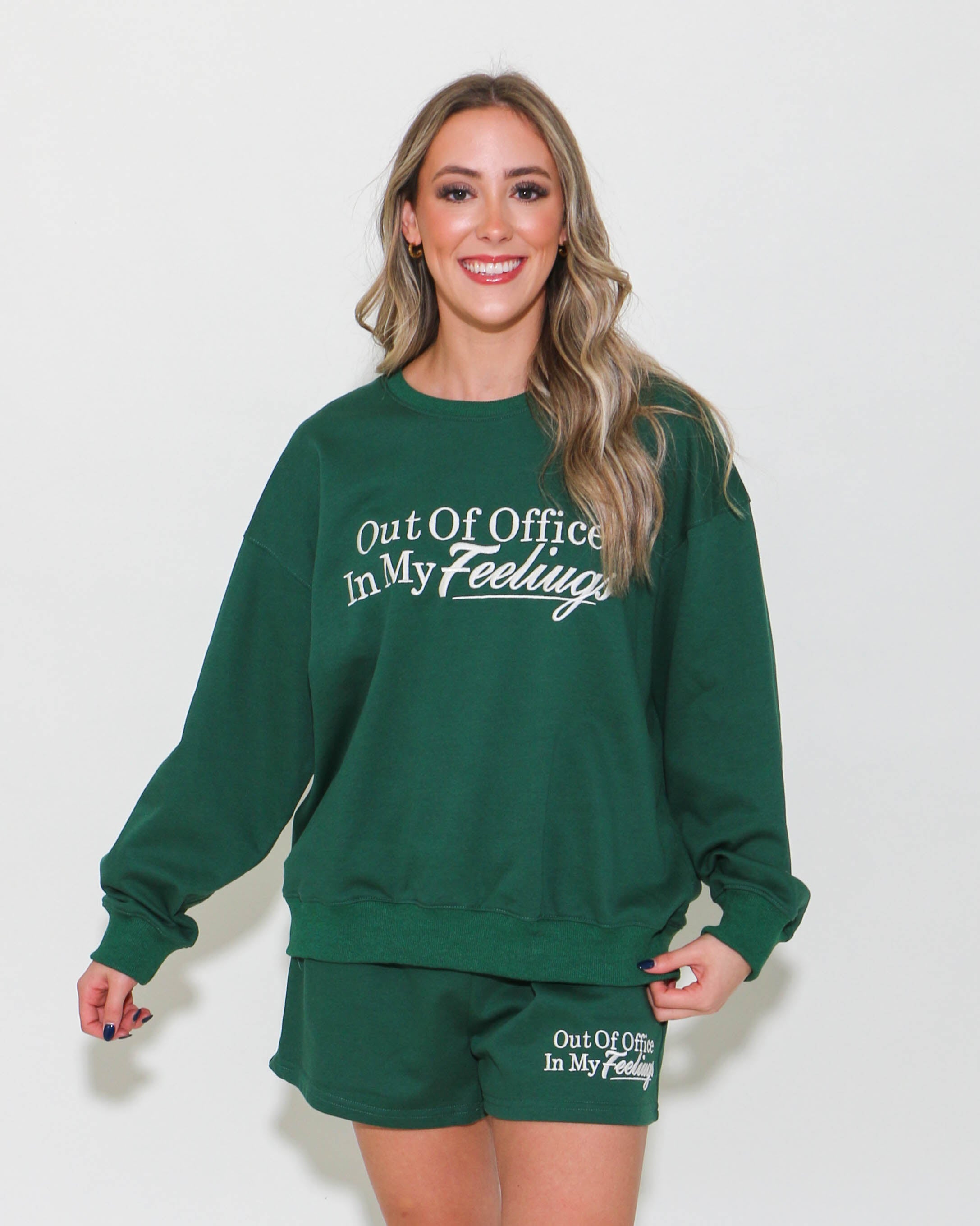 Upgrade your casual wardrobe with our green "Out of Office" Round Neck Long Sleeve Sweatshirt. This cozy sweatshirt features a classic round neckline and long sleeves, ensuring both comfort and style. The "Out of Office" embroidery adds a fun and playful touch, perfect for relaxing days and casual outings. Made from soft, high-quality fabric, this sweatshirt promises warmth and comfort throughout the day. Ideal for pairing with jeans, leggings, or our matching sweat shorts, it’s a versatile addition to any wardrobe.