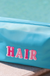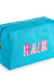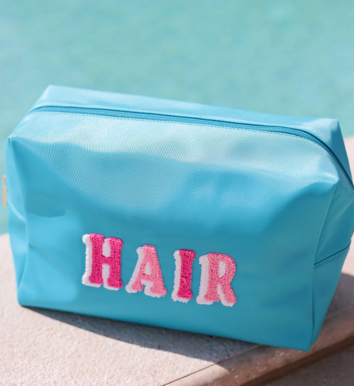 Keep your hair care essentials organized and stylish with the "Hair" Oversized Zip Pouch. This vibrant turquoise bag is roomy enough for all your brushes, sprays, and styling tools, while the playful pink chenille lettering adds a fun, cheeky touch. Whether you're jet-setting or simply heading to the gym, this pouch ensures your hair game stays on point wherever you go. Made from durable, easy-to-clean material, it’s the perfect companion for all your hair adventures.