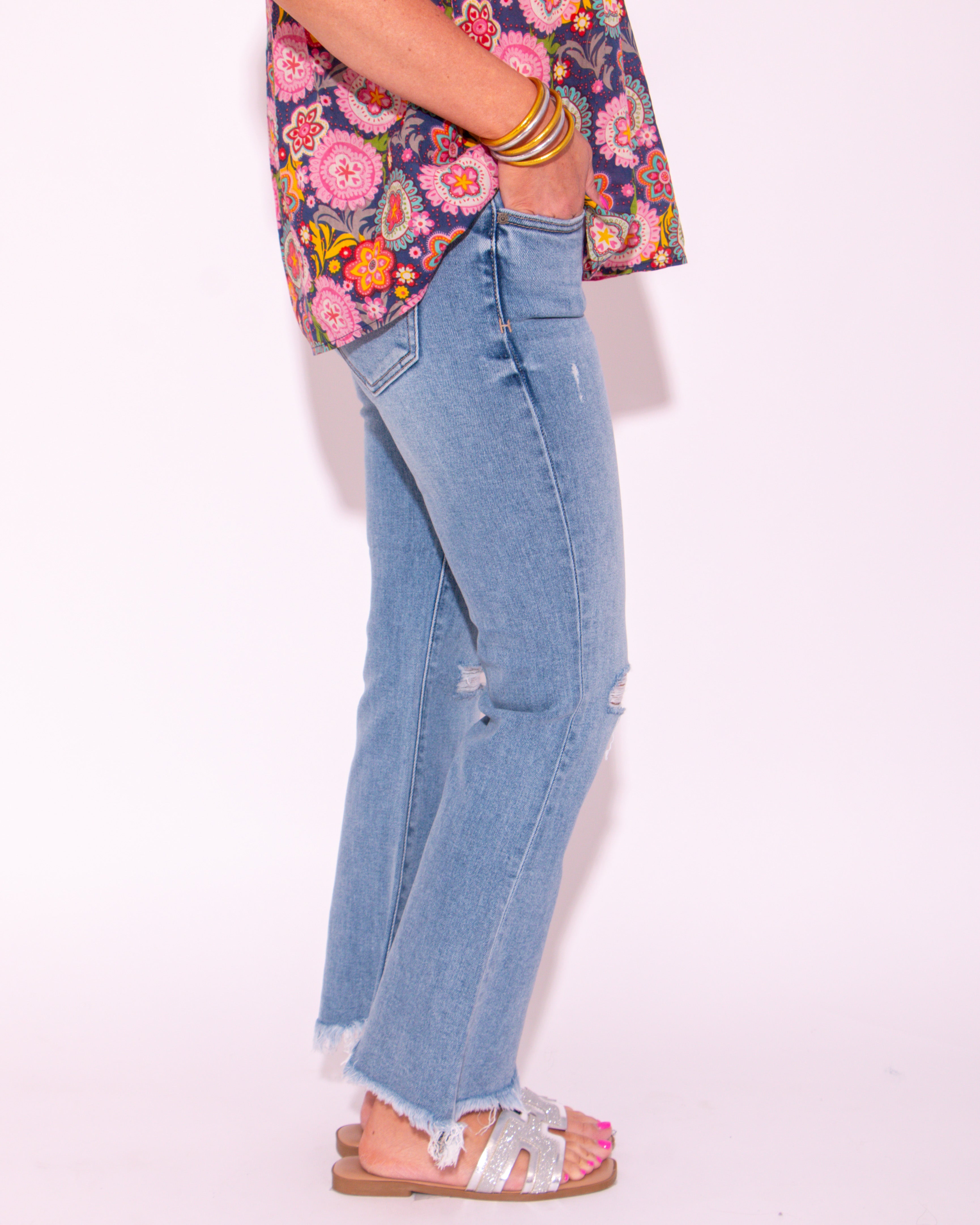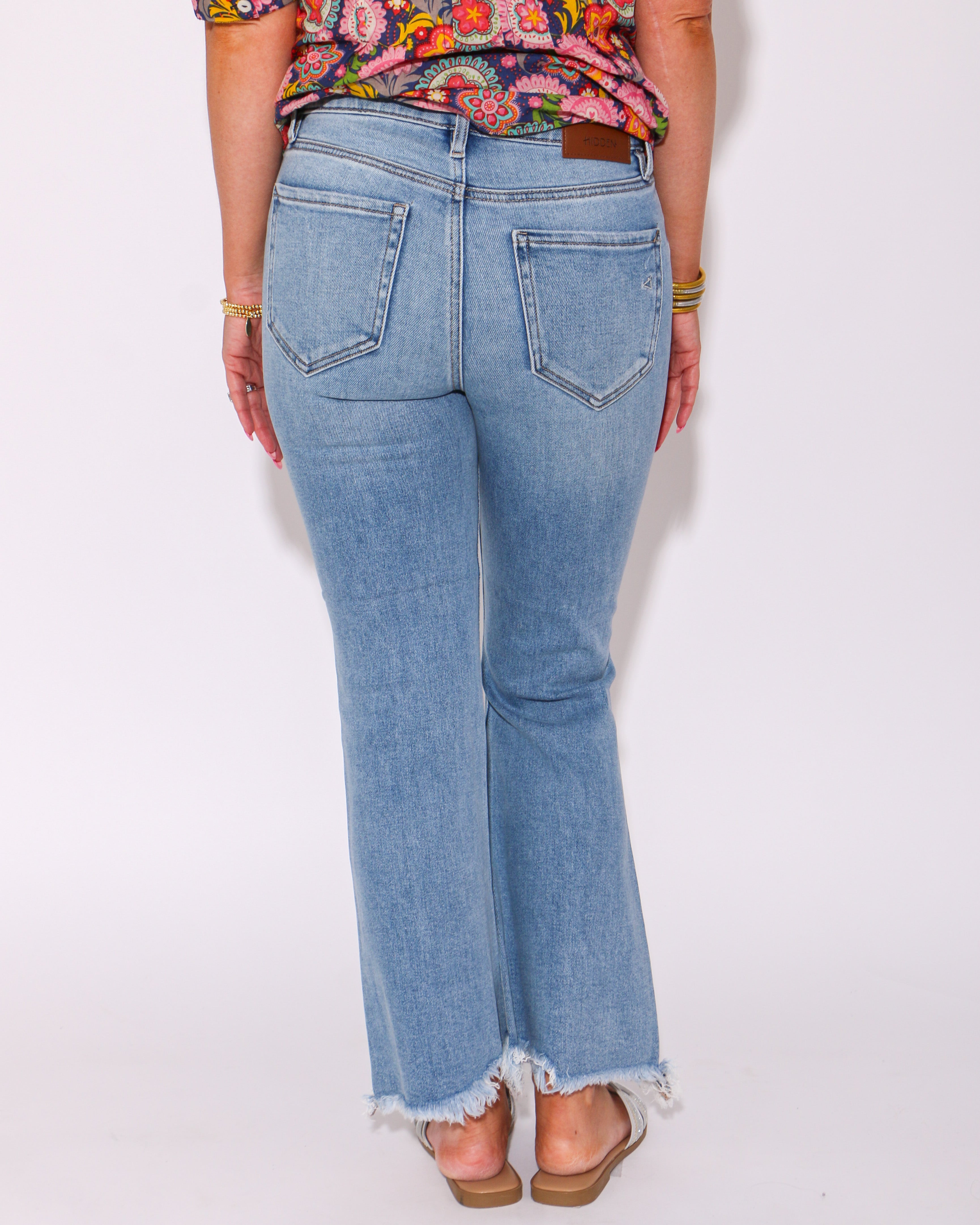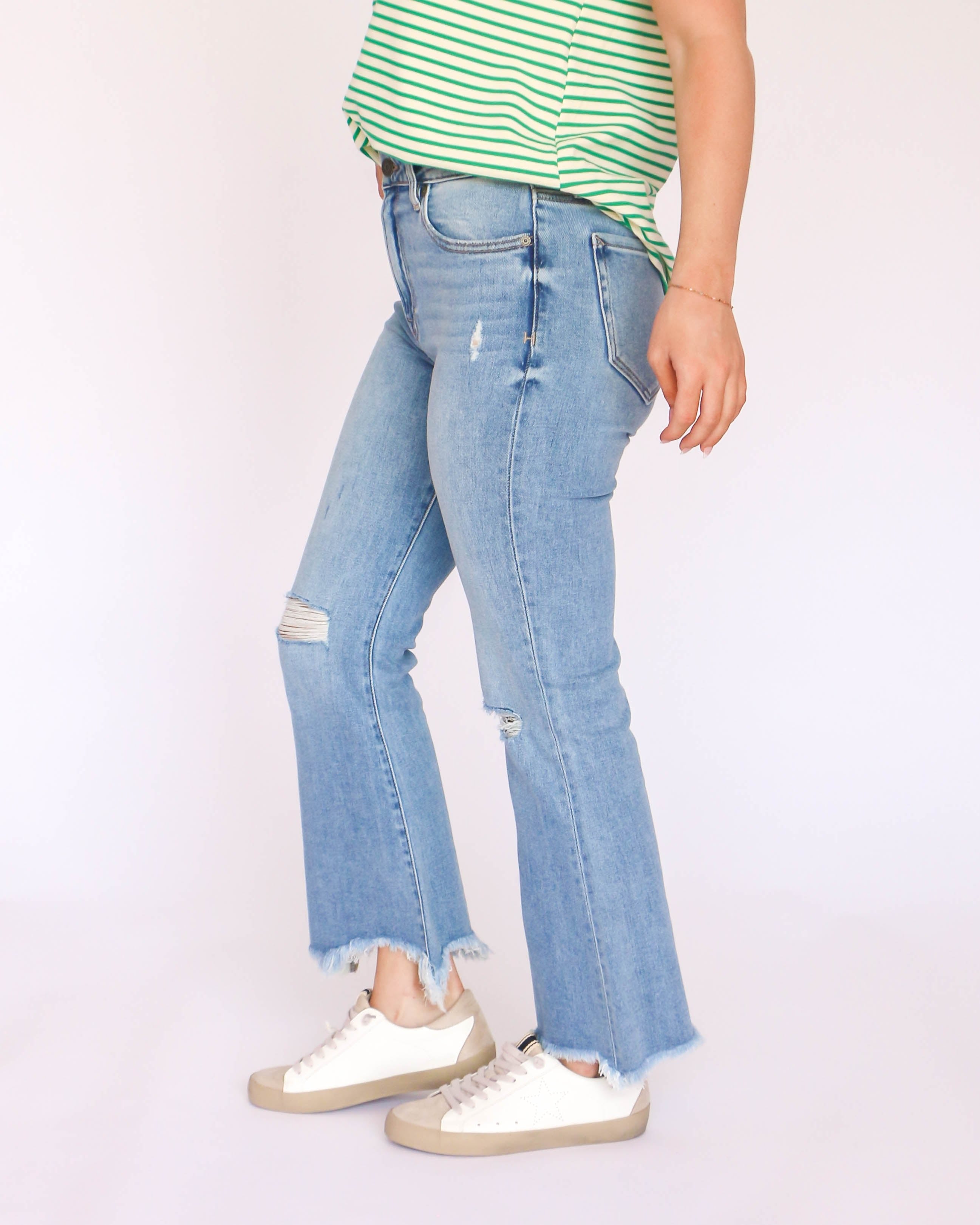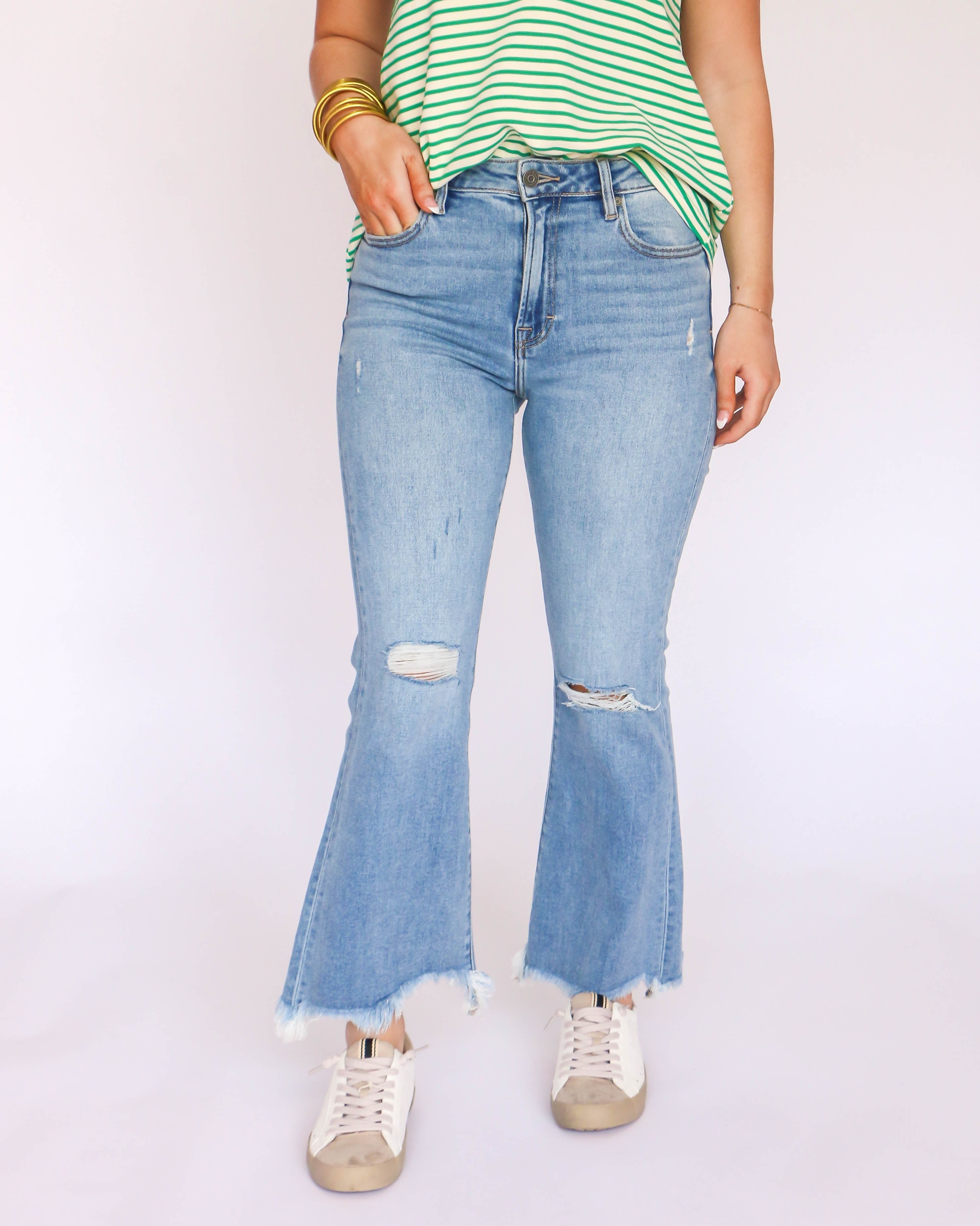Introducing the Happi High Rise Super Fray Crop Flare jeans, perfect for adding a touch of edge to your everyday wardrobe. The light wash distressed denim features a cropped frayed flare style, offering a modern yet timeless look. The high rise fit adds a flattering touch, accentuating your curves and elongating your legs. These jeans are made with comfort in mind, featuring a soft and stretchy fabric that moves with your body. Pair them with your favorite top and heels for a stylish night out, or dress them down with sneakers and a casual tee for a chic and comfortable daytime look.