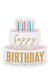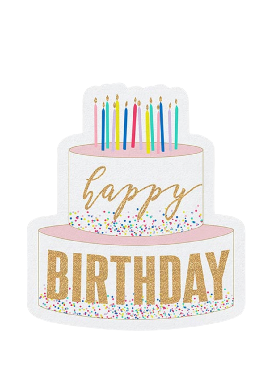 - Birthday Cake shaped napkin with colorful design and "happy birthday" in gold foil lettering
