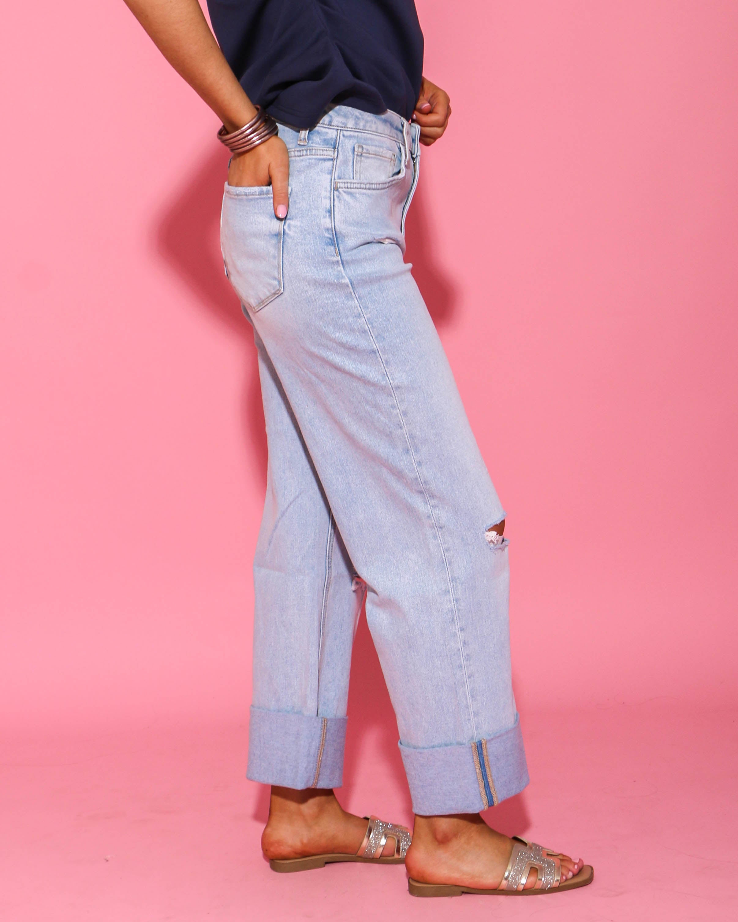Elevate your denim game with our Hey There High Rise Cuffed Jeans in Light. These jeans feature comfort stretch denim for a perfect fit, a super high rise waist for a flattering silhouette, and distressed detail for a touch of edge. The double cuff hem adds an extra stylish touch to these cropped, baggy wide leg jeans.