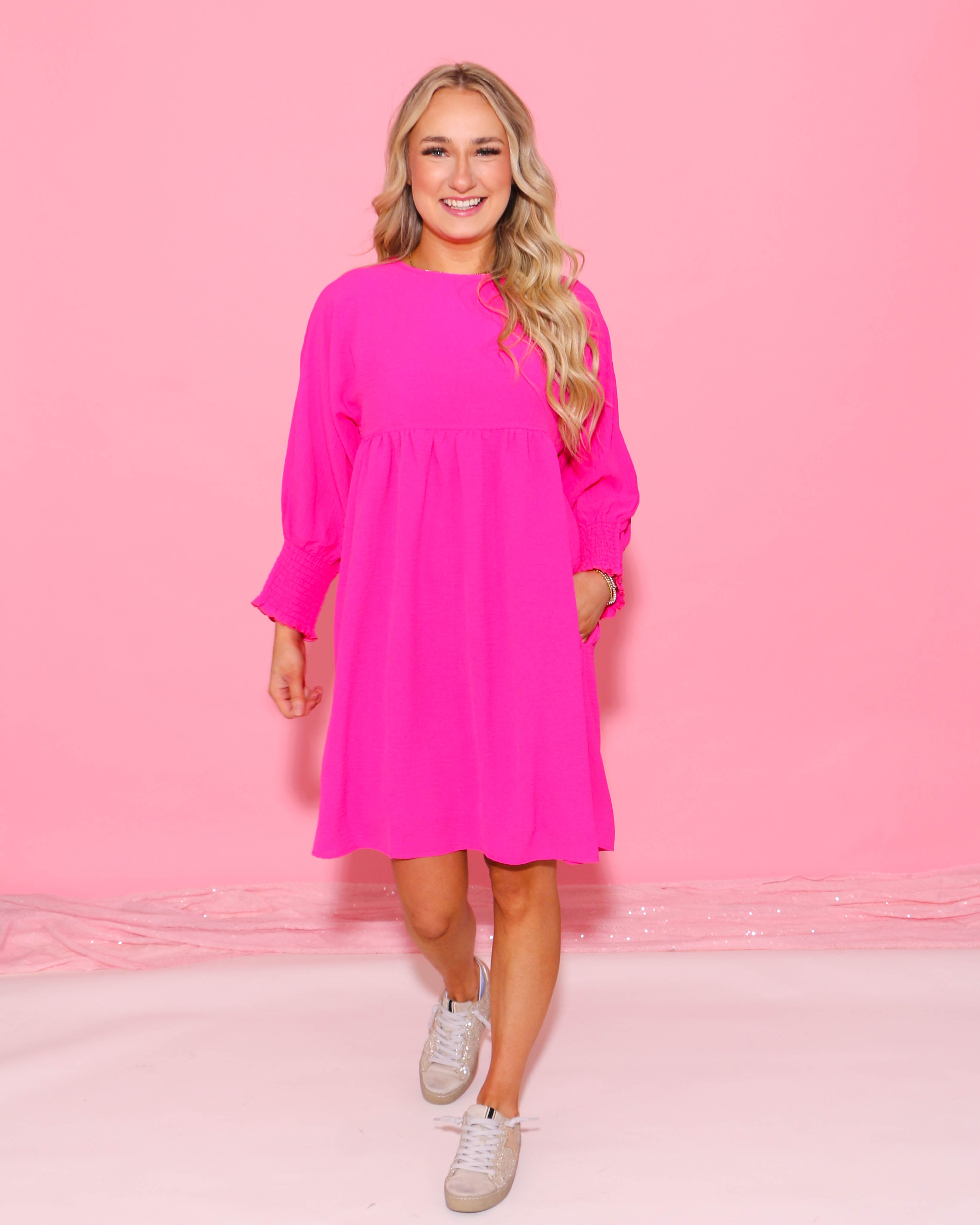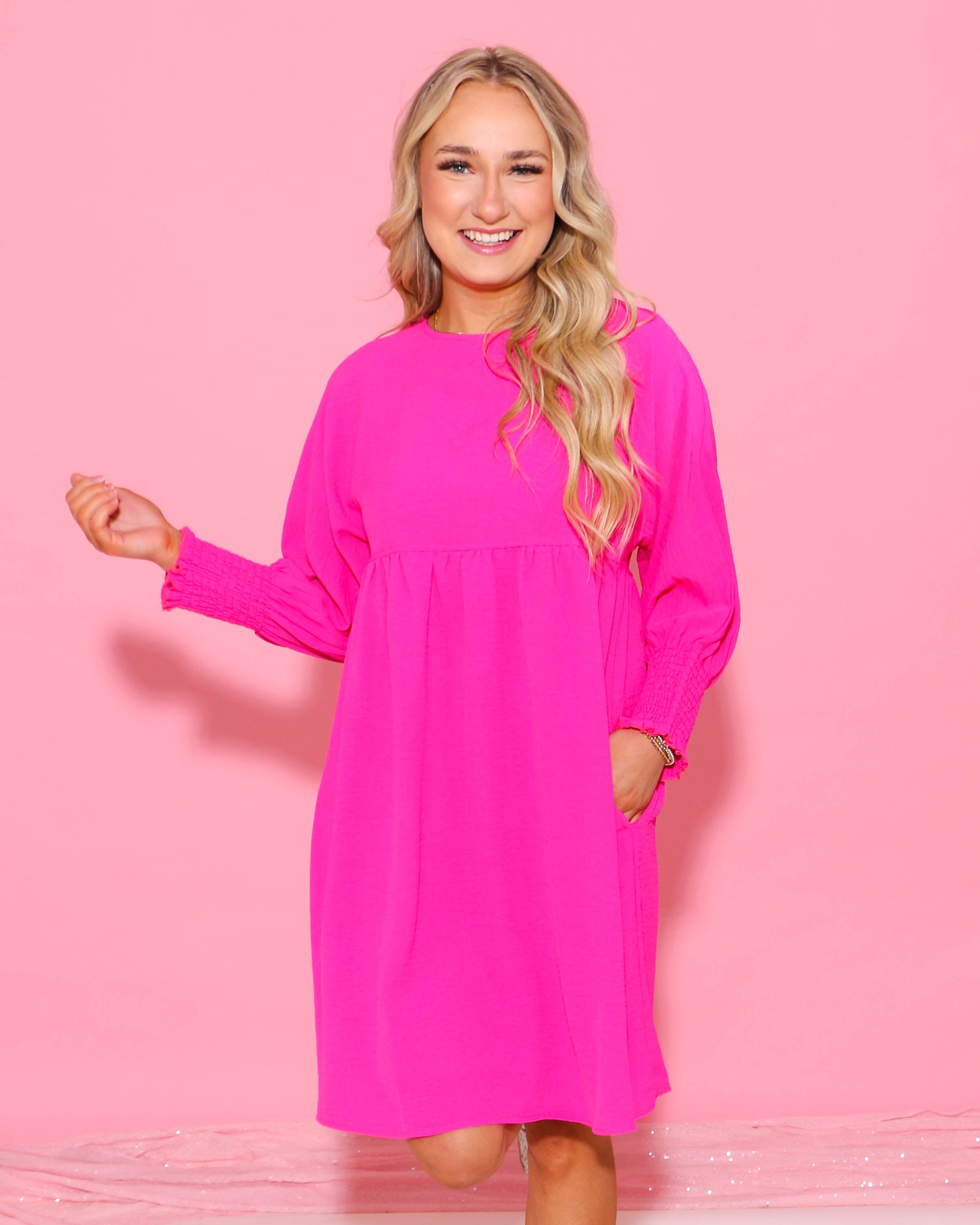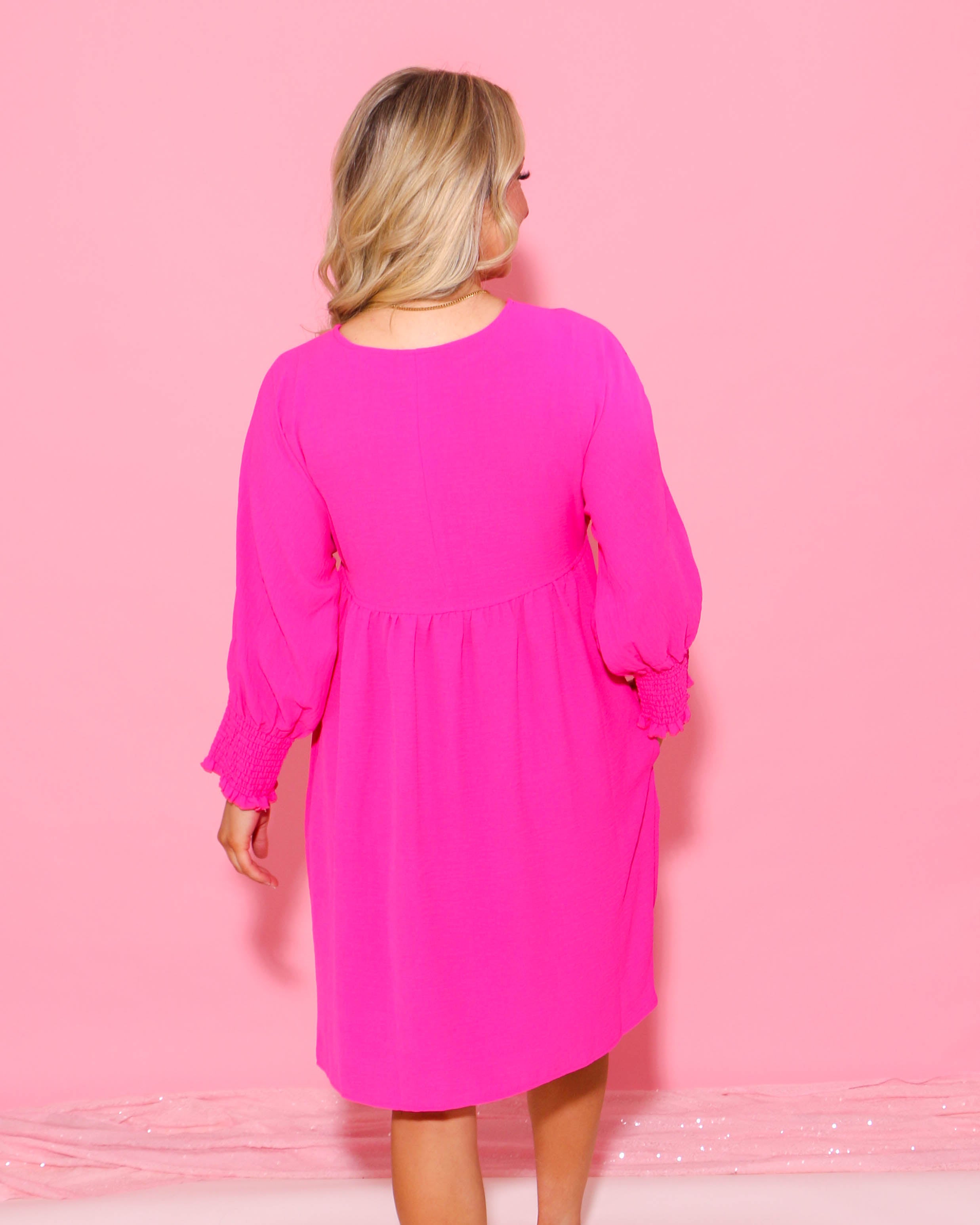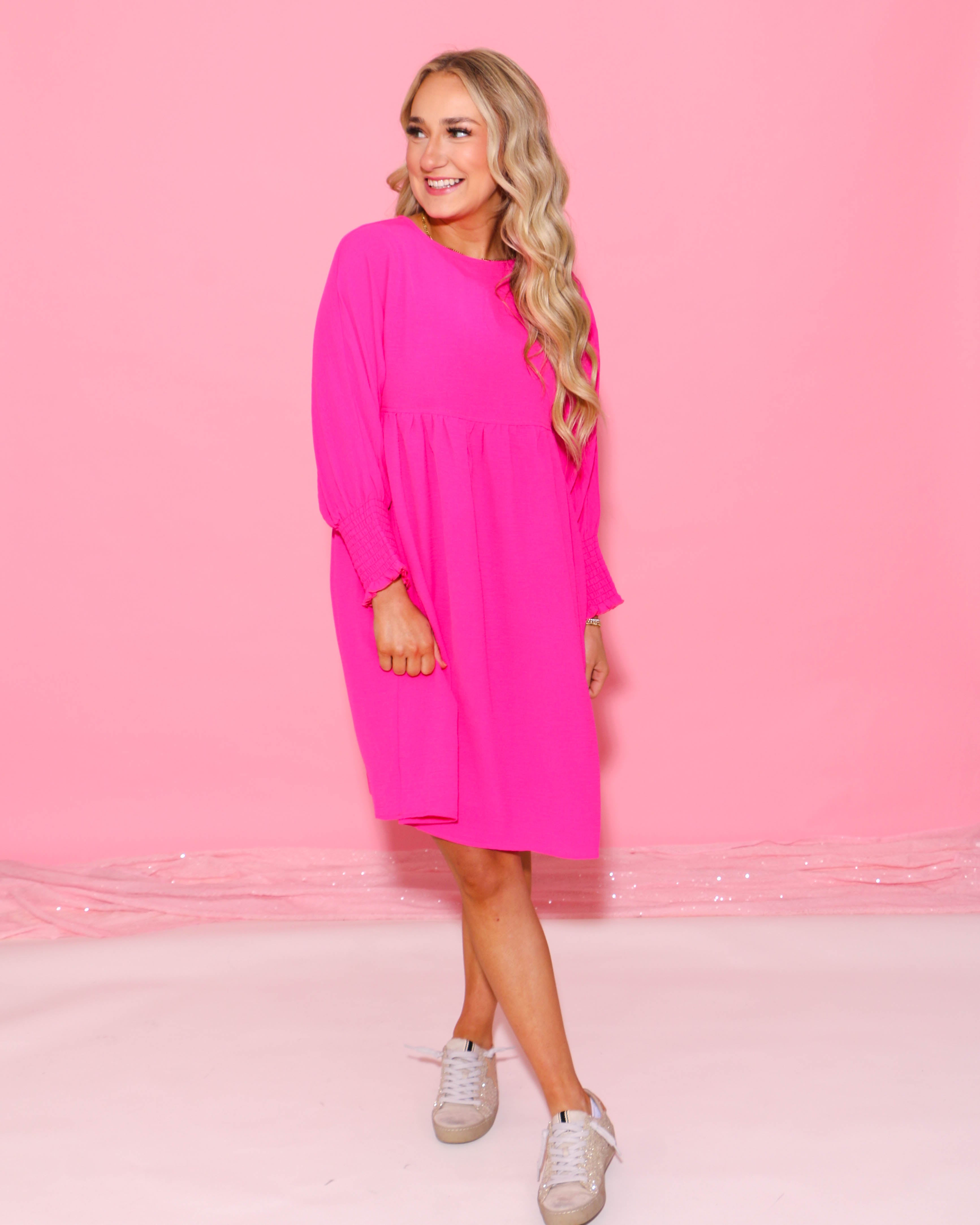 Experience the bold and confident style of our Hot Pink Shirred Sleeve Dress! The vibrant color and shirred sleeves add a touch of flair to any outfit. Elevate your wardrobe with this must-have dress that exudes energy and passion.