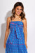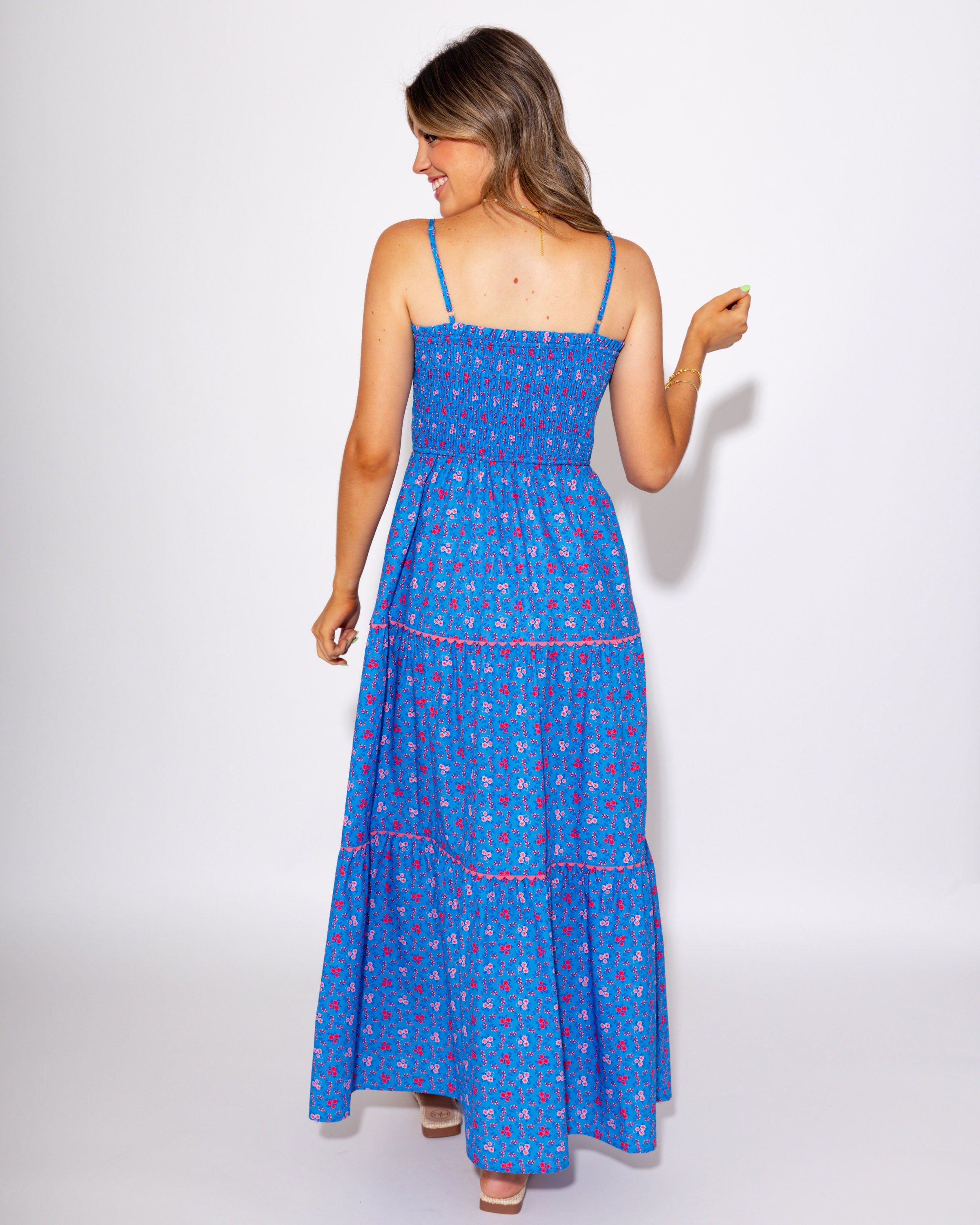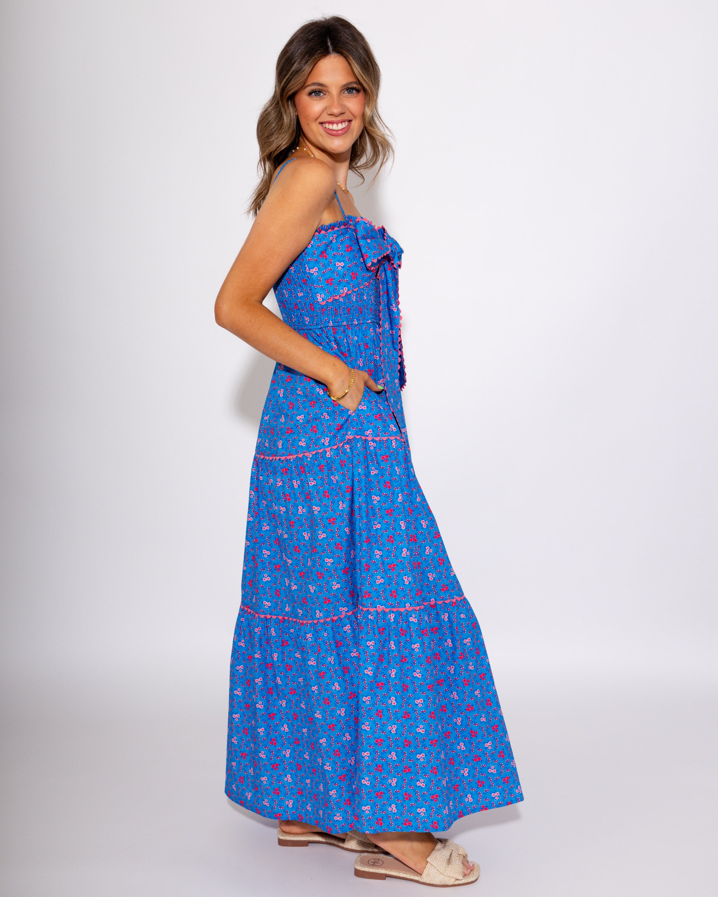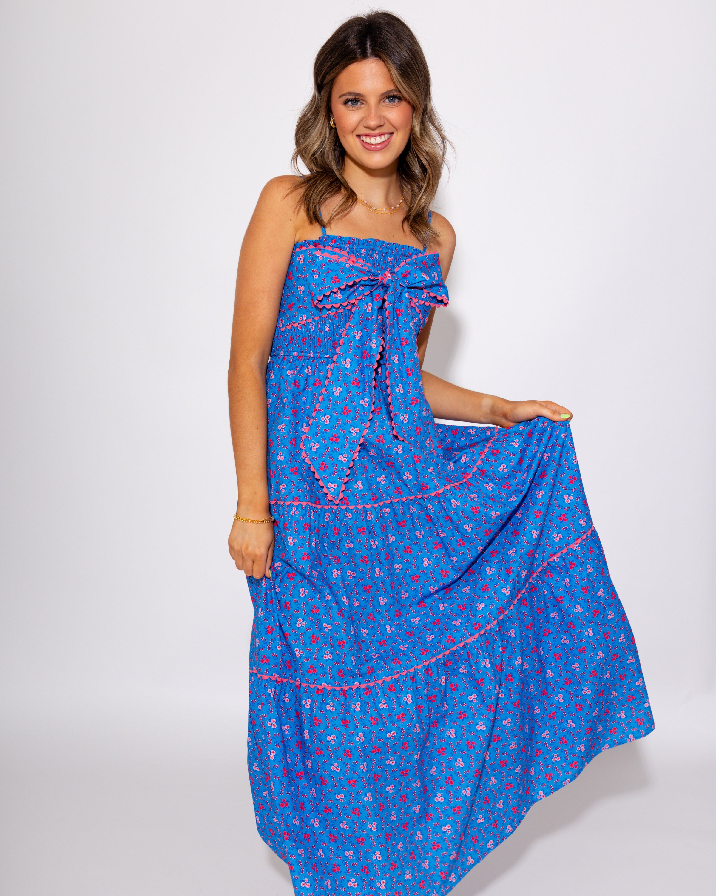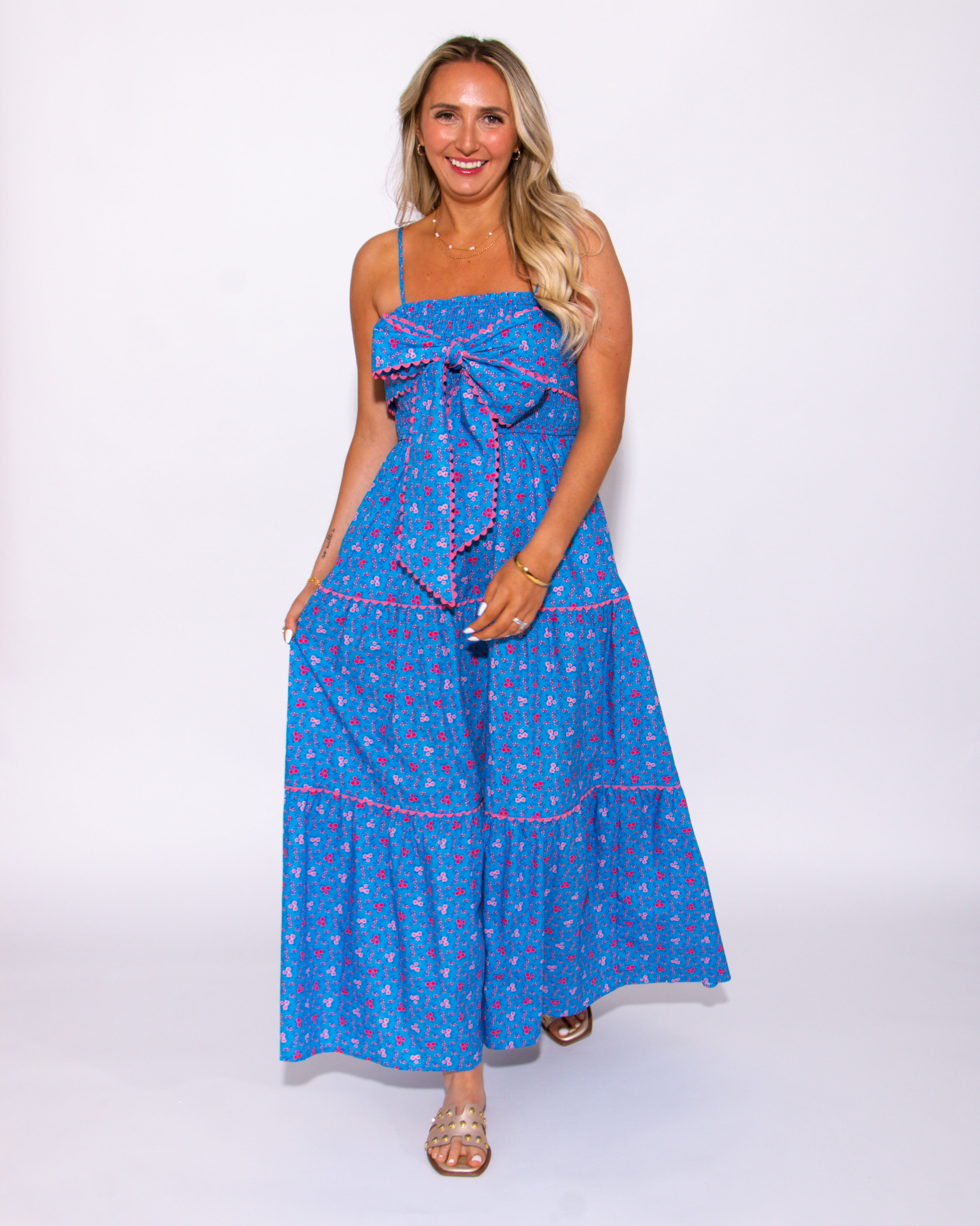 Turn heads in our bright blue tiered maxi dress, designed for your most memorable summer moments. A statement-worthy oversized bow sits front and center across the bust, covered in dainty pink flowers, while delicate spaghetti straps and playful ricrac trim add a charming, feminine finish. The breezy tiered skirt brings effortless movement—perfect for everything from beachside dinners to garden parties.