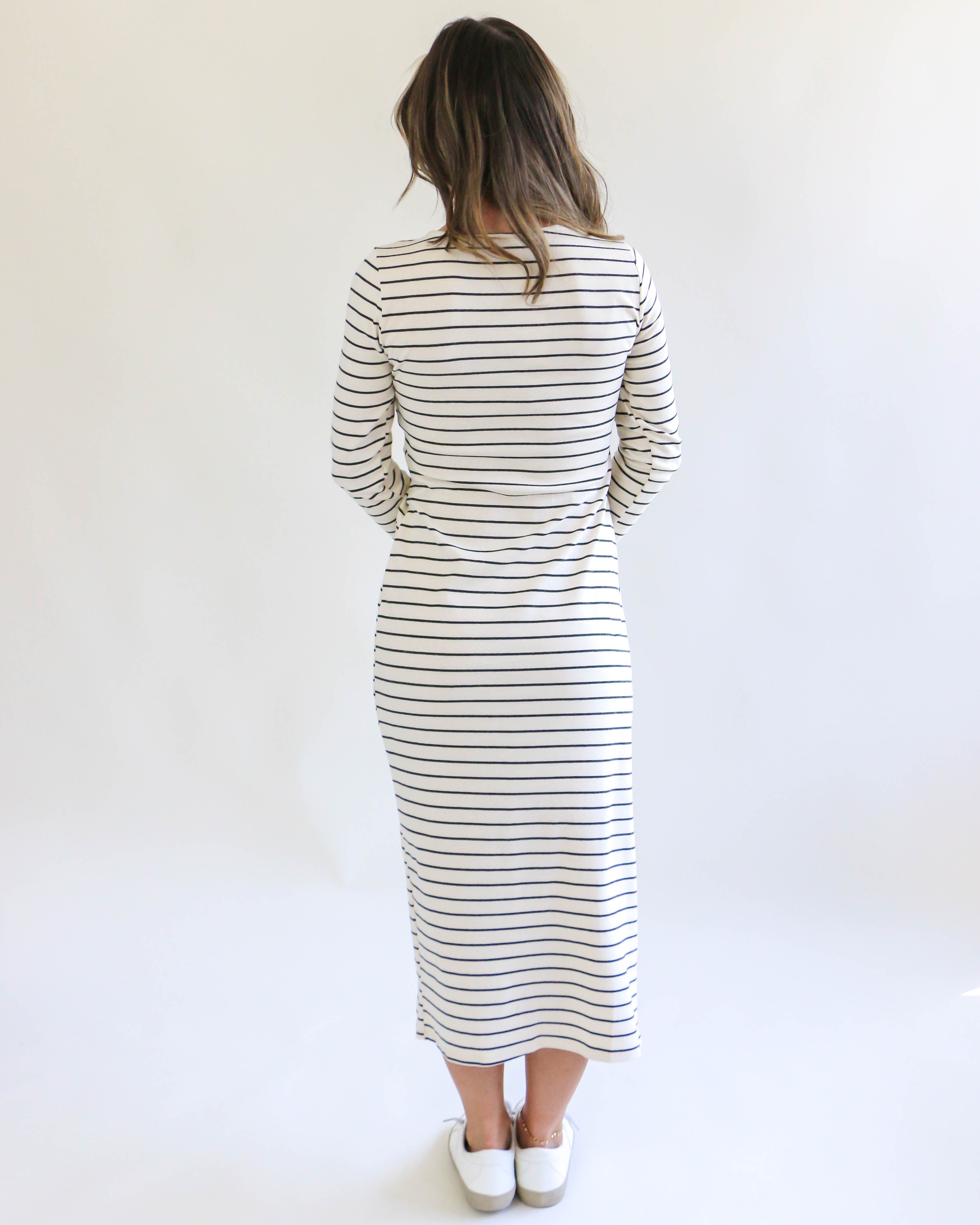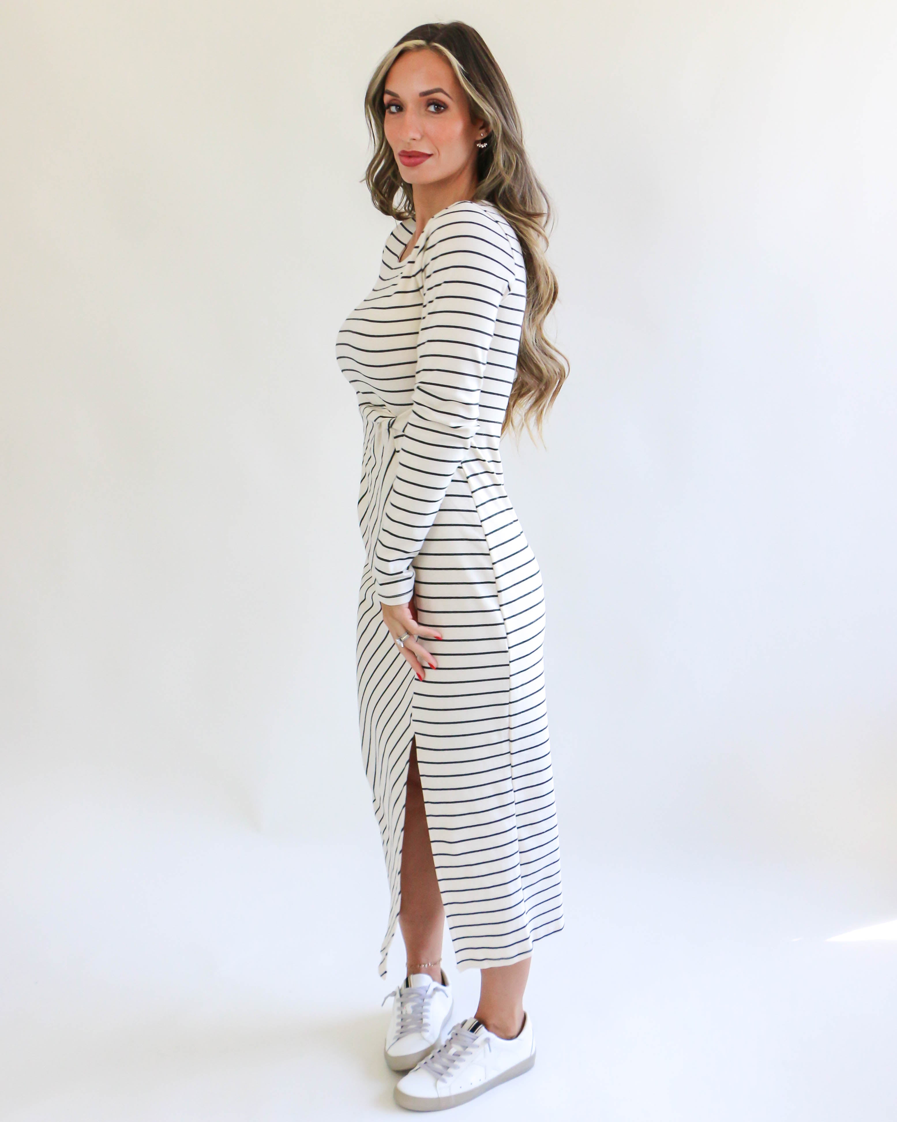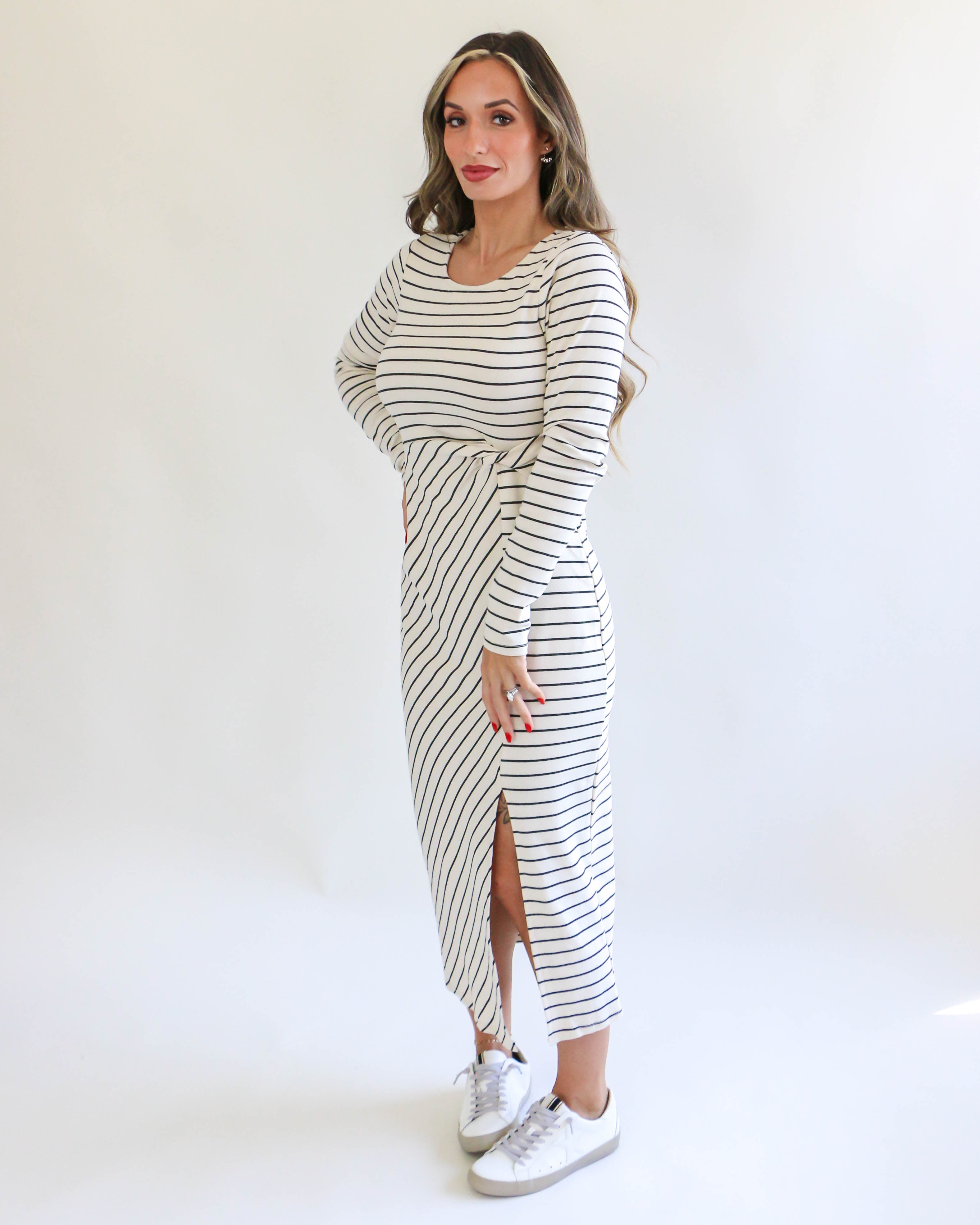 Long Sleeve Waist Twist Side Slit Stripe Maxi