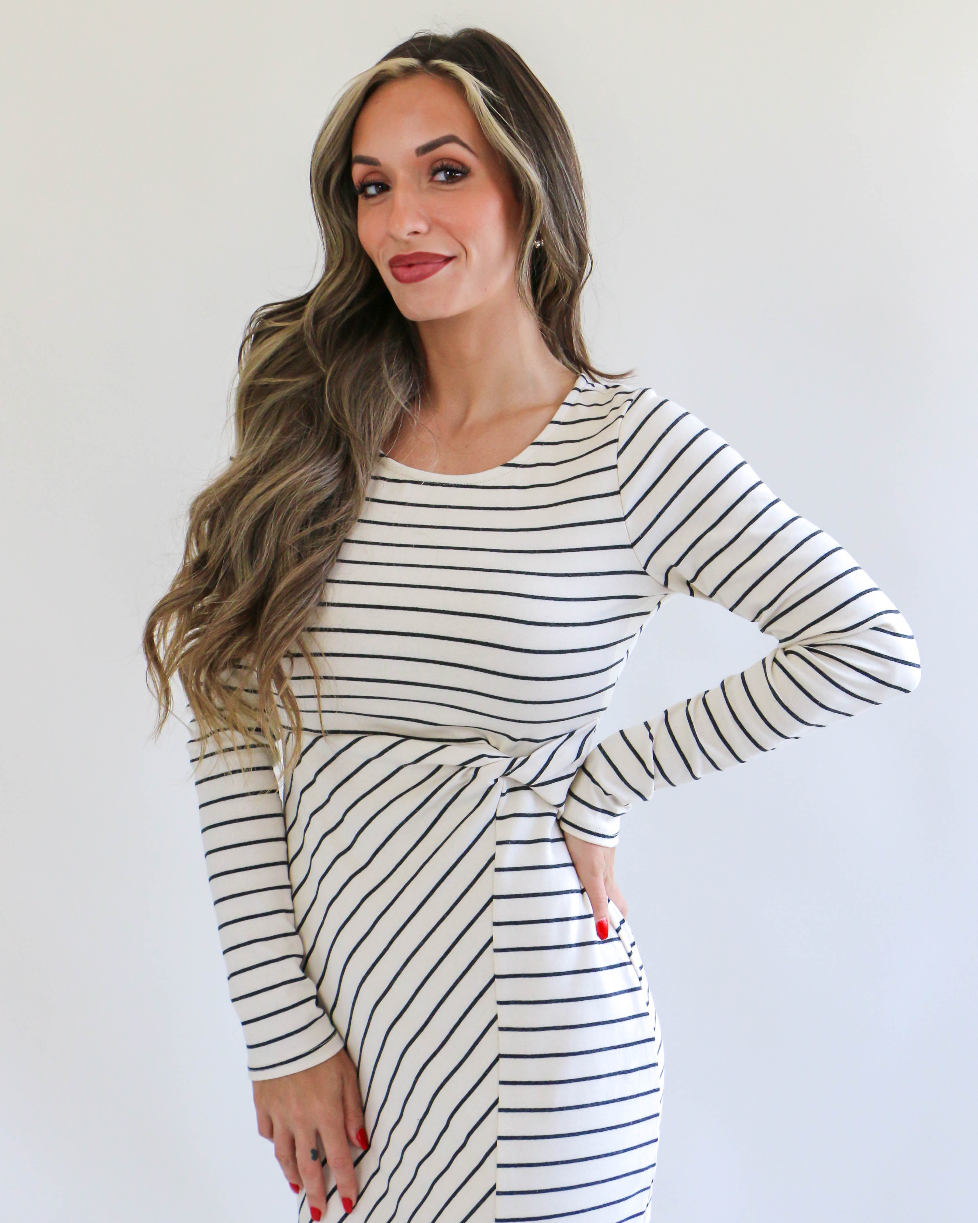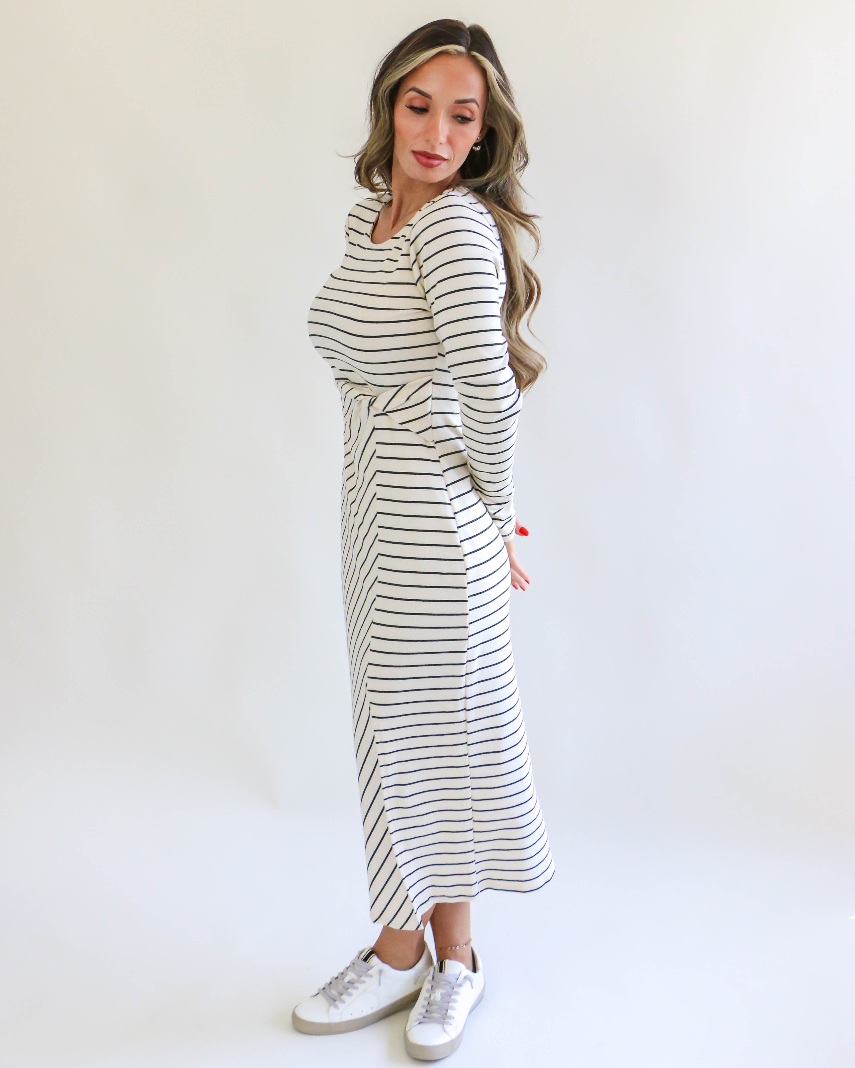 Elevate your style with our Long Sleeve Waist Twist Side Slit Stripe Maxi Dress. This effortlessly chic dress features a flattering waist twist detail that accentuates your curves, while the side slit adds a touch of modern allure. The classic stripe pattern and flowing maxi length ensure a graceful silhouette, perfect for both casual outings and special occasions. Made from a comfortable, stretchy fabric, this dress promises both elegance and ease. Pair with your favorite heels or sandals for a look that’s as versatile as it is stunning.