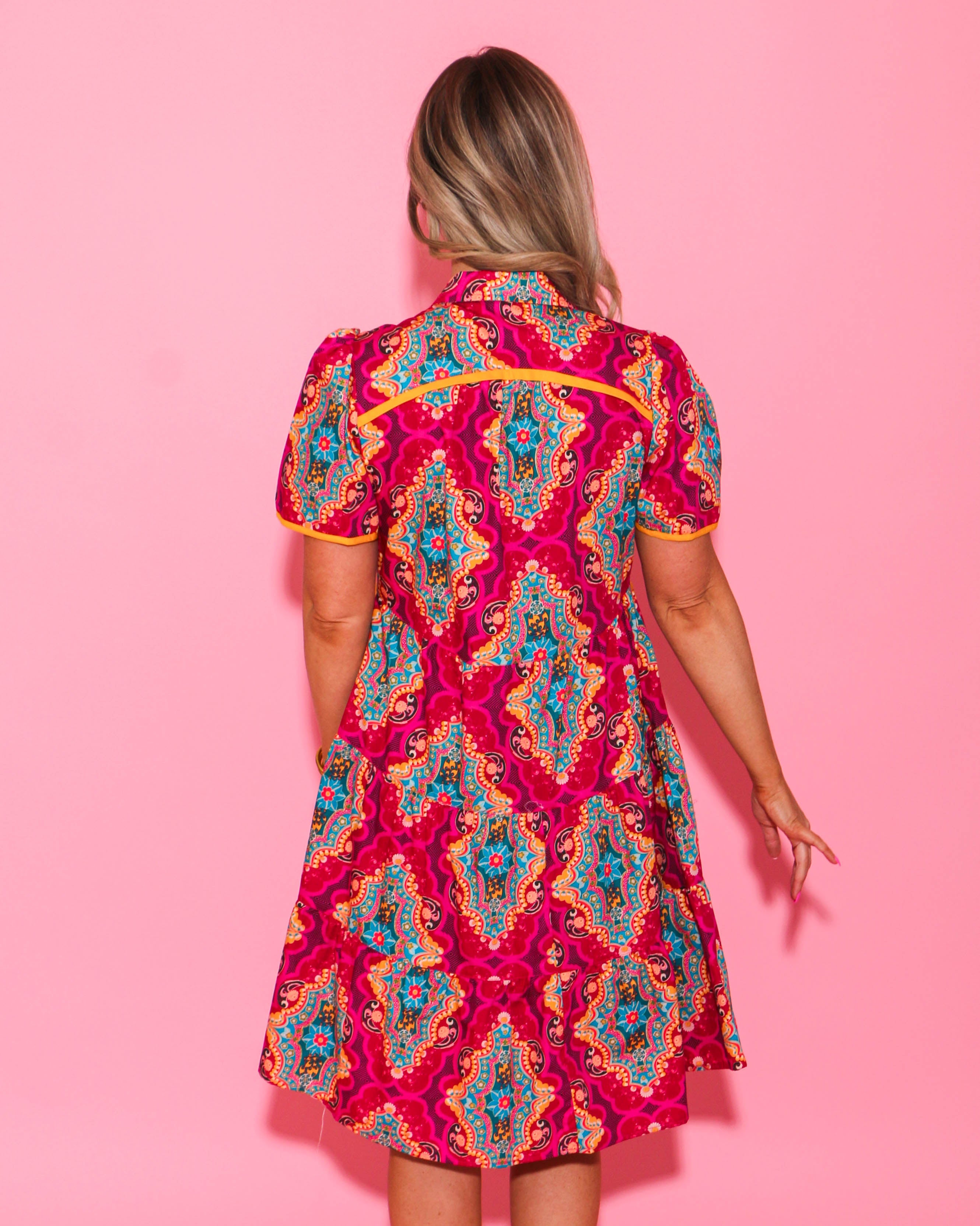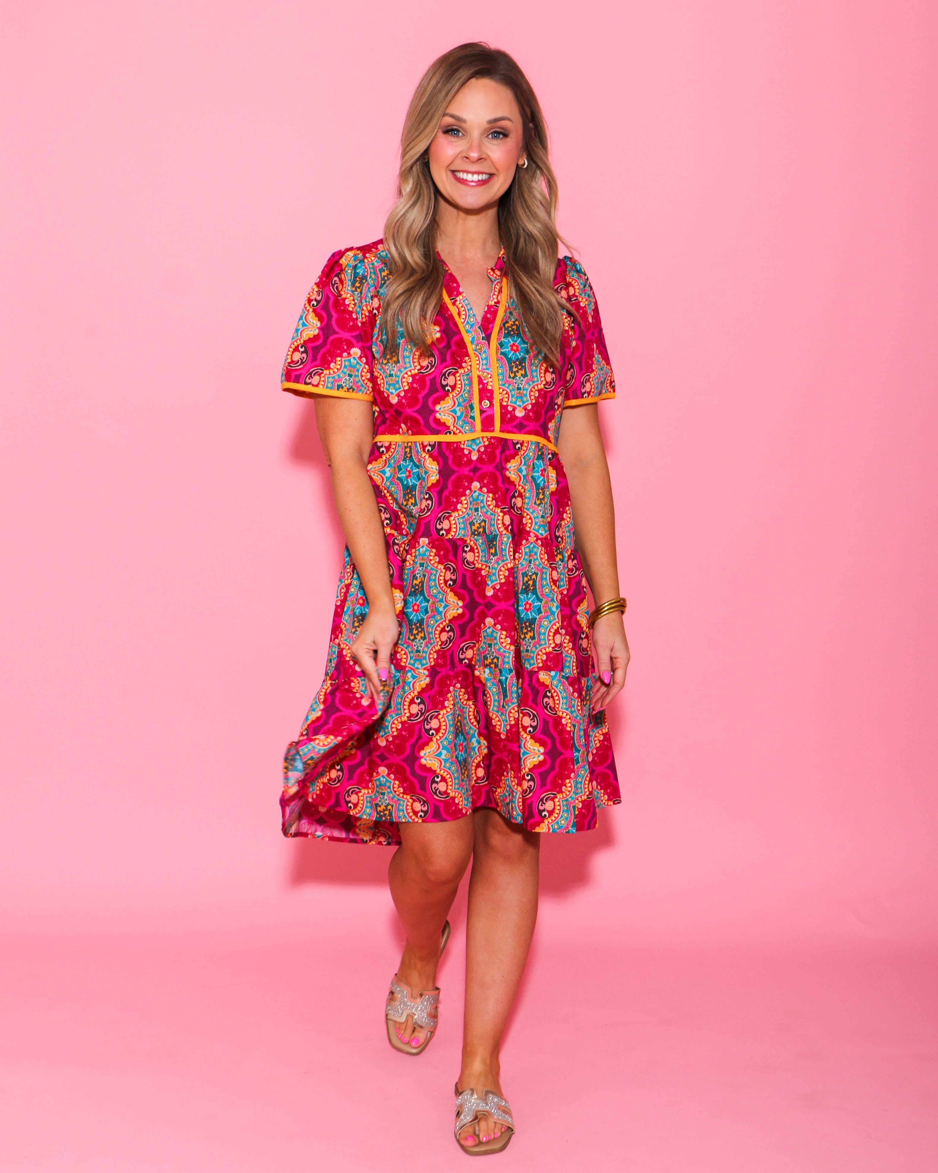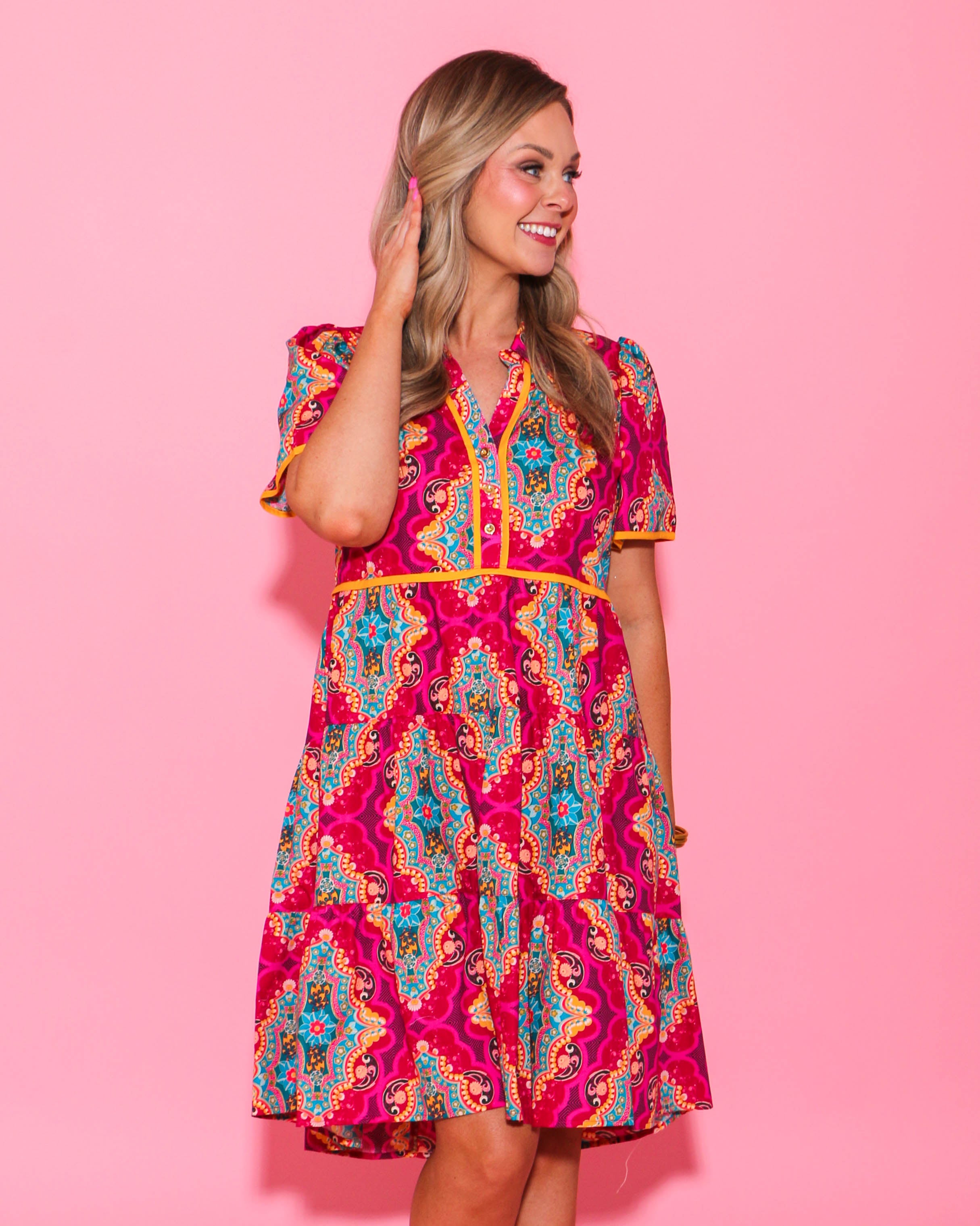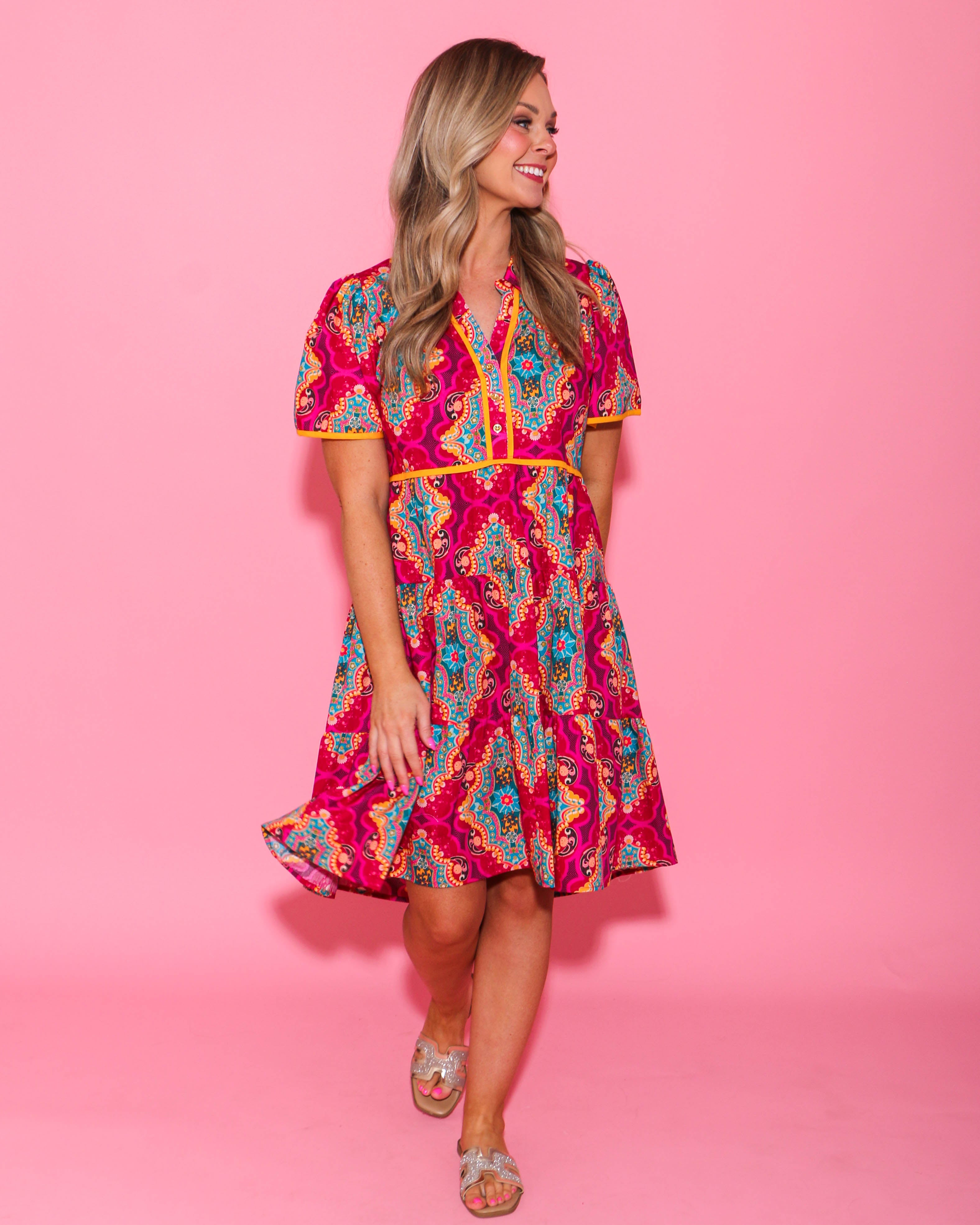 Fall in love with our gorgeous Medallion Tiered Dress in Cherry! This dress features a stunning medallion pattern and a flattering tiered design. Perfect for any occasion, this dress will make you feel beautiful and confident. Elevate your wardrobe and turn heads with this must-have piece.
