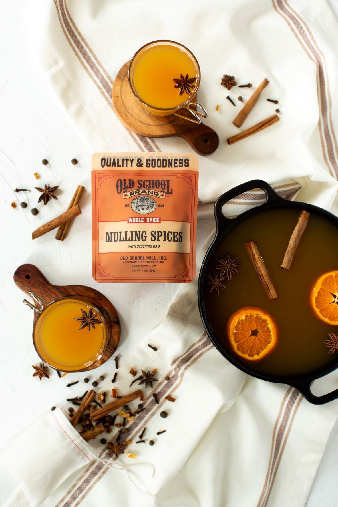 Unlike the sugar filled mulling spices in other stores, our Mulling Spice Packet is pure and natural. Whole spices–cinnamon sticks, allspice, cloves, anise stars–come together with orange rind to make a perfect blend. Drop the spices into the cloth sack (included) then slide the sack into your simmering pot of…brandy, cider, wine…you choose.