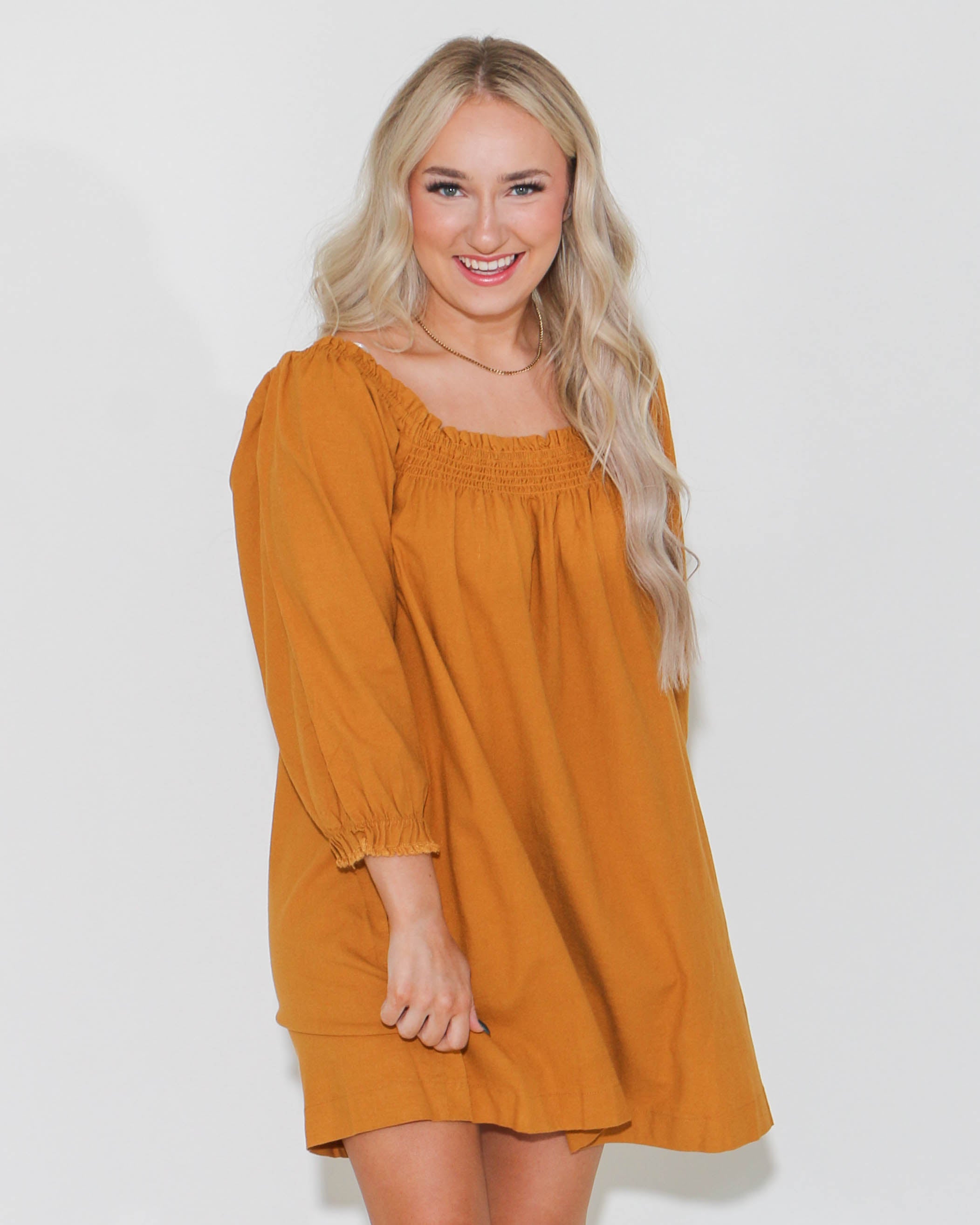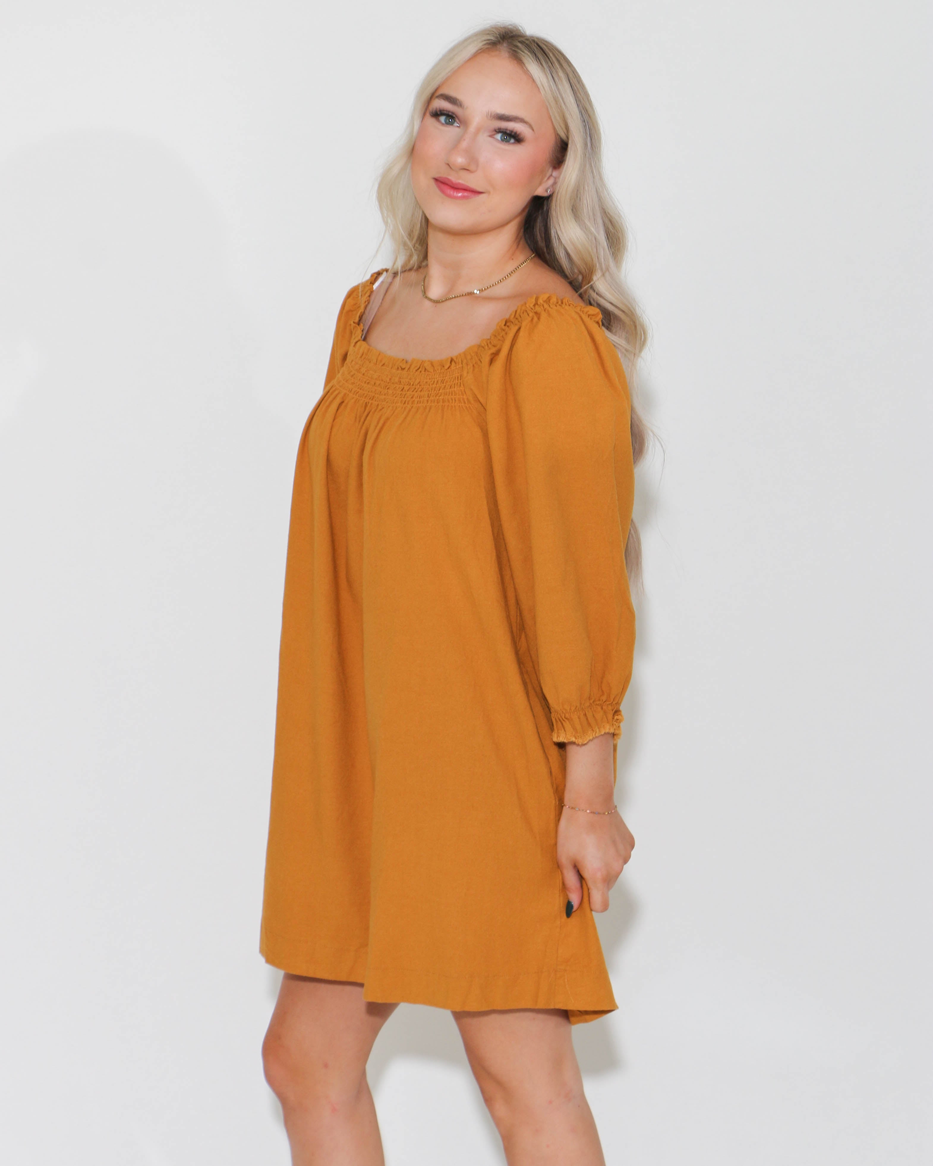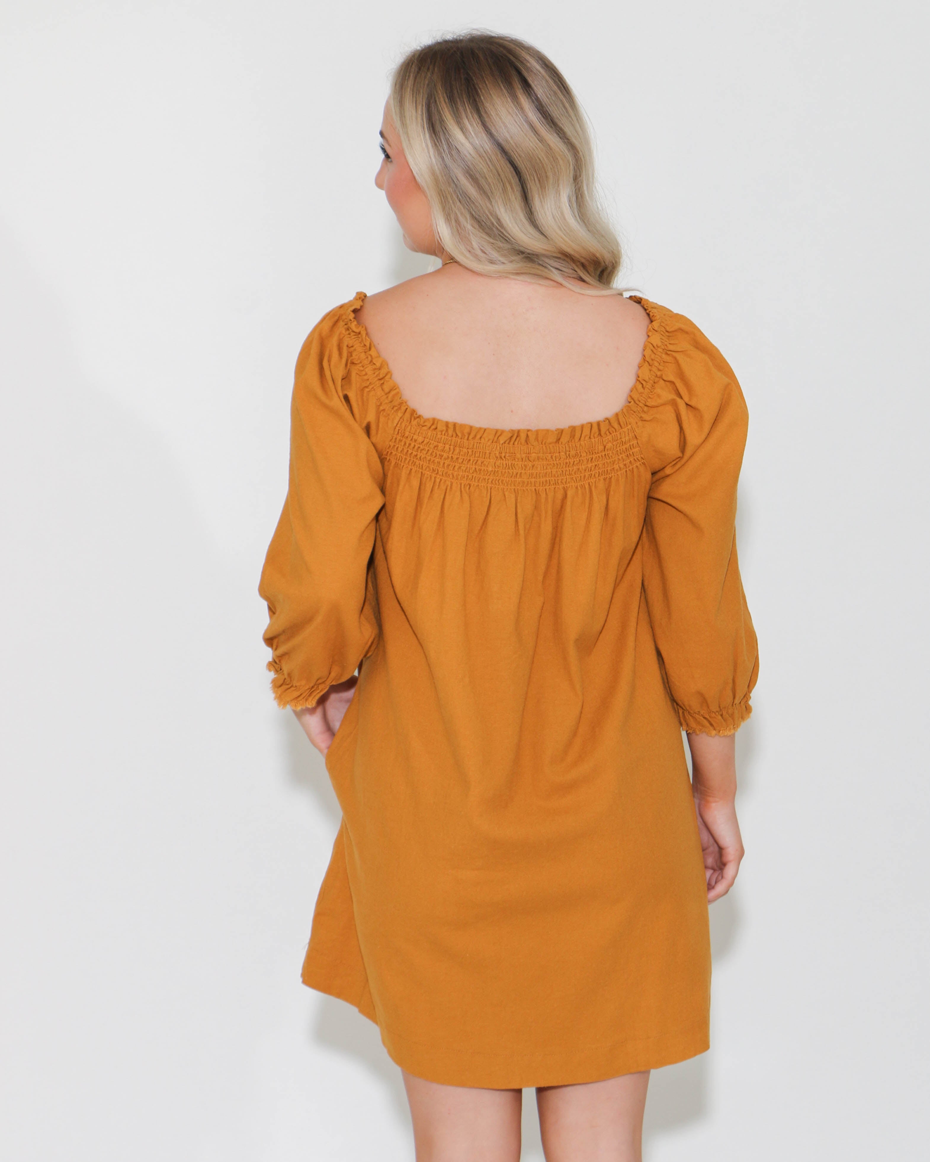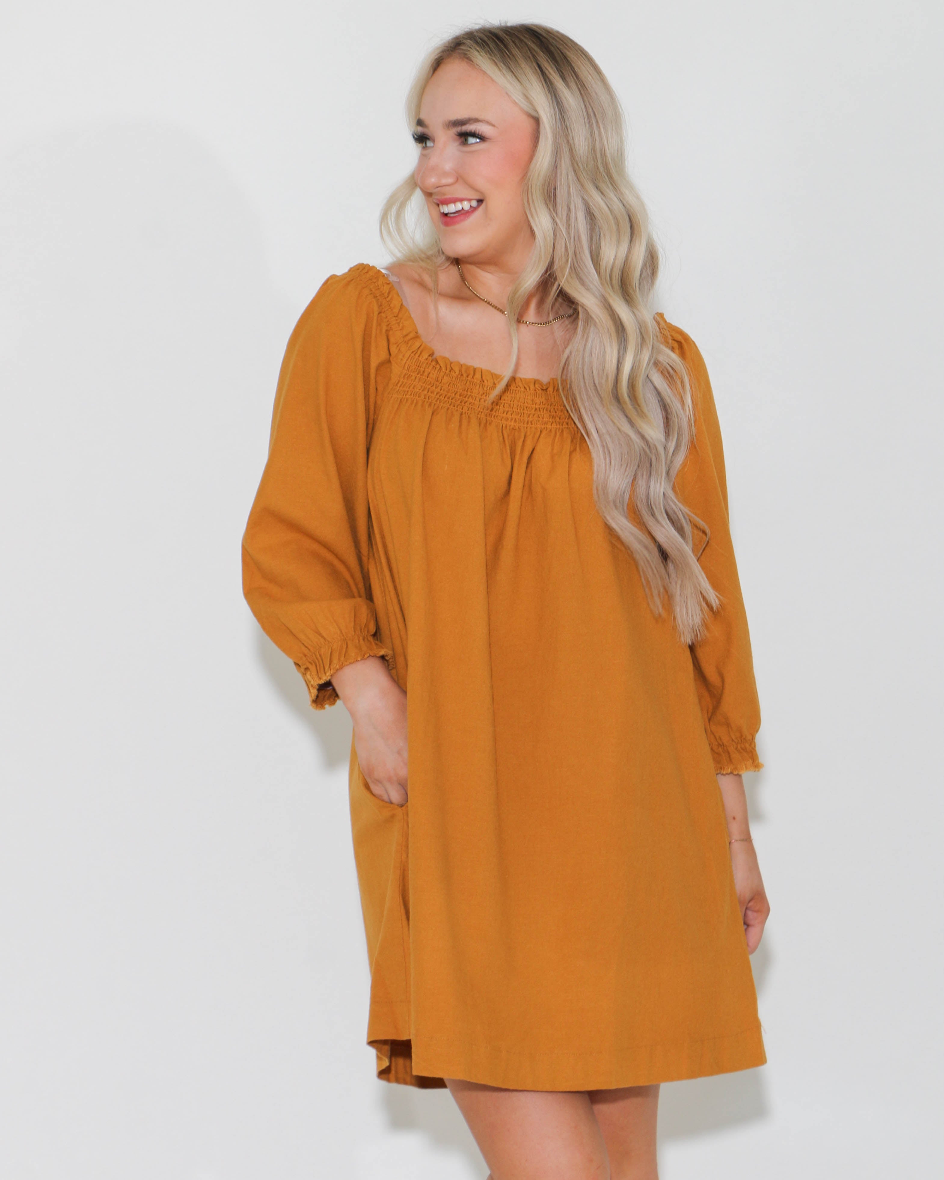 Transform your wardrobe with our Mustard Tunic Dress. This versatile dress features a ruched neckline that can be worn on or off the shoulder, as well as convenient side pockets. Made with a blend of linen, viscose, and spandex, our dress offers comfortable and stylish wear for any occasion. Available in multiple sizes and modeled on a 5'4" frame, this dress is a must-have for any fashion-forward individual.