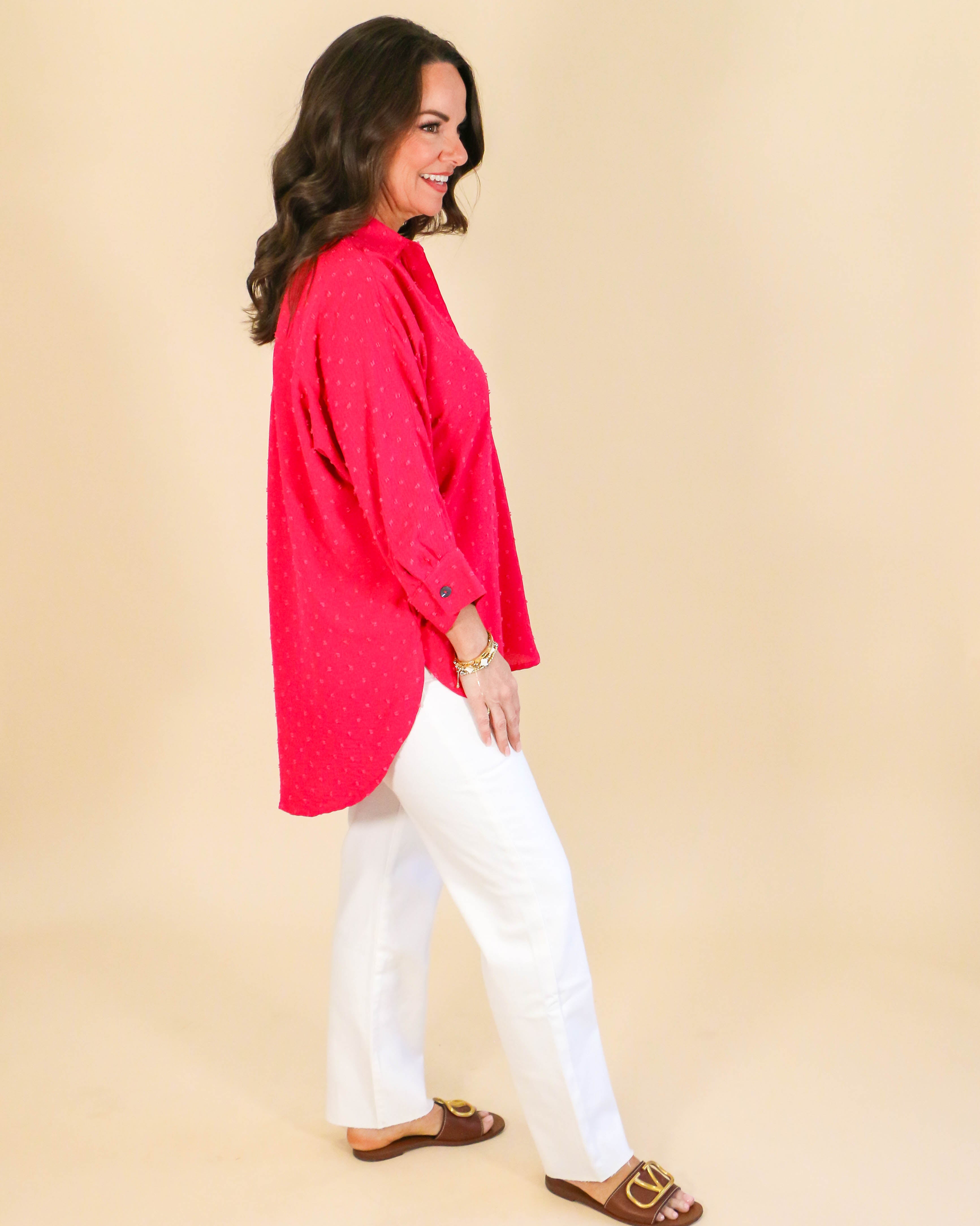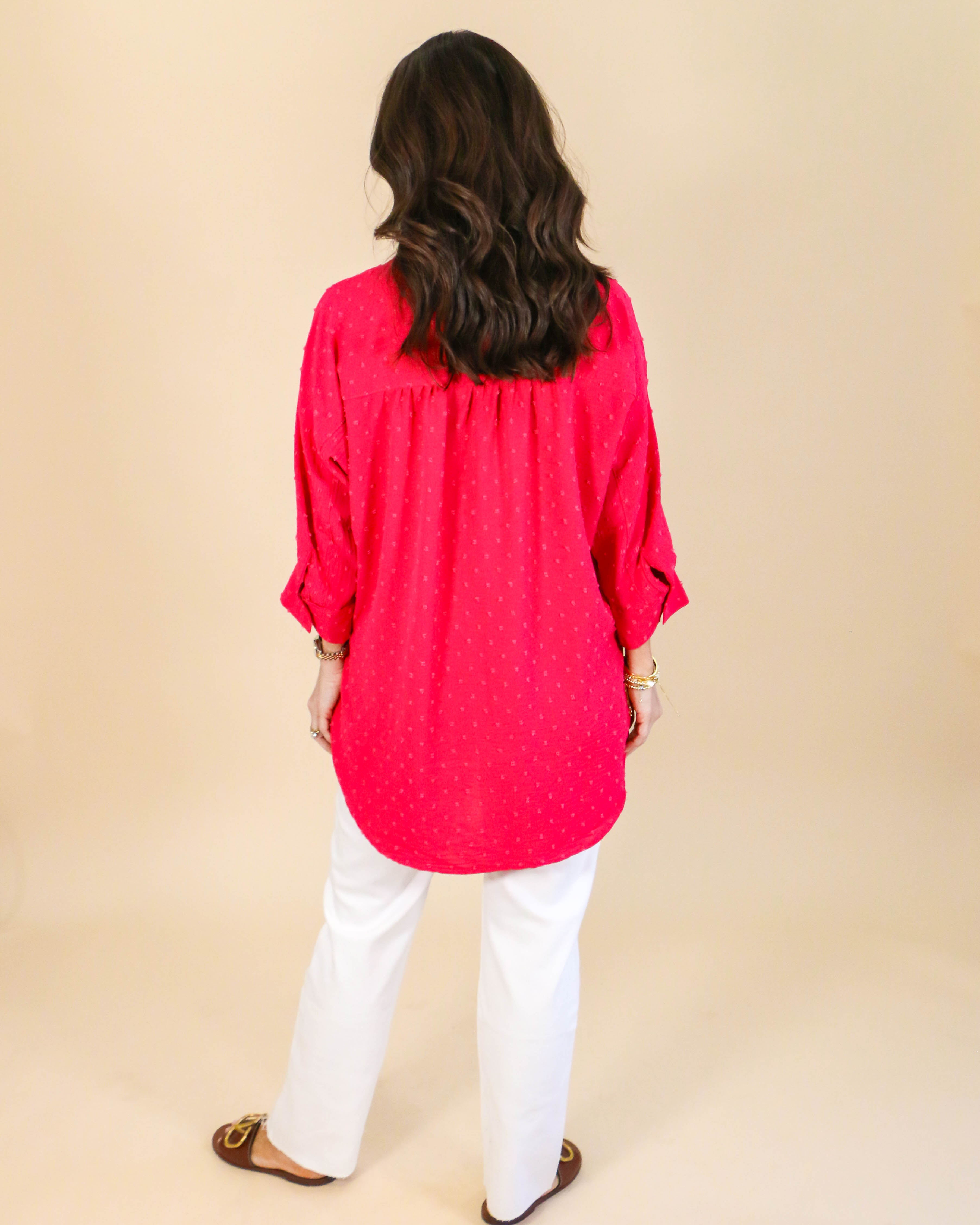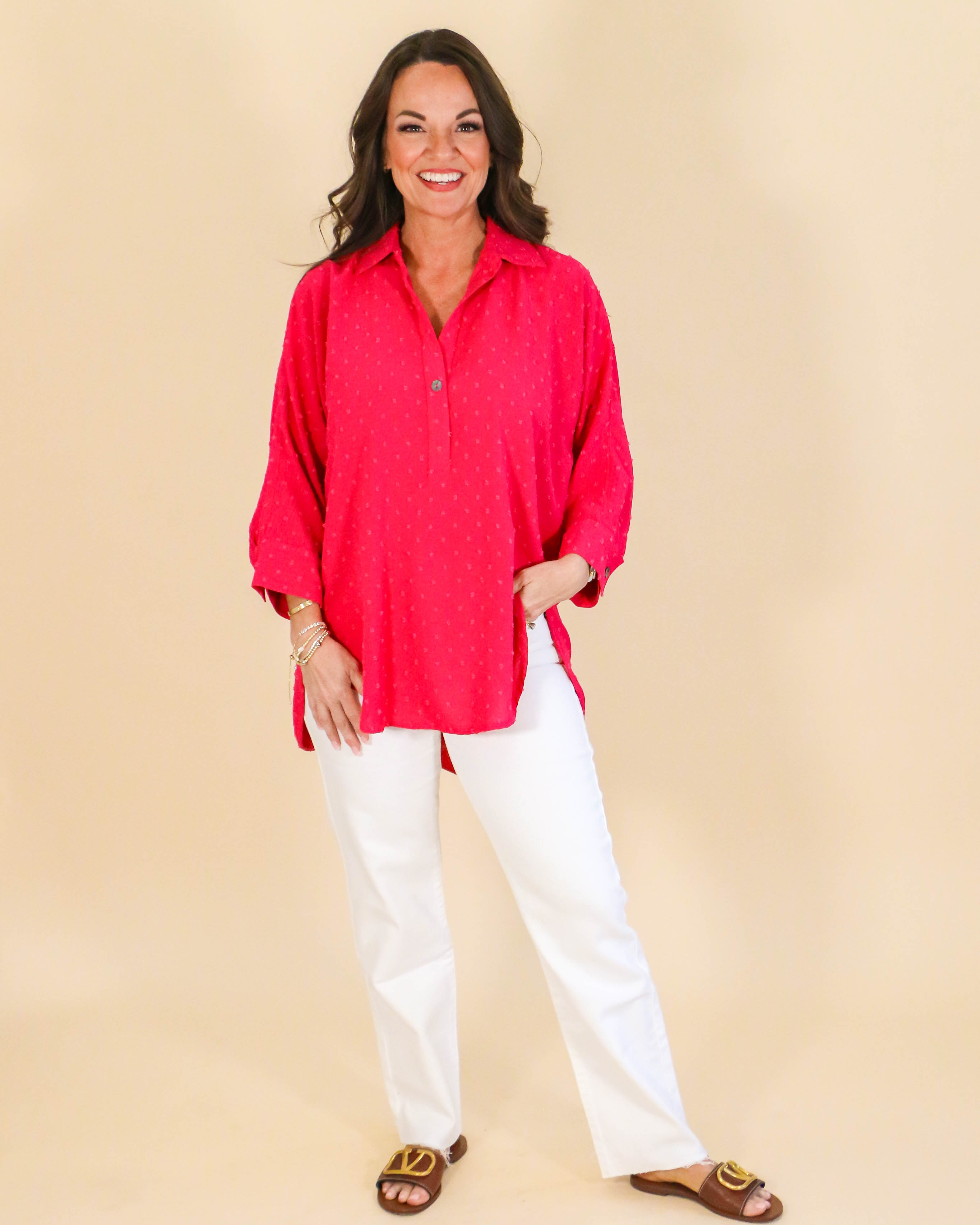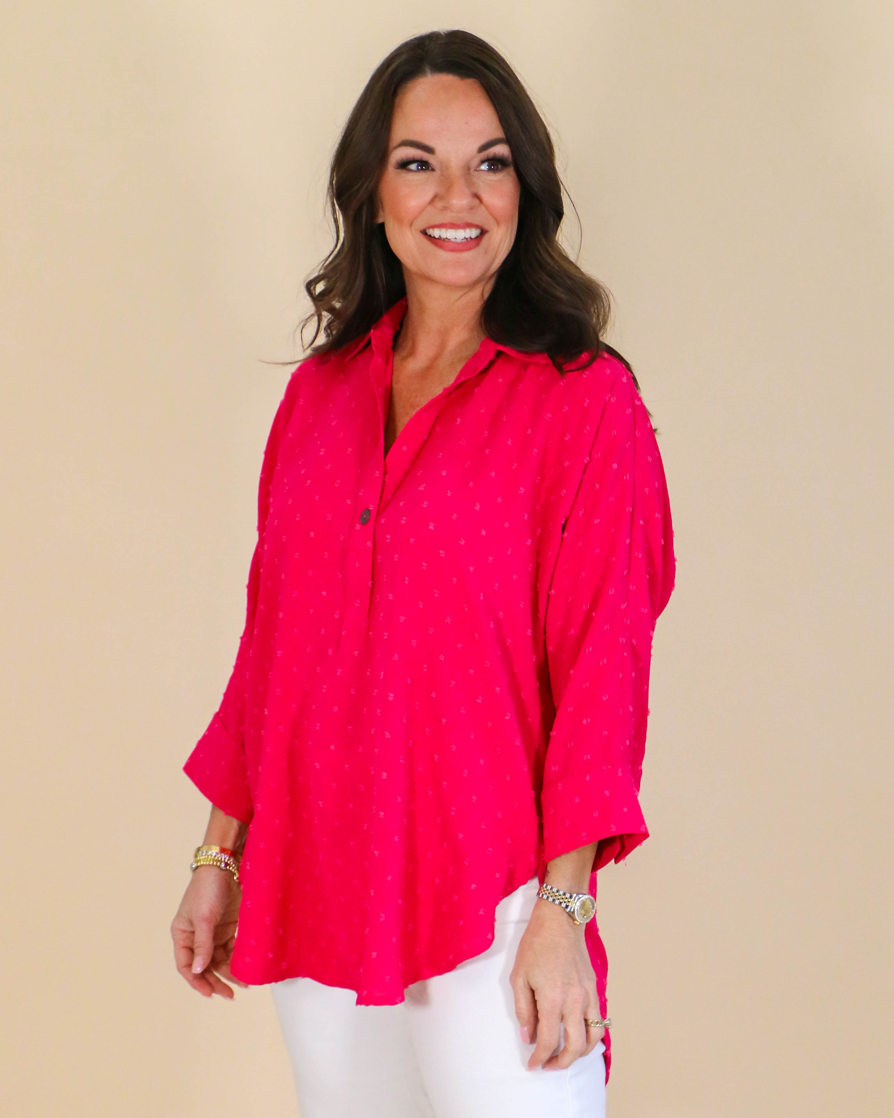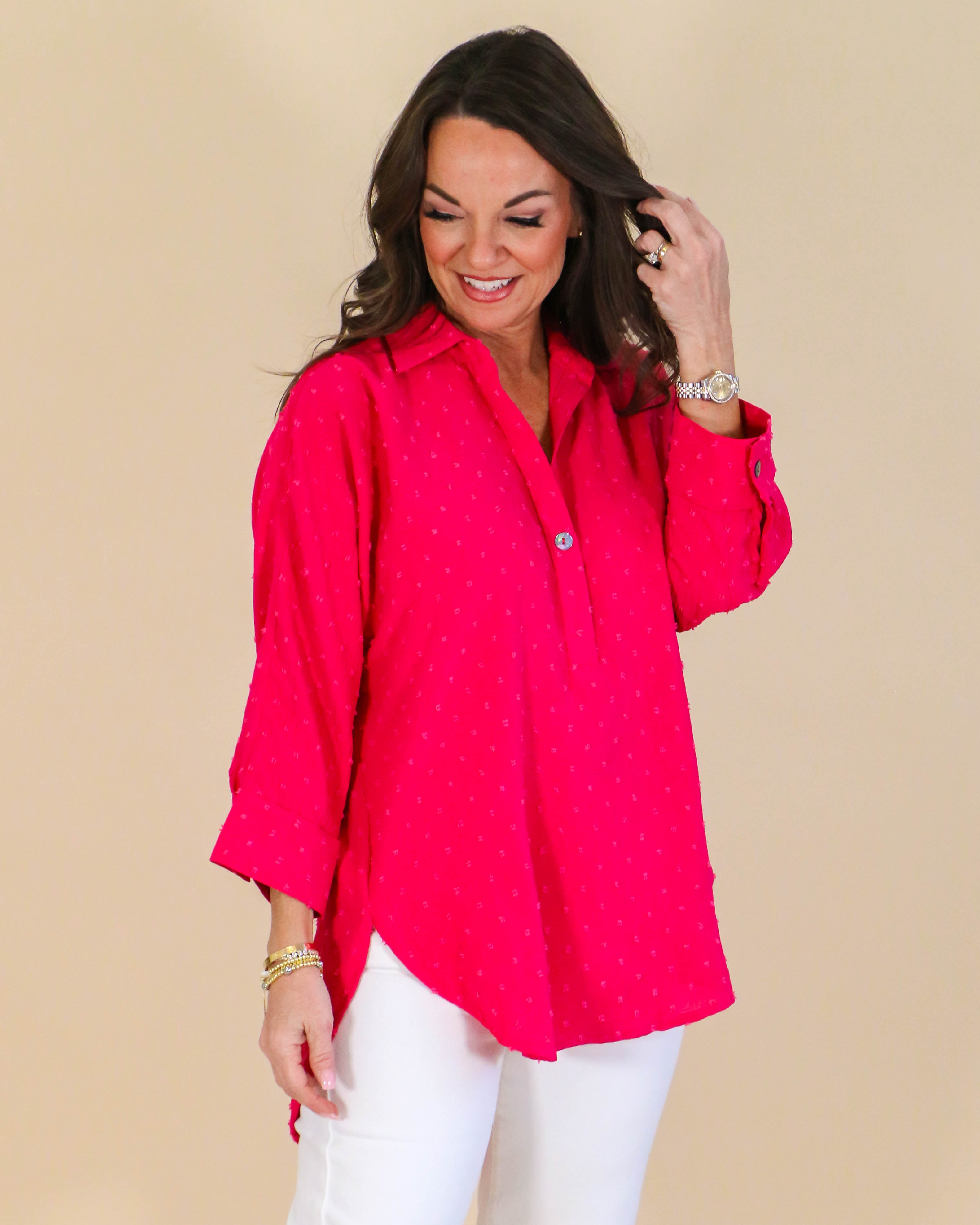 Elevate your style with our vibrant Pop Collar Popover Top in Fuchsia! With its eye-catching color and chic pop collar design, you'll stand out in any crowd. Made from high-quality materials, this top is both stylish and comfortable. Perfect for adding a bold touch to any outfit.