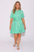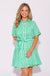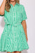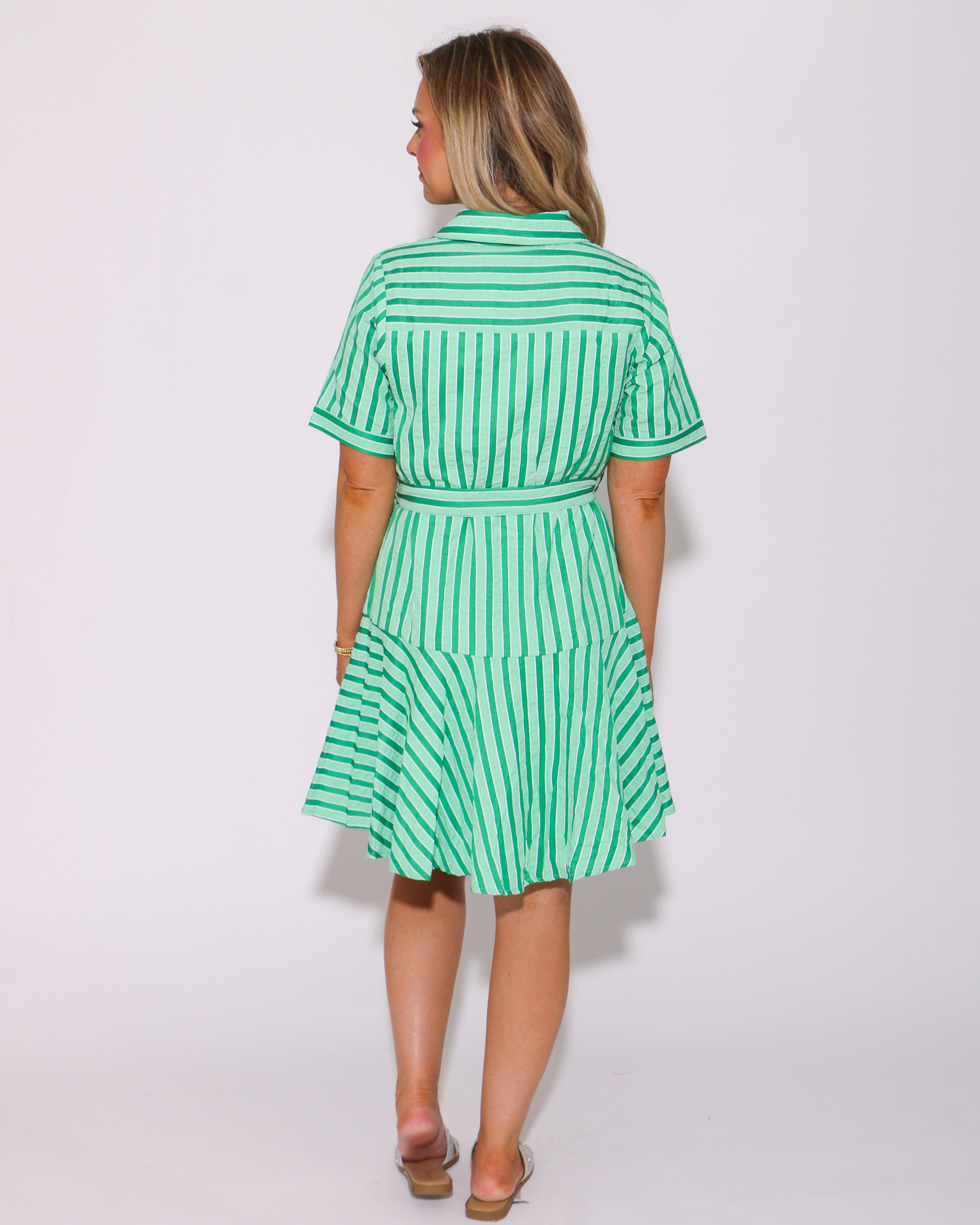 Elevate your style with our Sage and Stripes Green Dress. Featuring a textured stripe pattern and flared mini length, this dress is both trendy and versatile. The shirt collar and front button closure add a touch of sophistication, while the removable waist self tie allows for a customizable fit. With its lined, non-sheer, and lightweight design, this dress is perfect for any occasion. Upgrade your wardrobe today!