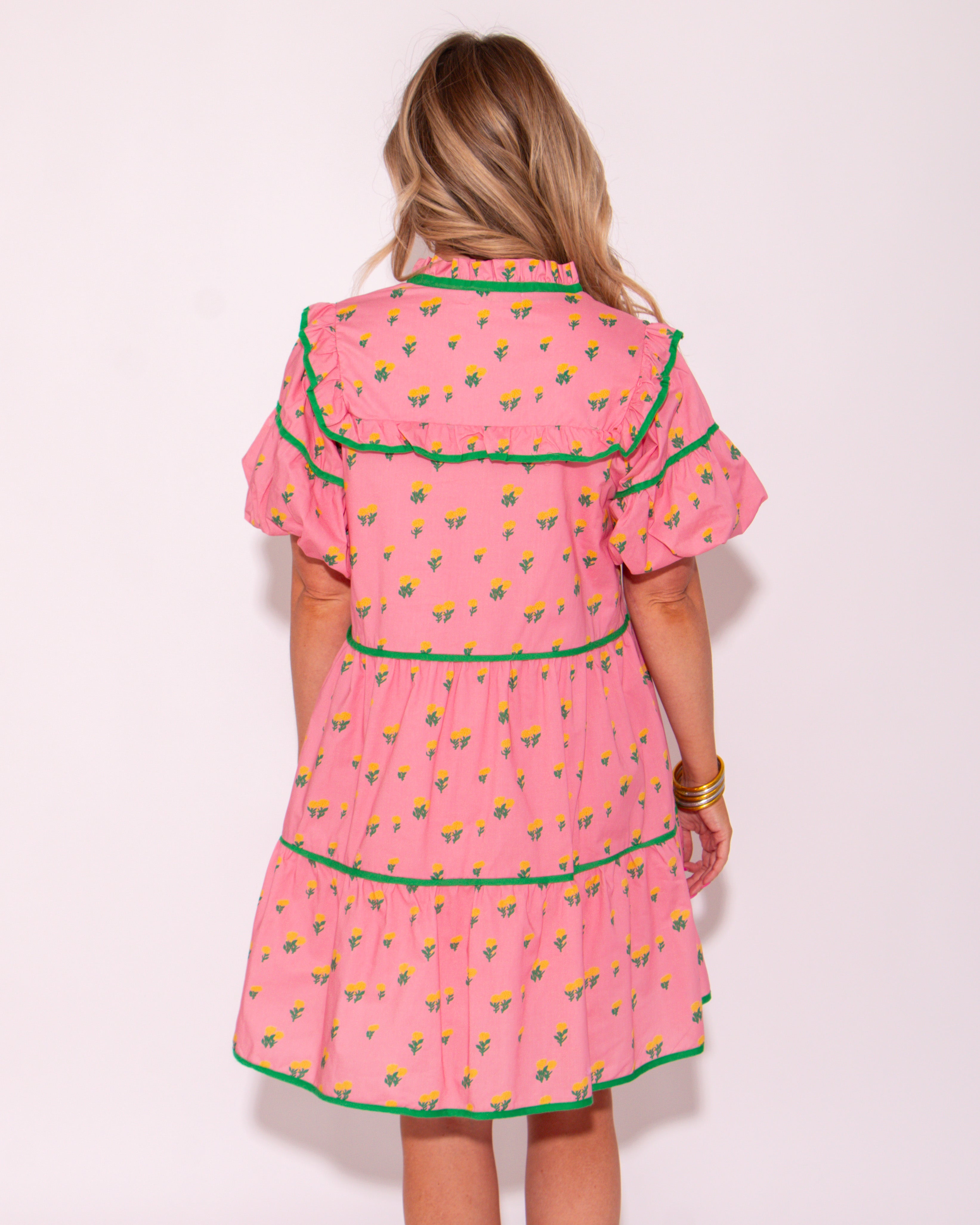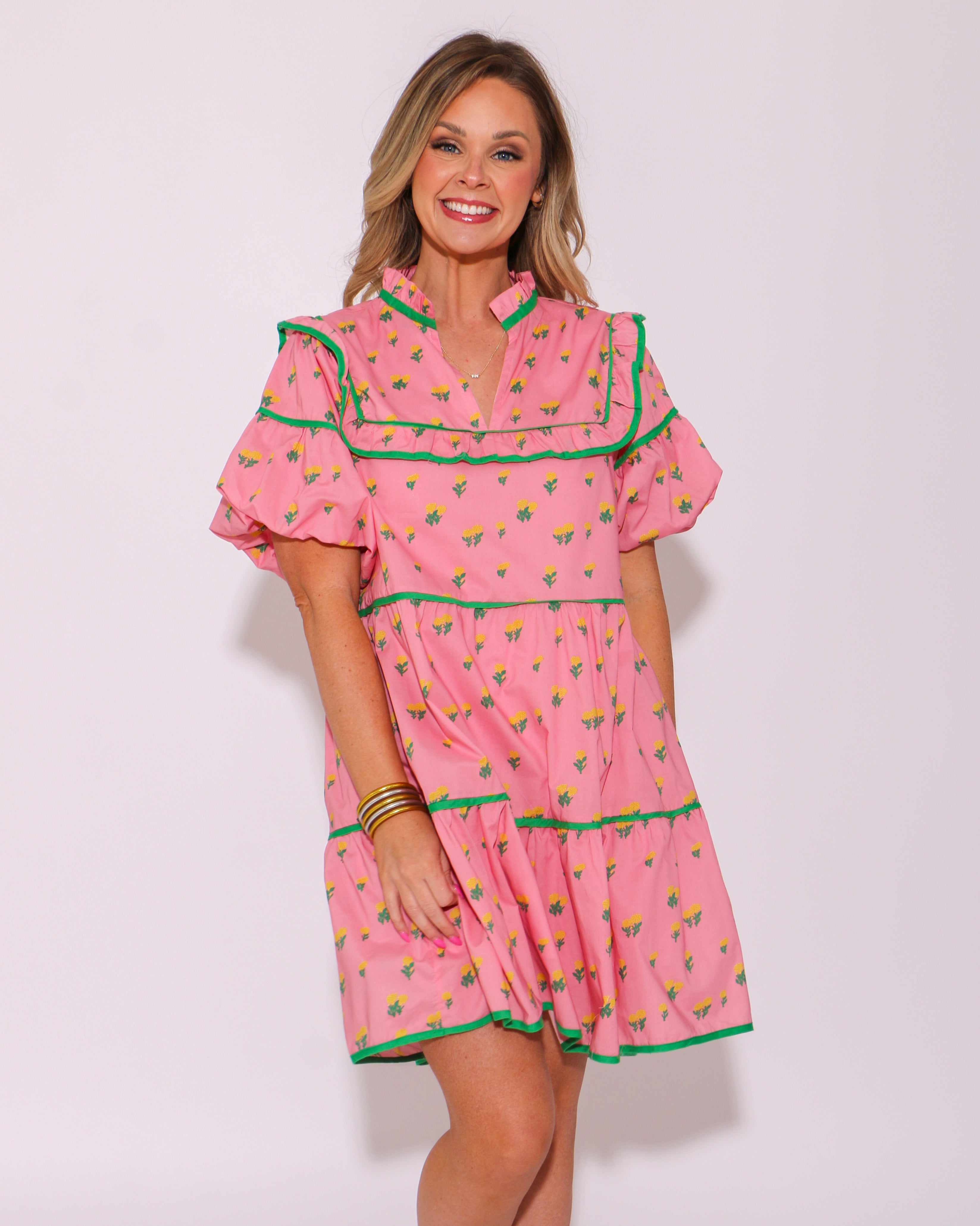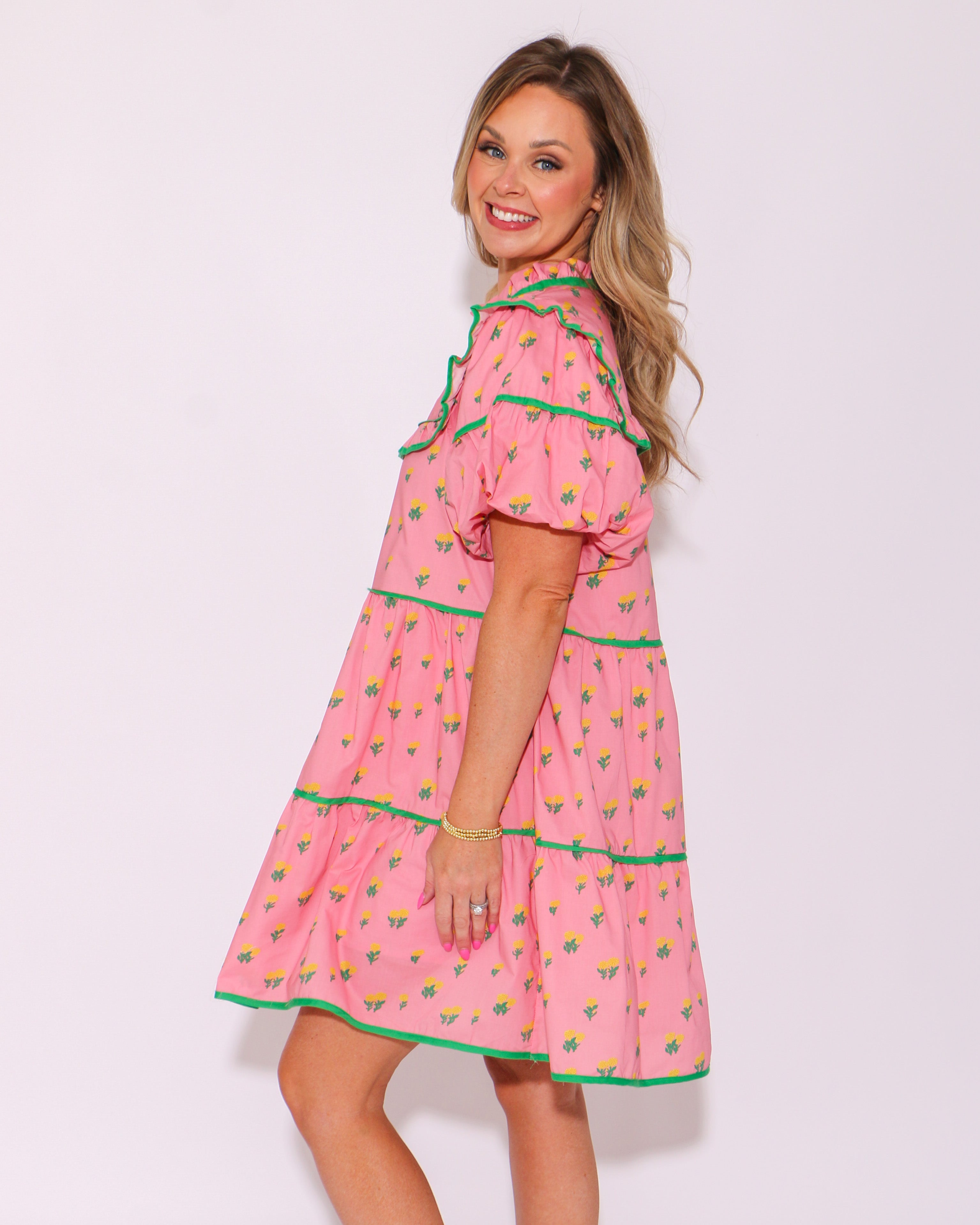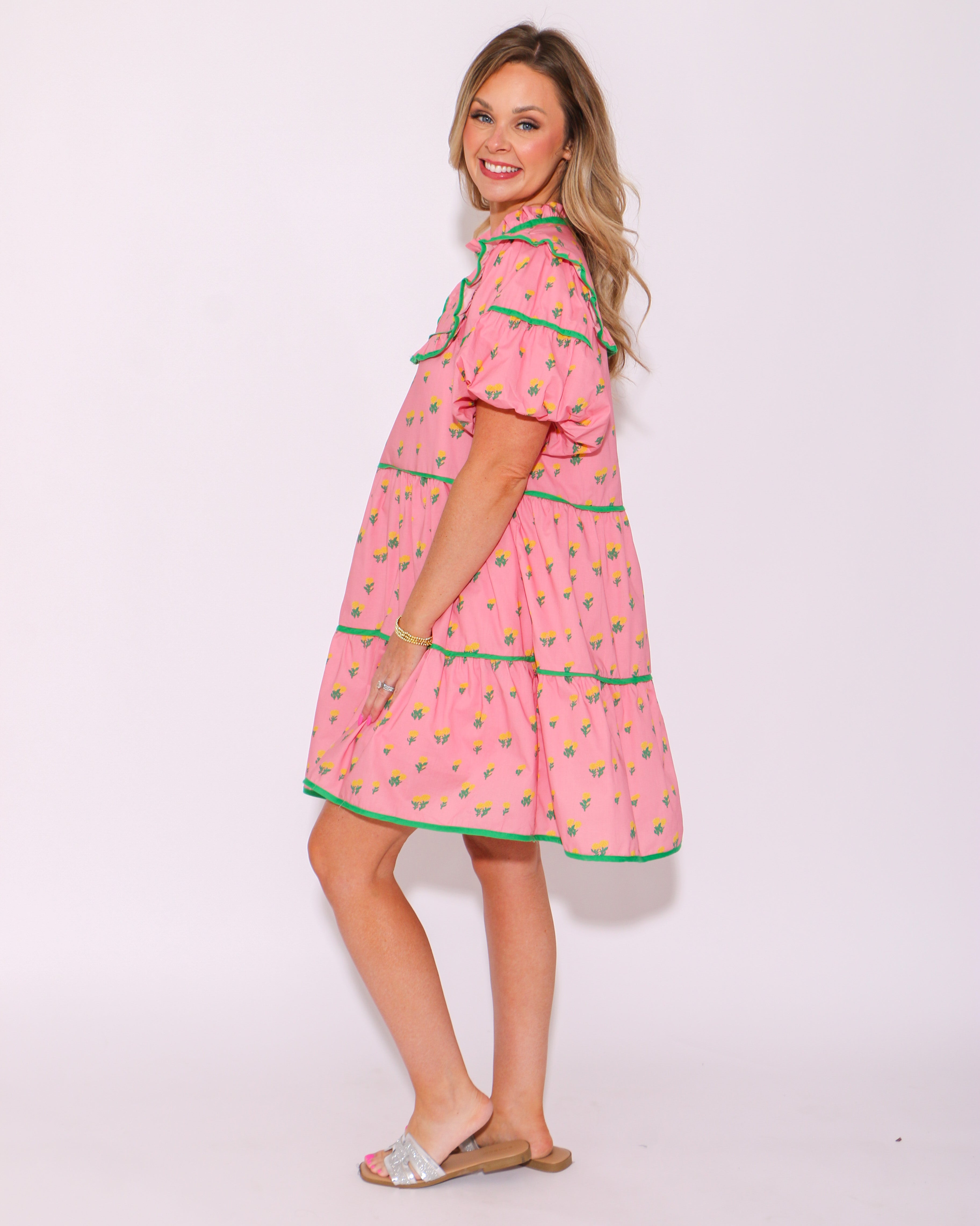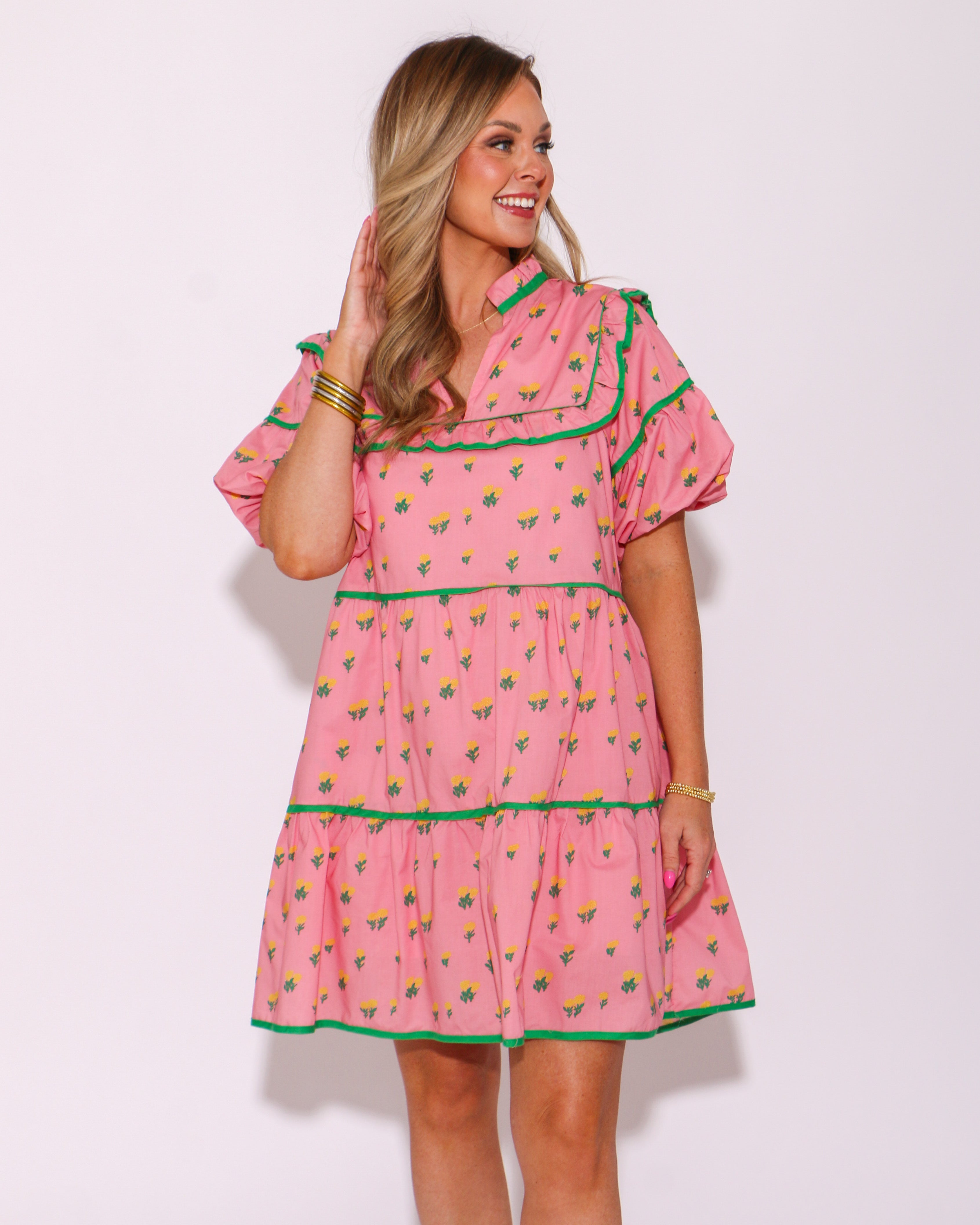Introducing our Spring Fling Babydoll Dress! This charming dress features a lovely floral print and a ruffle-trimmed high neckline with a notched V-cut. The puff sleeves with elastic cuffs add a touch of femininity, while the tiered babydoll silhouette flatters all figures. Stay stylish and comfortable with the added lining.