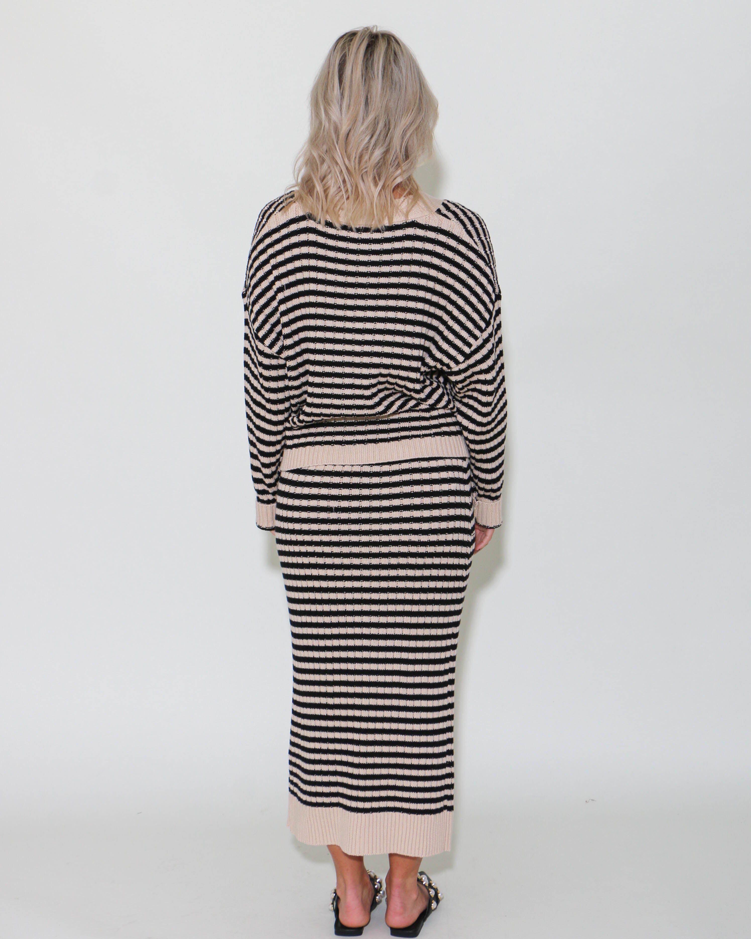 Upgrade your wardrobe with our Stripe Ribbed Crop Sweater Cardigan. This long sleeve, v-neck sweater features a sophisticated cream and black stripe design that gives it a stylish edge. With its ribbed texture and cropped length, it's the perfect combination of comfort and fashion. Elevate your look today!