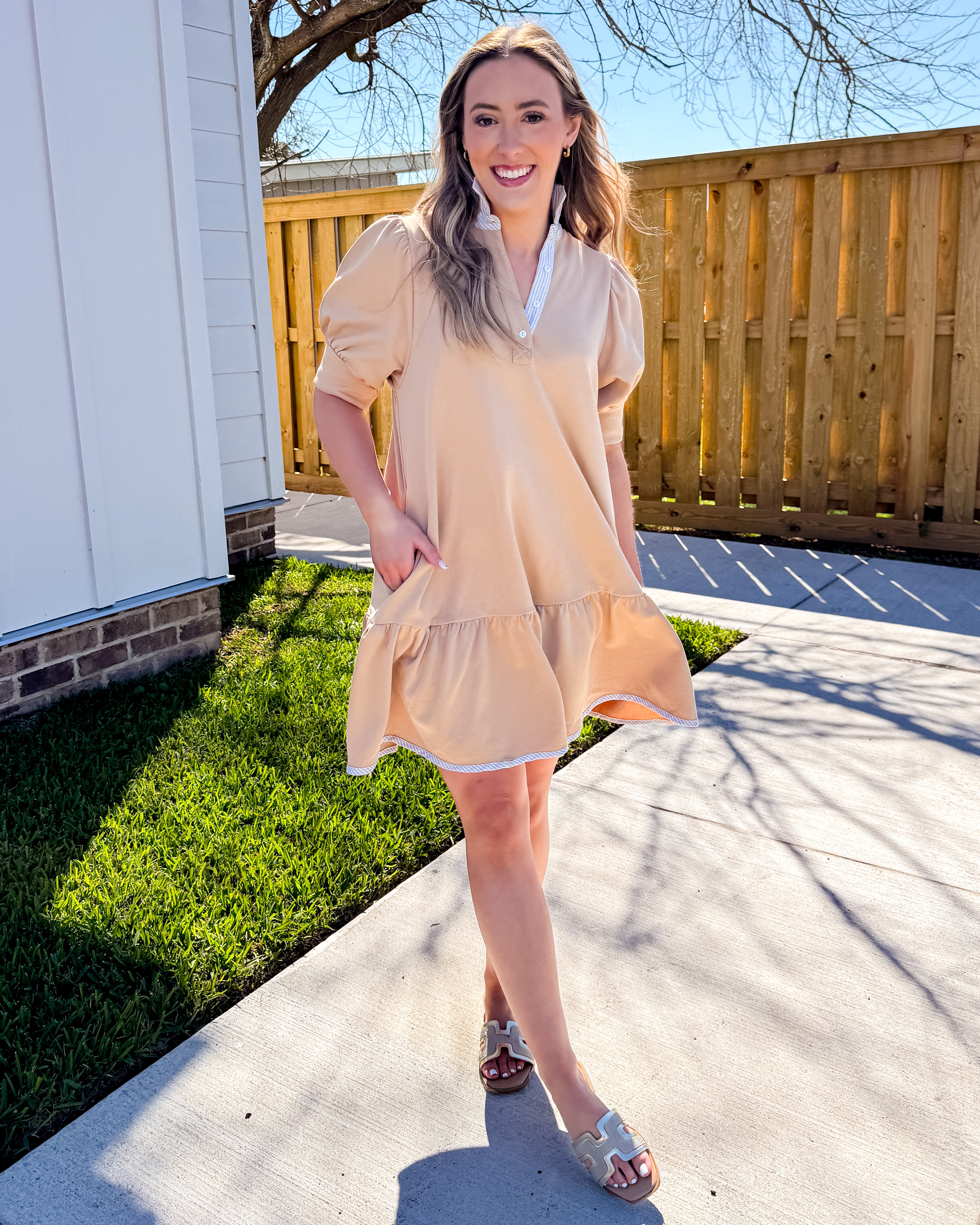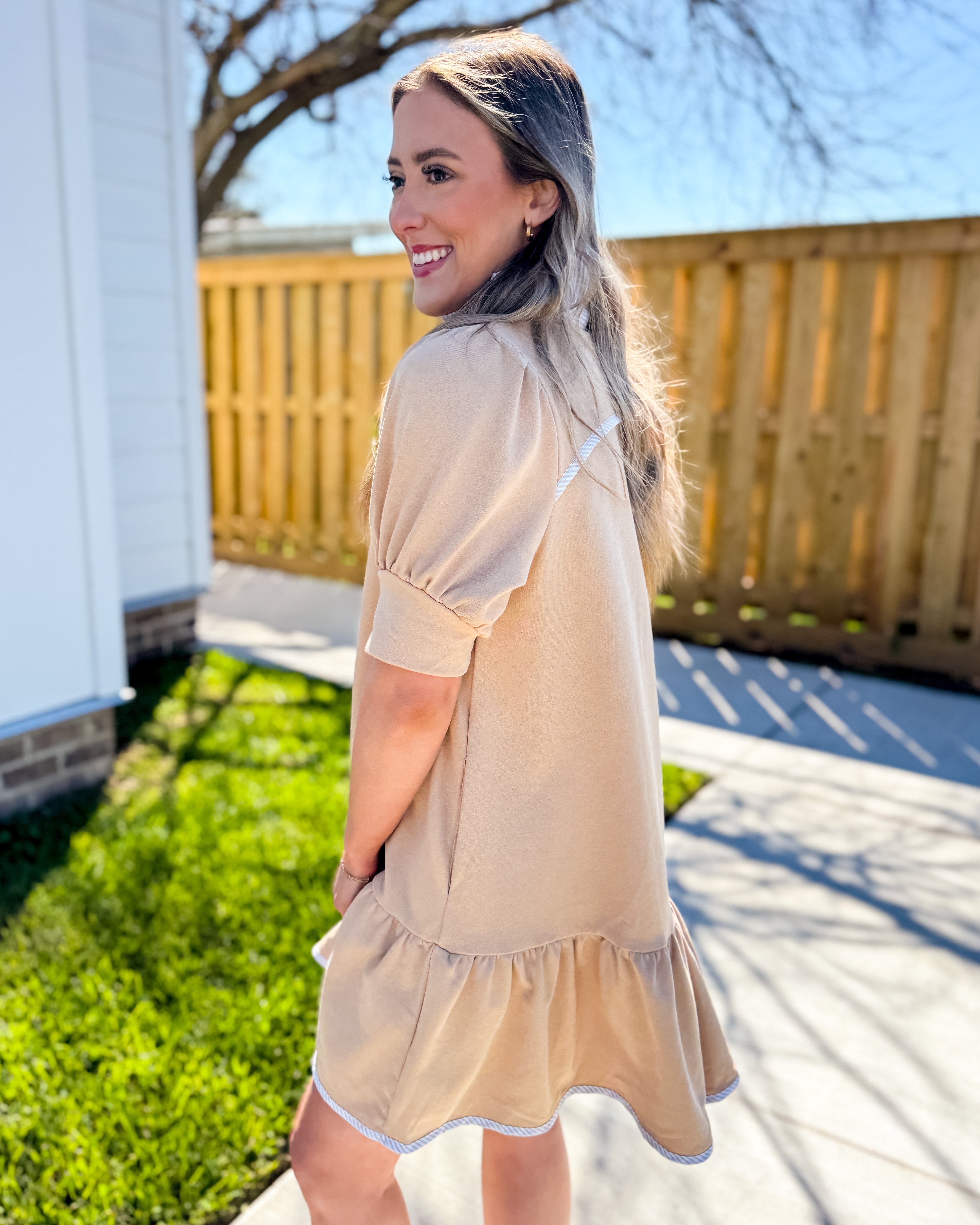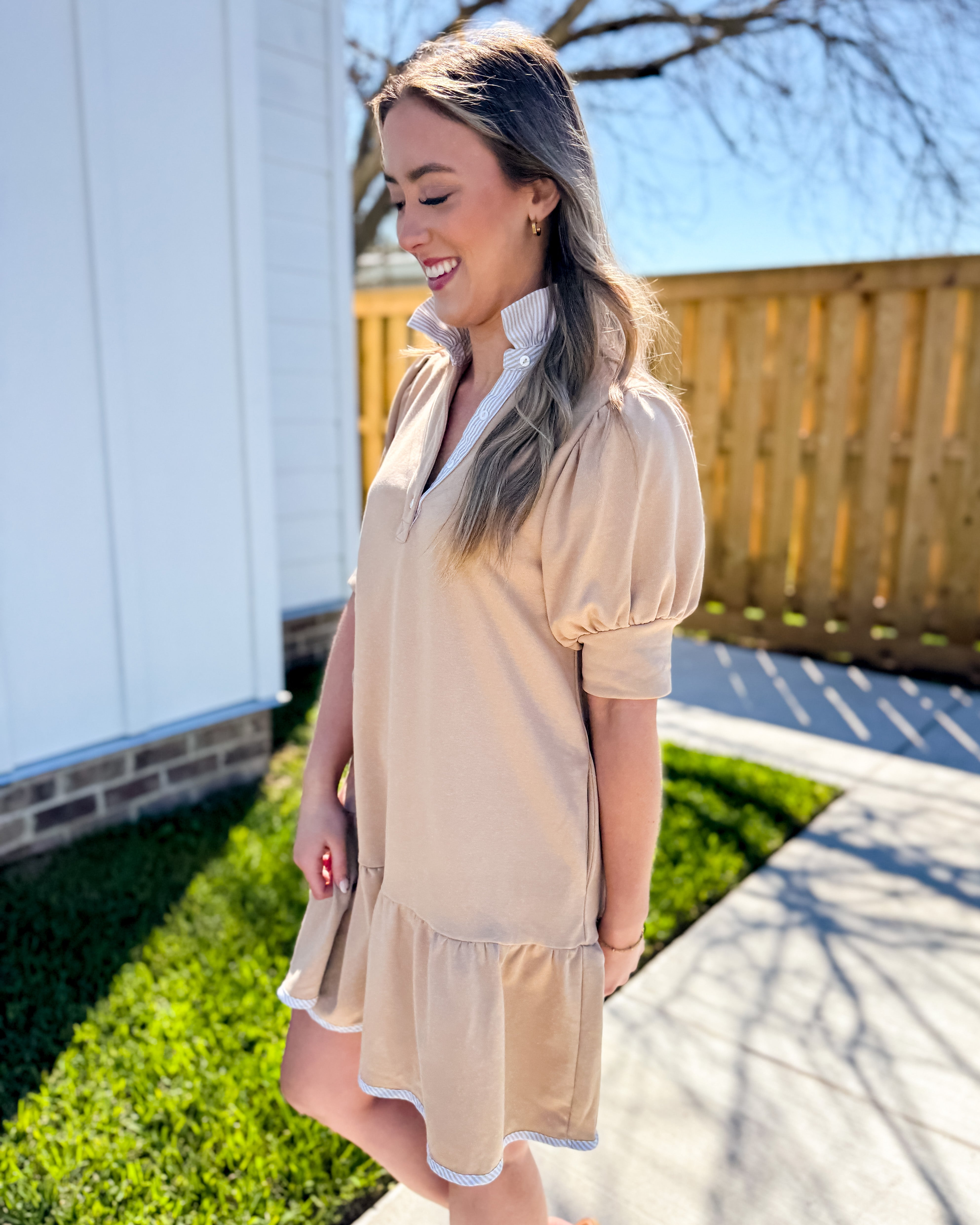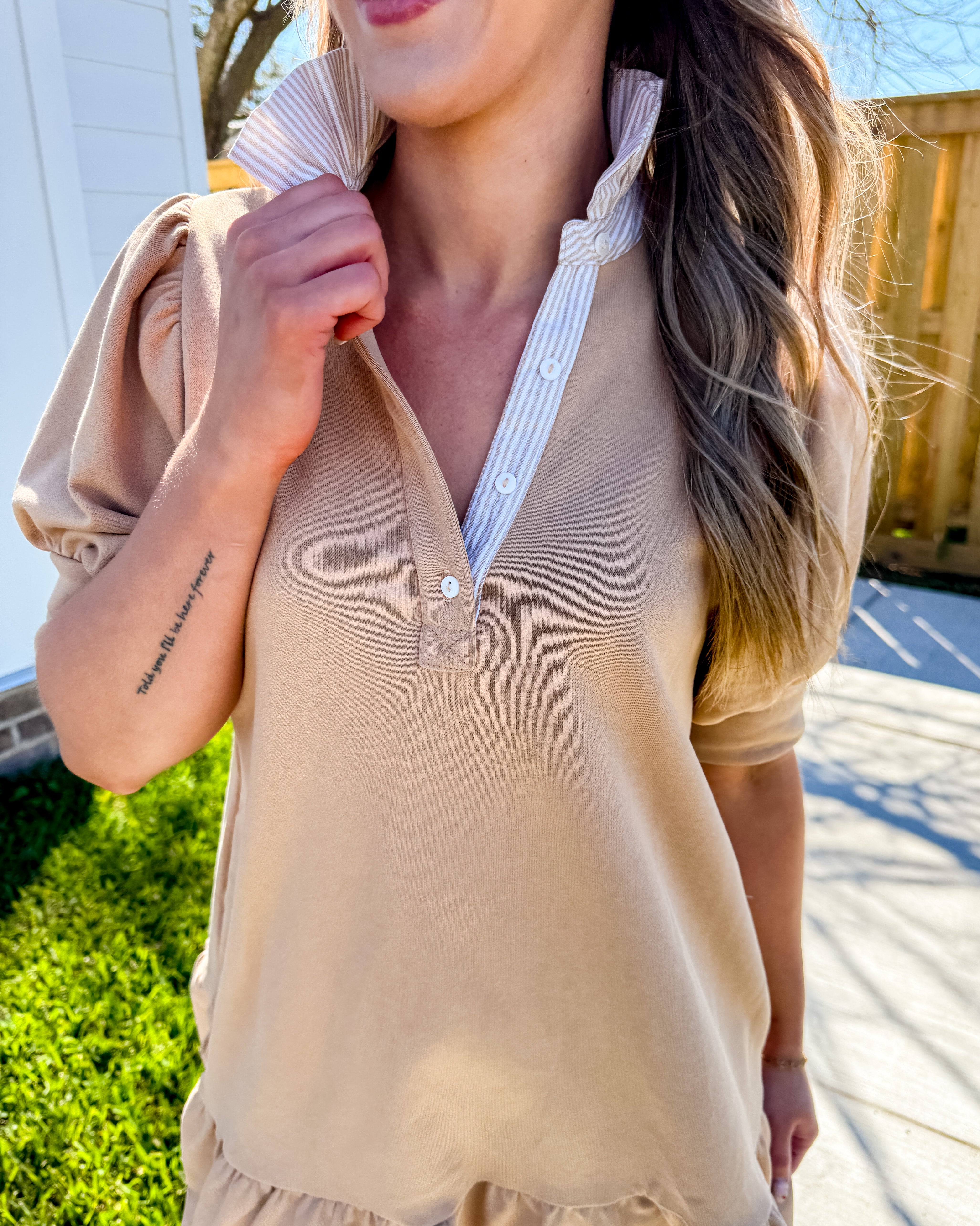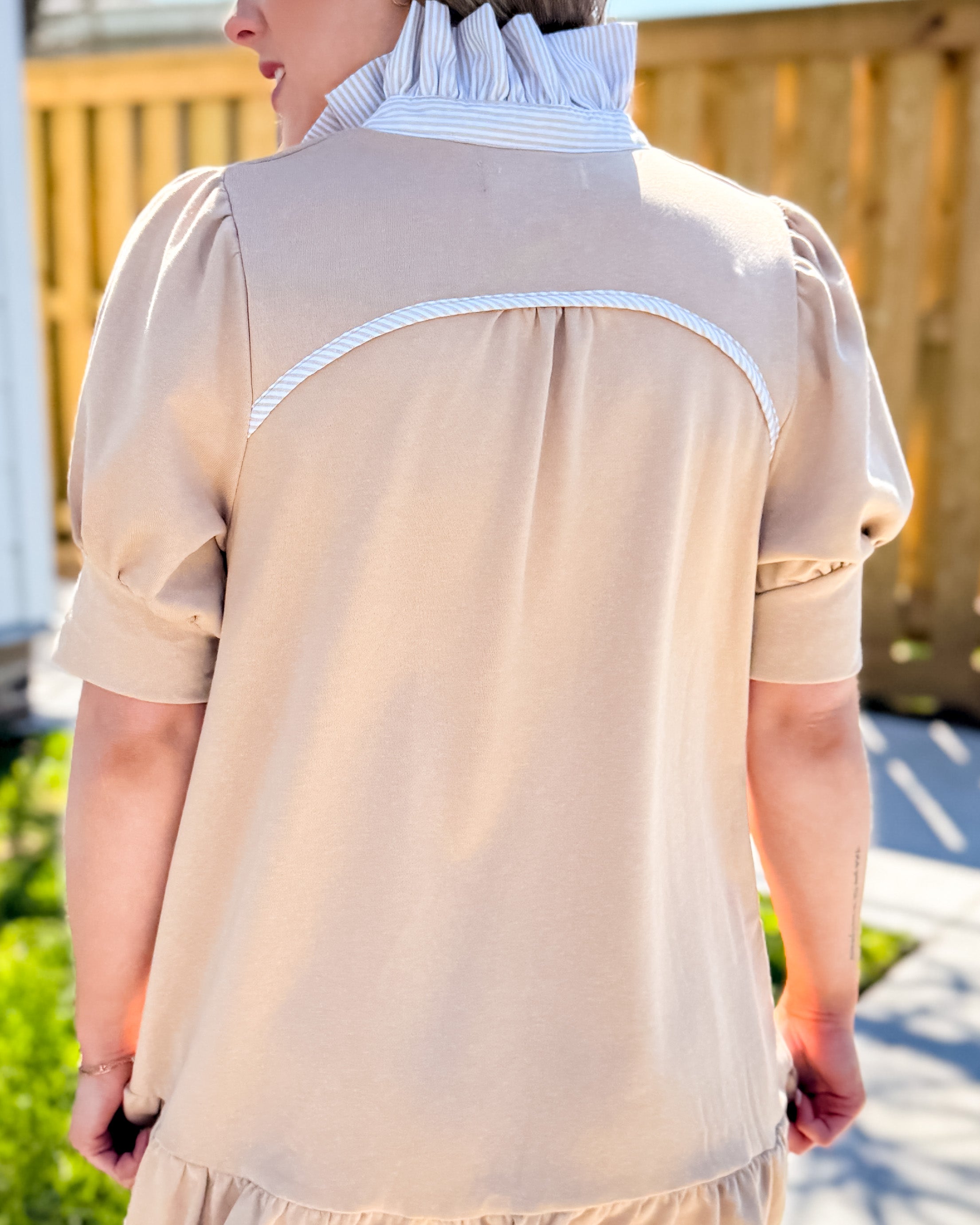 Transform your style with our Striped High Neck Dress in Latte! This mixed mini dress features a high ruffle neck, perfect for making a fashion statement. With side pockets and a button down design, this dress is both functional and stylish. Not lined for a comfortable and lightweight feel.