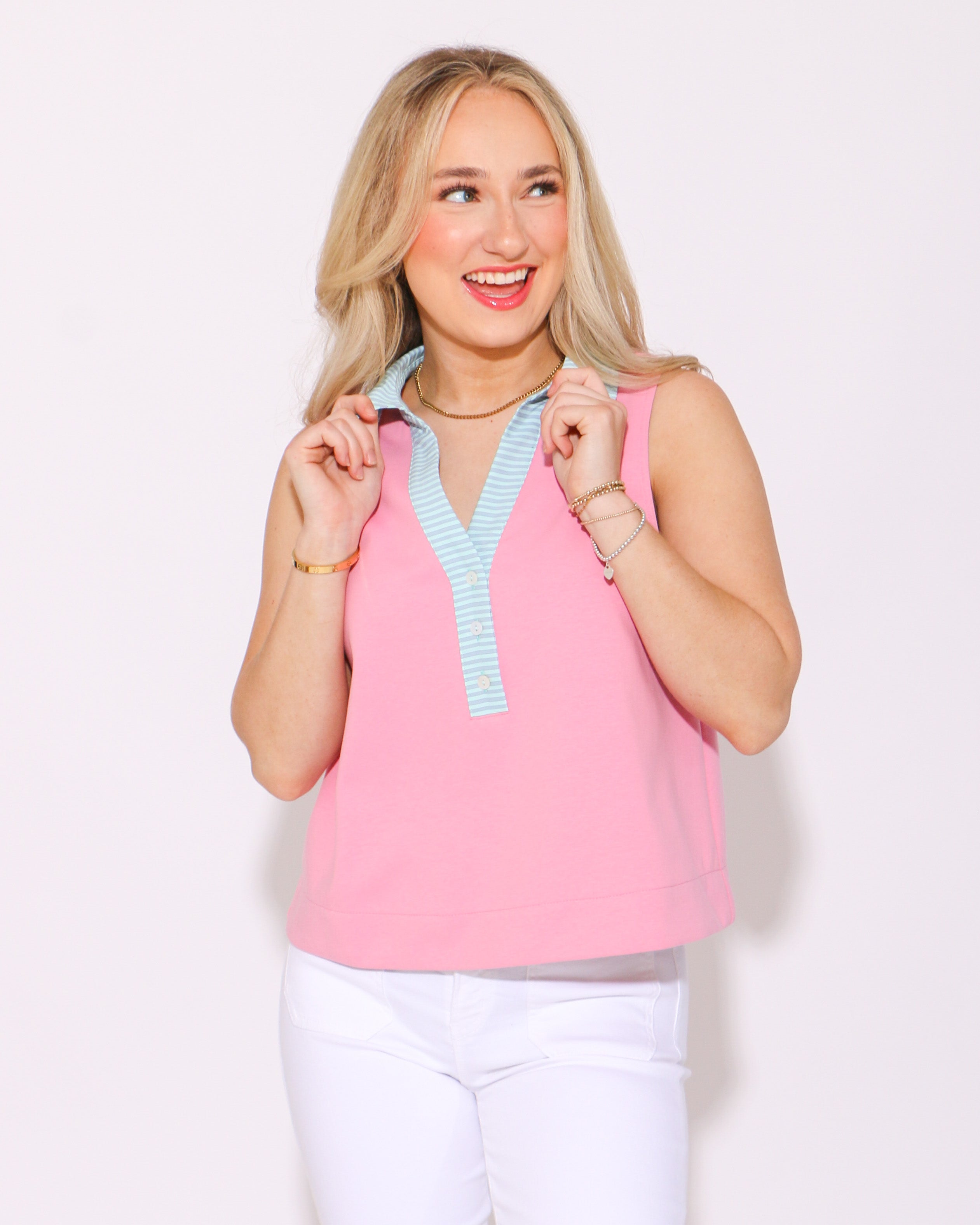 Unleash your sweet and stylish side with our Sweet and Striped Tank. The solid jersey knit and contrast spread collar add a touch of sophistication to this lightweight, non-sheer top. Perfect for any occasion, dress it up or down for a versatile and effortless look.