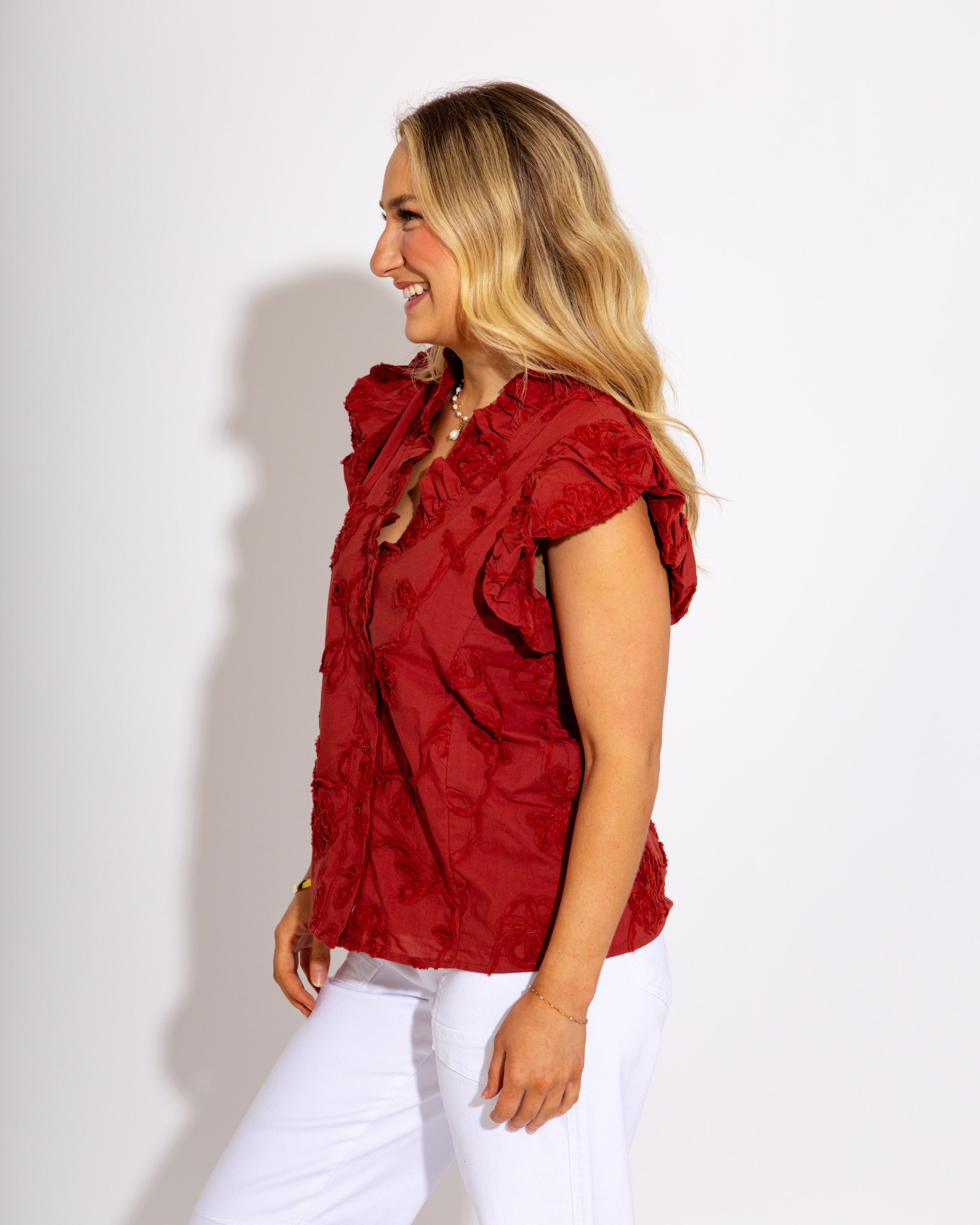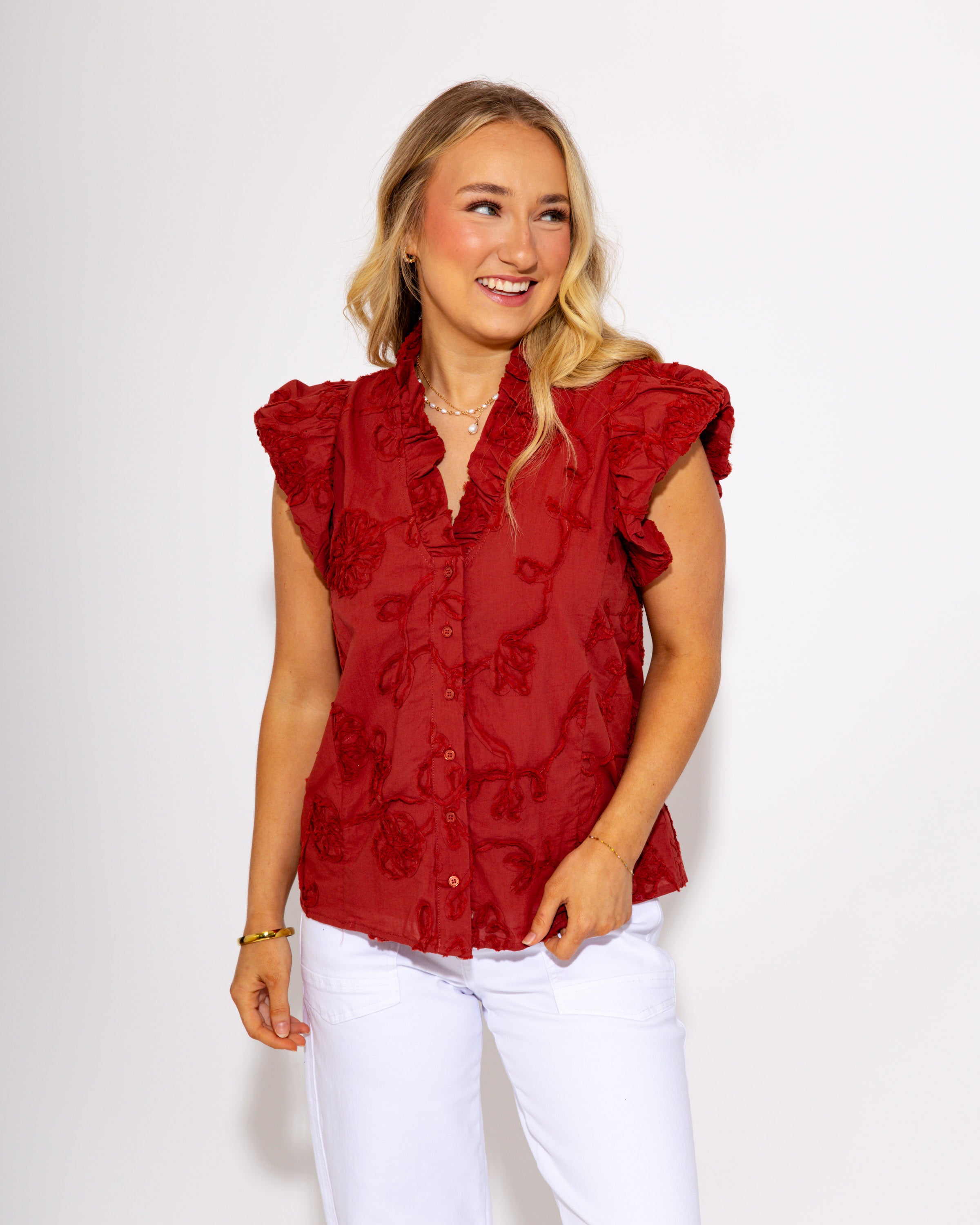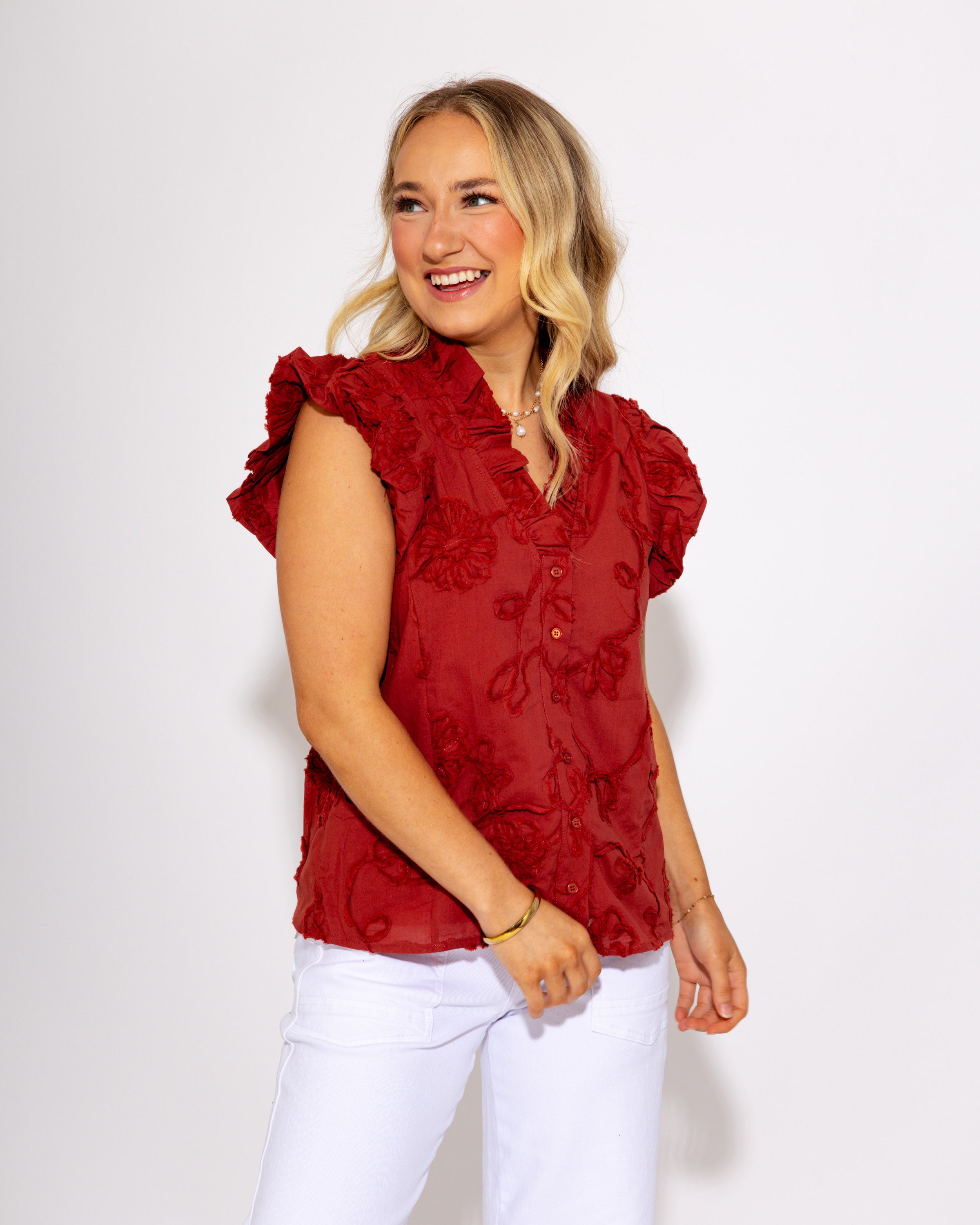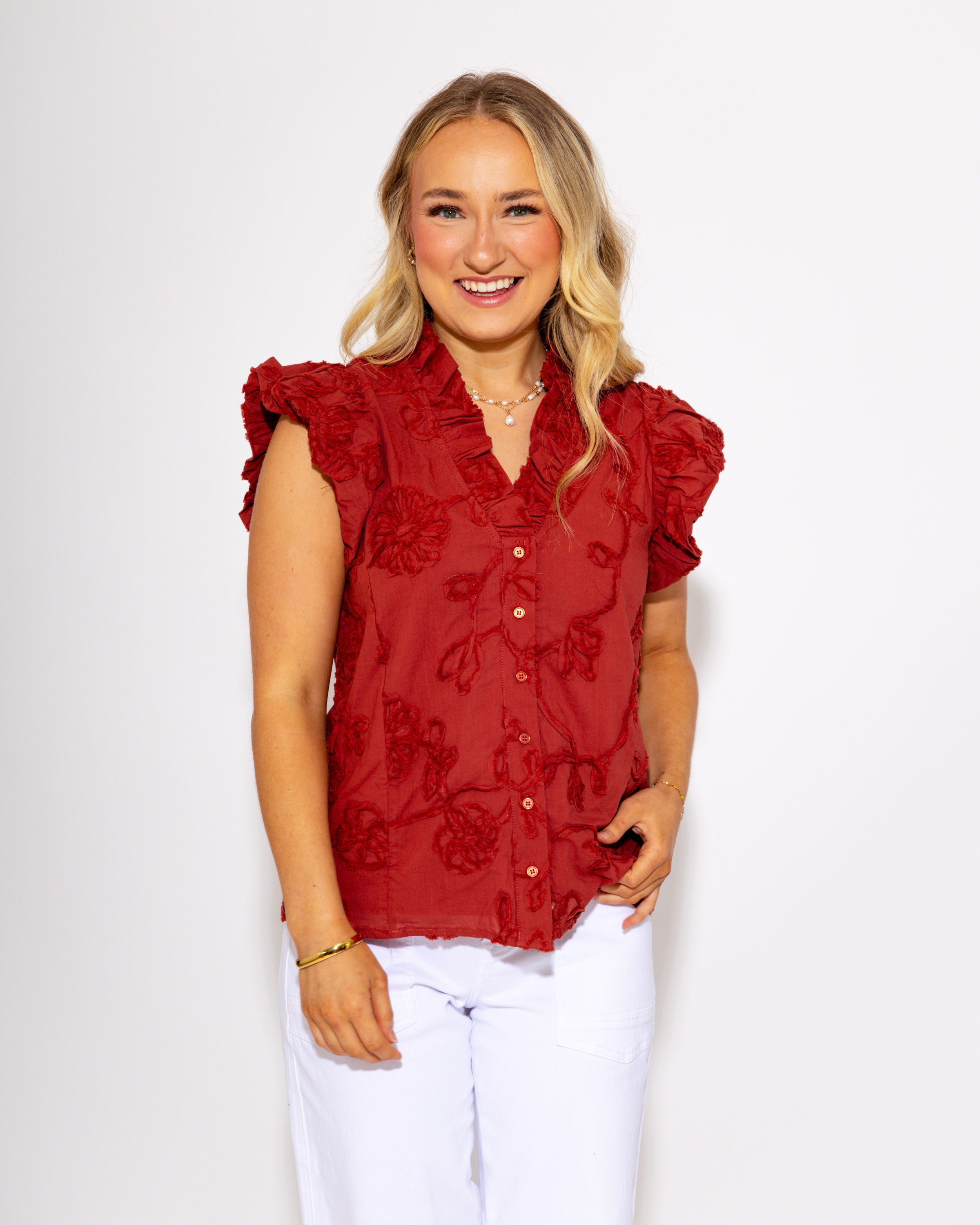 Cheer on your team in style with our Chestnut Ruffle Top — the ultimate game day upgrade! Crafted from solid cotton, this charming top features flutter sleeves and delicate floral appliqué that bring a touch of sophistication to your spirited look. The ruffle-accented V-neck adds just the right amount of flair, while the lightweight, non-sheer fabric keeps you comfortable through every touchdown celebration. Whether you’re tailgating or watching from the stands, this top is your new go-to for effortless, chic game day vibes. Score yours today!