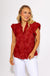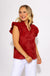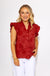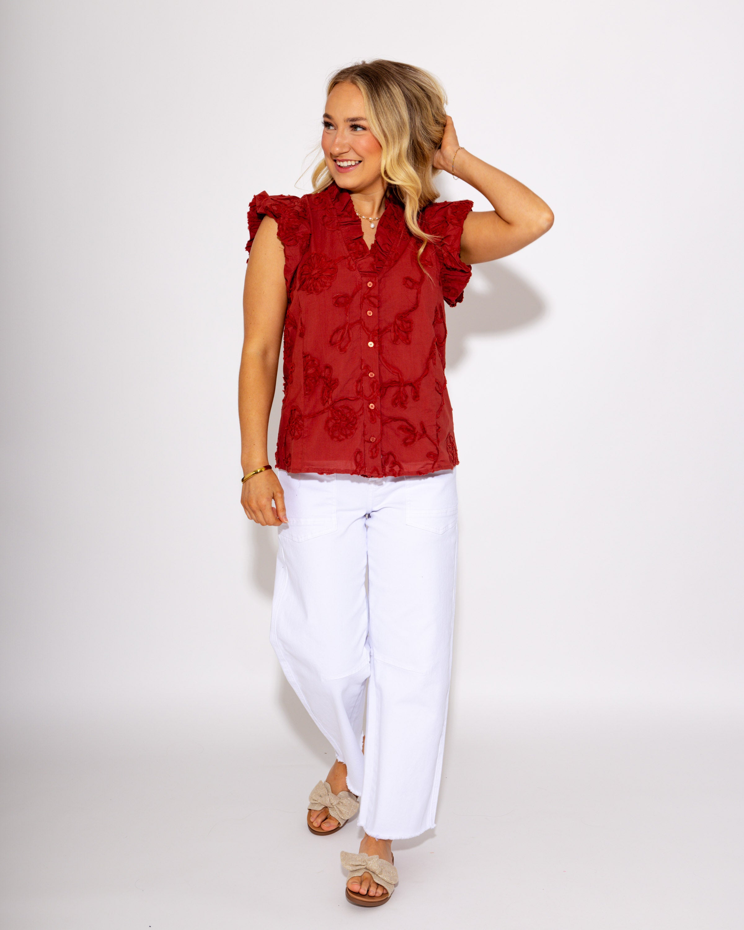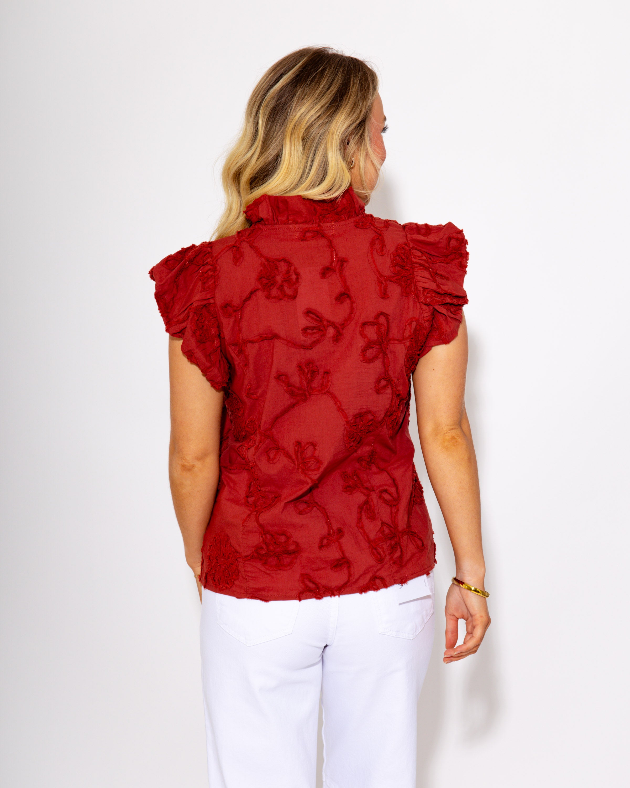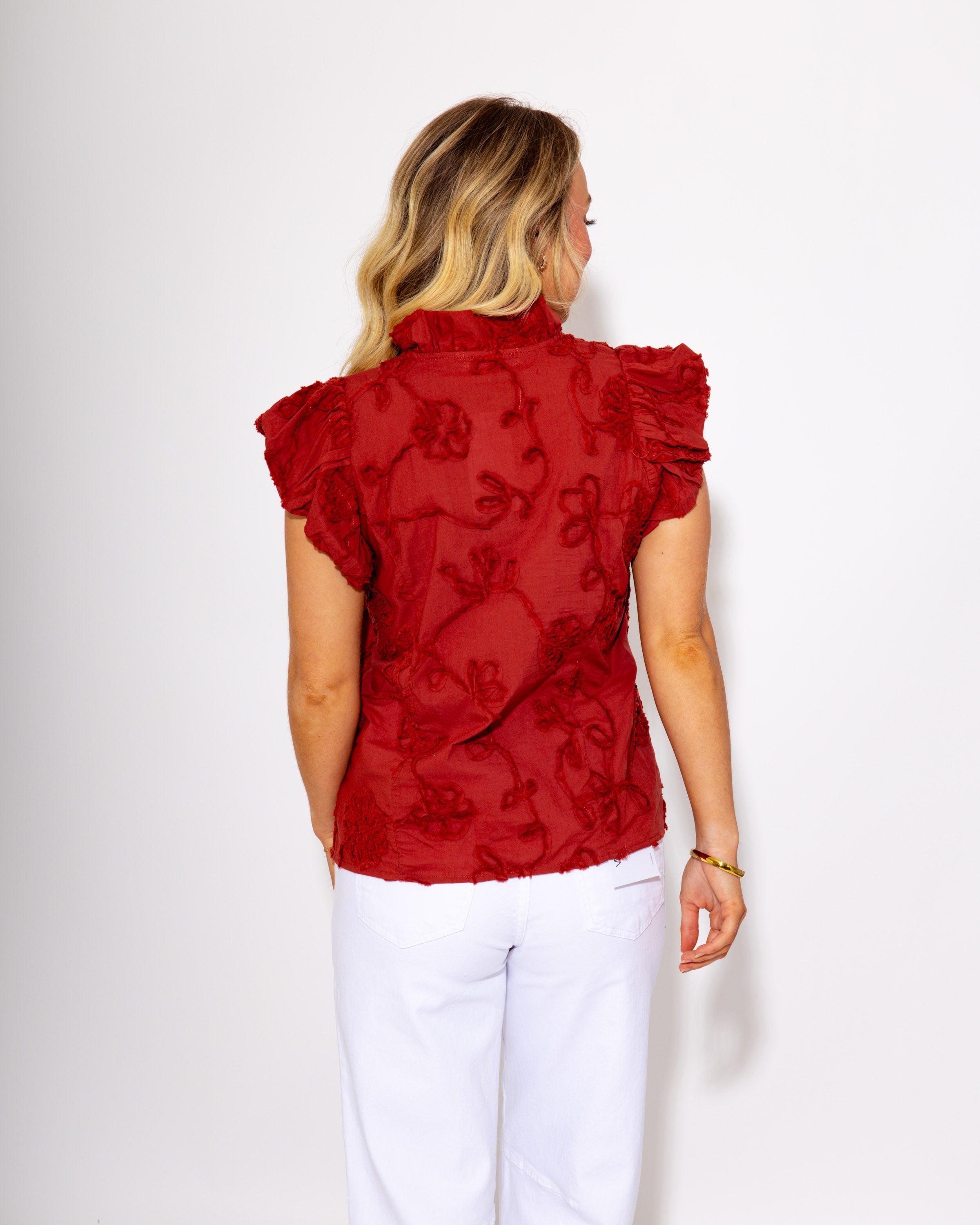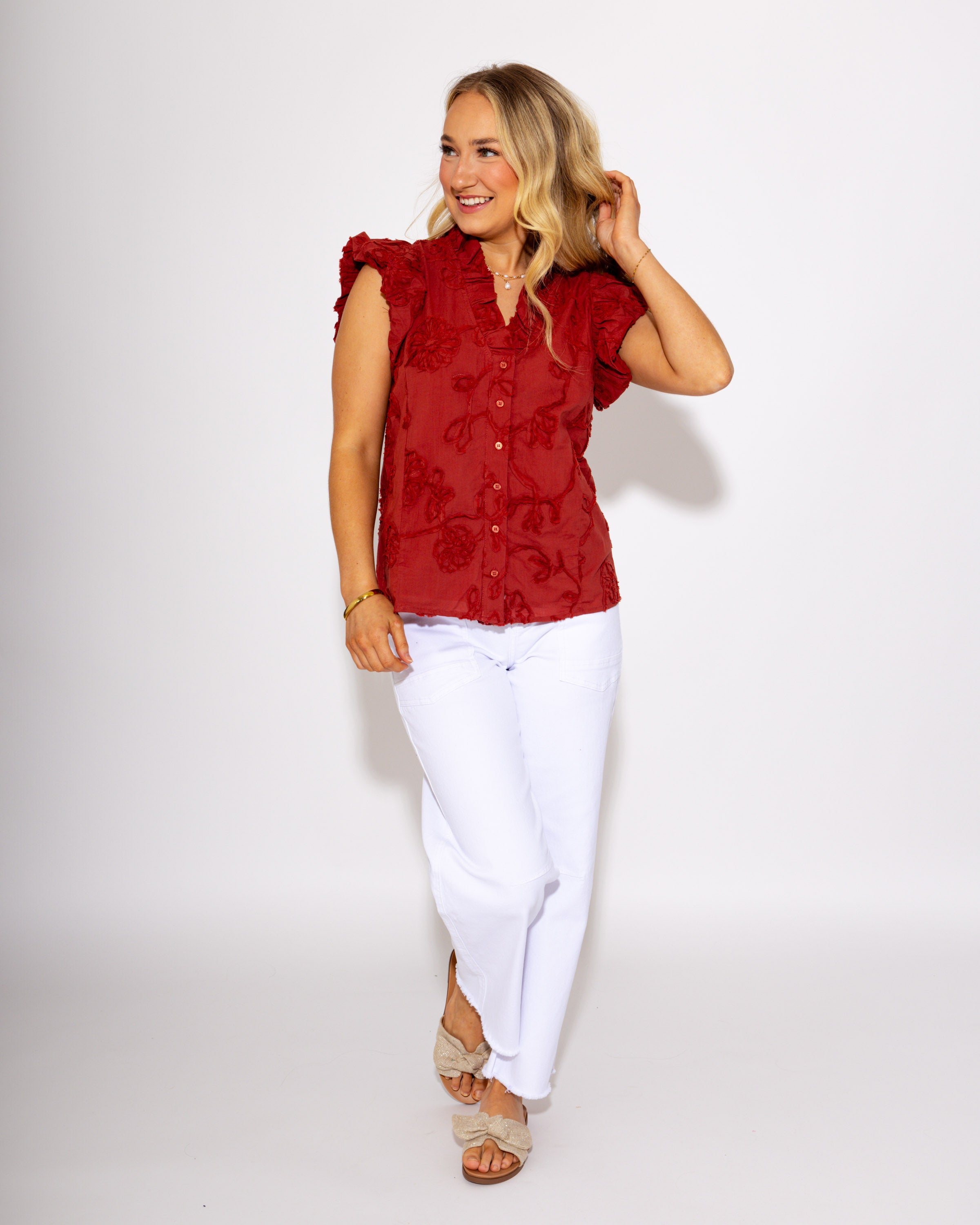 Cheer on your team in style with our Chestnut Ruffle Top — the ultimate game day upgrade! Crafted from solid cotton, this charming top features flutter sleeves and delicate floral appliqué that bring a touch of sophistication to your spirited look. The ruffle-accented V-neck adds just the right amount of flair, while the lightweight, non-sheer fabric keeps you comfortable through every touchdown celebration. Whether you’re tailgating or watching from the stands, this top is your new go-to for effortless, chic game day vibes. Score yours today!