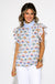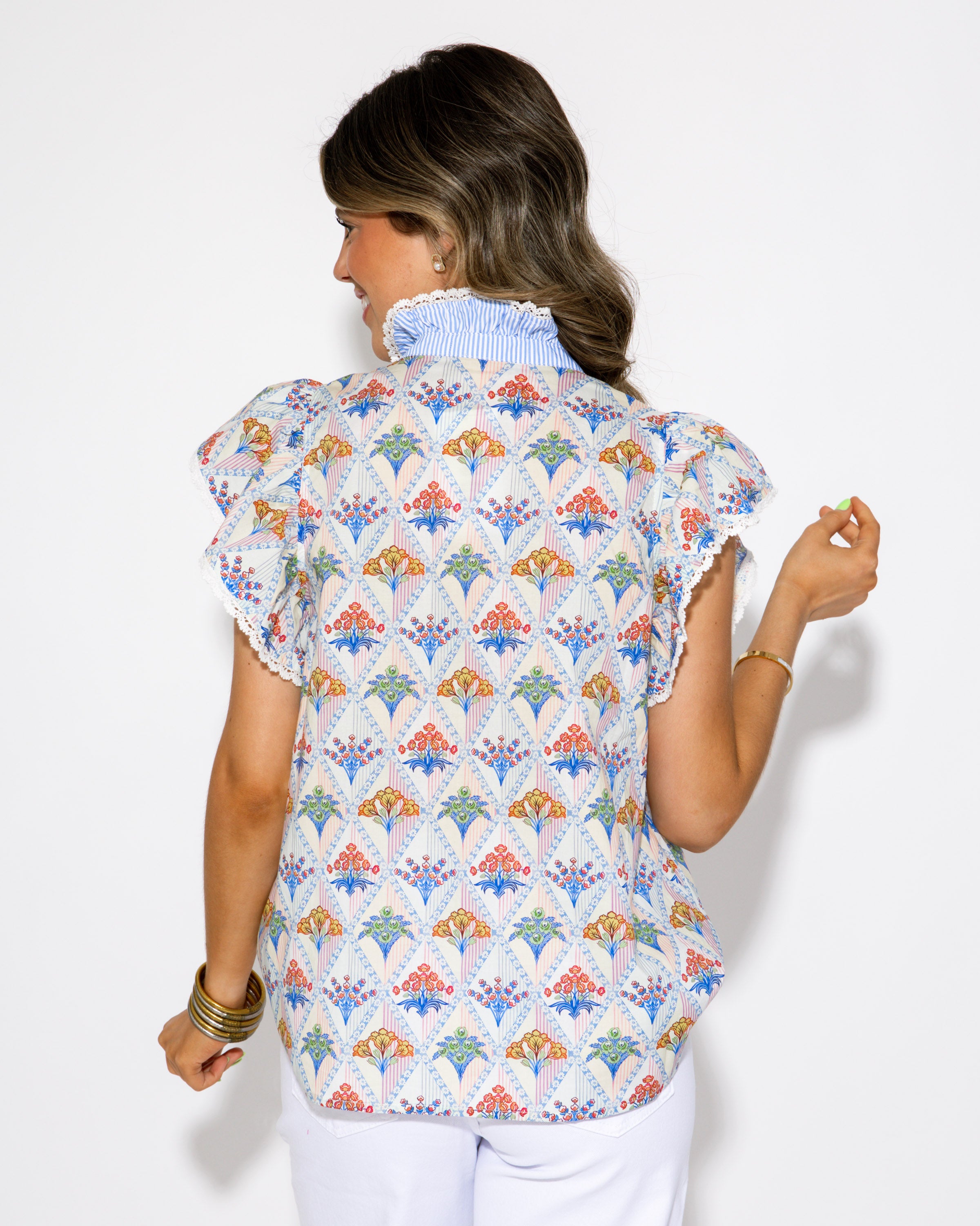 Get ready to fall in love with our Diamond Edge Floral Print Ruffle Top. This flowy pullover top features a beautiful floral inset diamond pattern and flutter sleeves for a playful touch. The contrast ruffle edge with scallop trim adds a sweet finish to this button closure top. Lightweight and non-sheer, this is a must-have addition to your wardrobe.