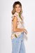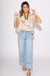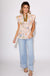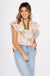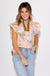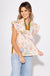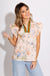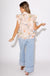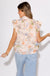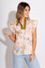 Soft, sweet, and effortlessly chic—this pleated puff cap sleeve piece is a breath of fresh air. The pale blush background is delicately adorned with washed-out light blue and pink florals, bringing a subtle watercolor effect to life. A split neckline features dark green and orange contrast banding, adding a playful pop to the romantic silhouette. Perfect for days when you want just the right balance of feminine and fun.