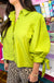 Elevate your wardrobe with this versatile button-up shirt in vibrant chartreuse. Featuring charming puff sleeves that hit at the elbow and delicate bows adorning each cuff, this piece effortlessly transitions from casual weekend wear to polished dinner occasions. The structured collar and thoughtful sleeve details create a refined silhouette that flatters and inspires confidence. Whether styled with denim for relaxed elegance or paired with tailored trousers for sophisticated flair, this shirt becomes an instant favorite for any occasion.