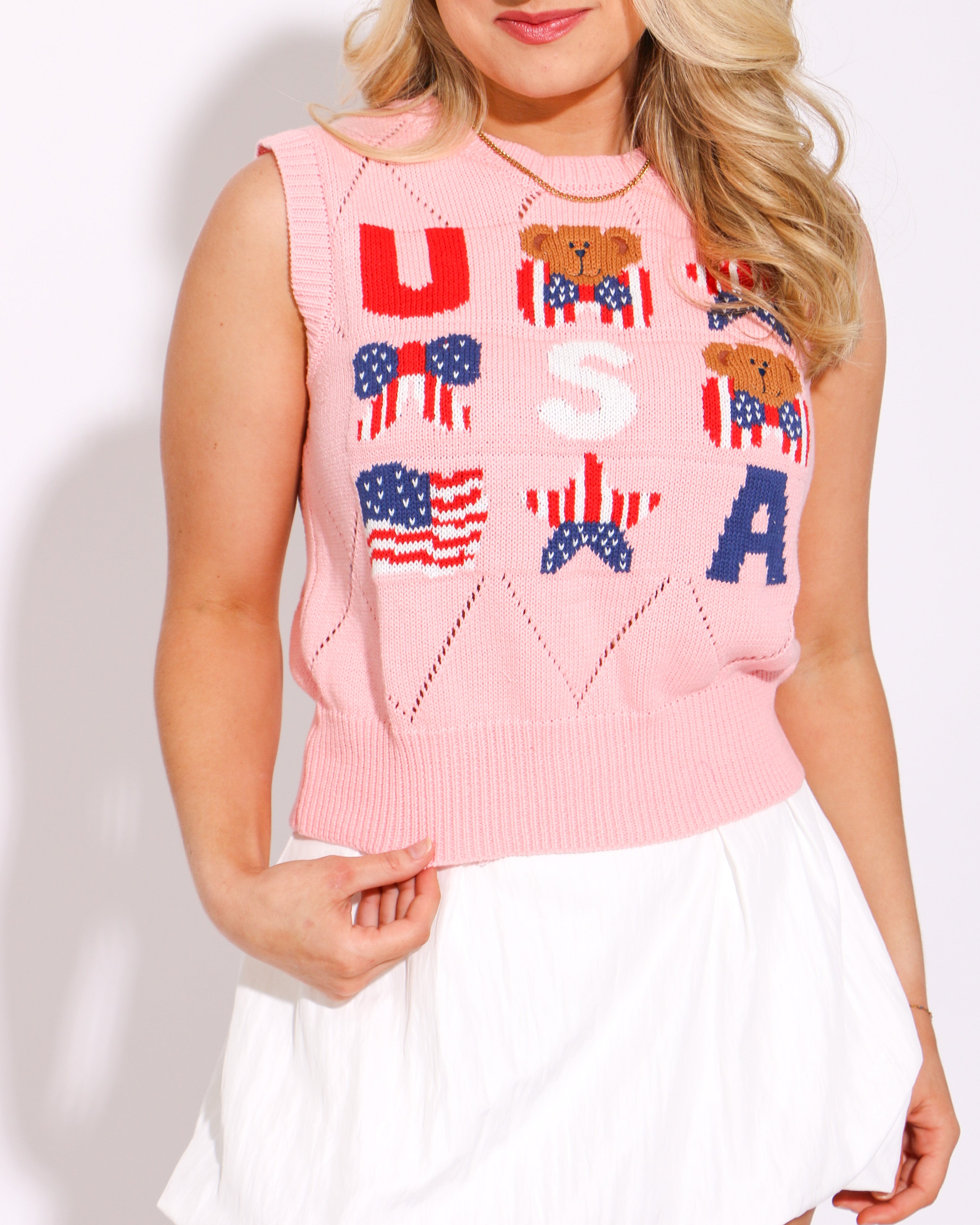 Show off your patriotic side with The American Bear Knitted Top! Featuring a unique American flag and bear design, this knitted vest is perfect for any occasion. Stay warm and stylish while proudly displaying your love for your country. A must-have addition to any wardrobe.