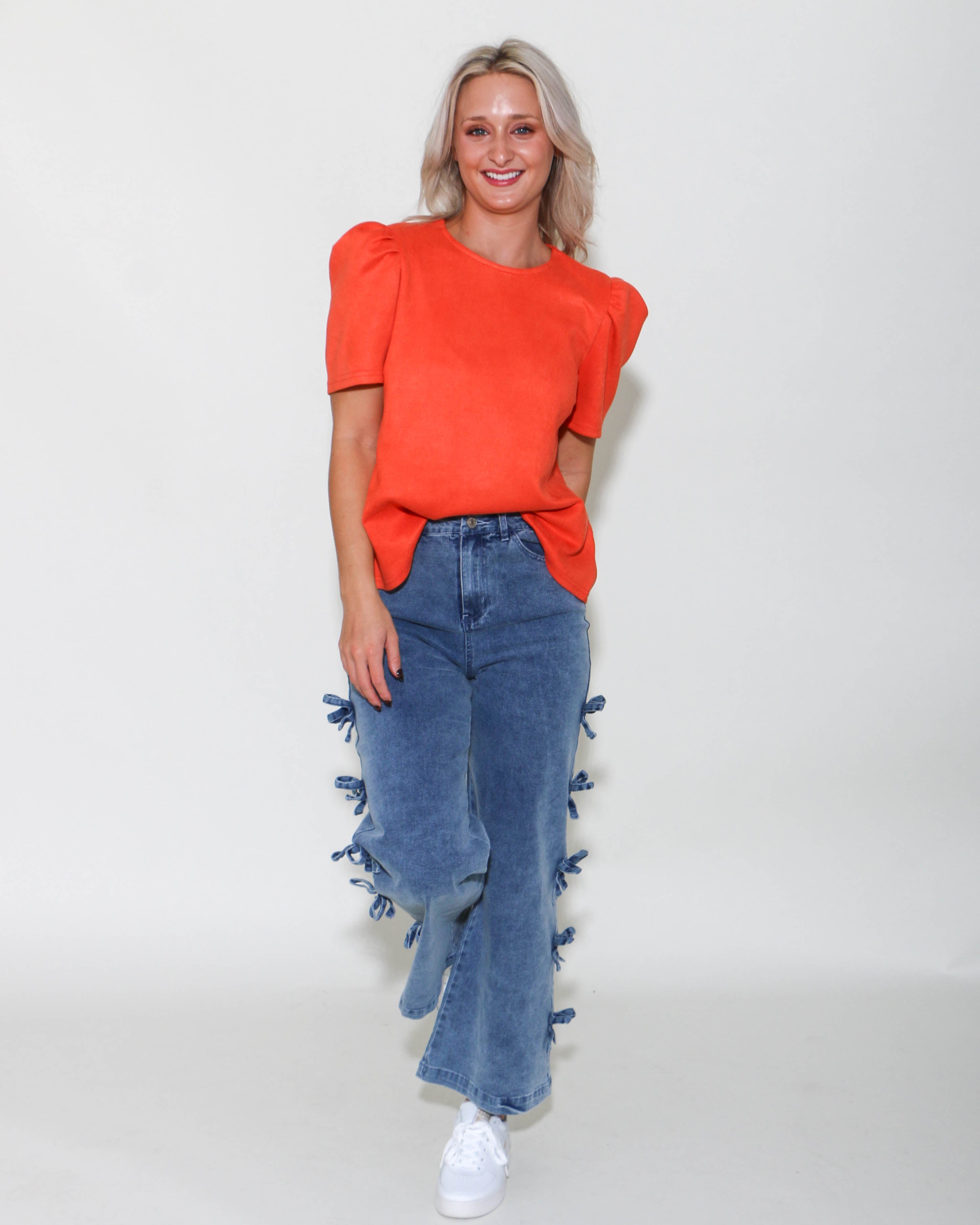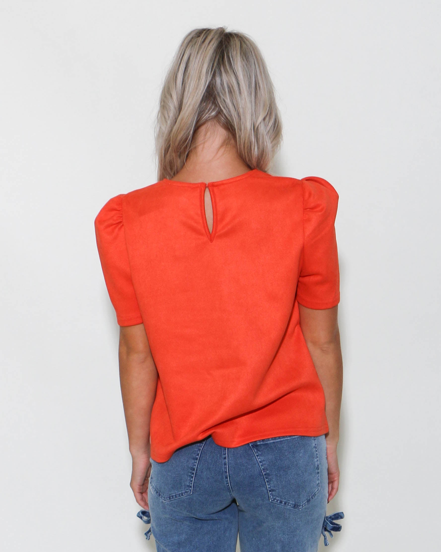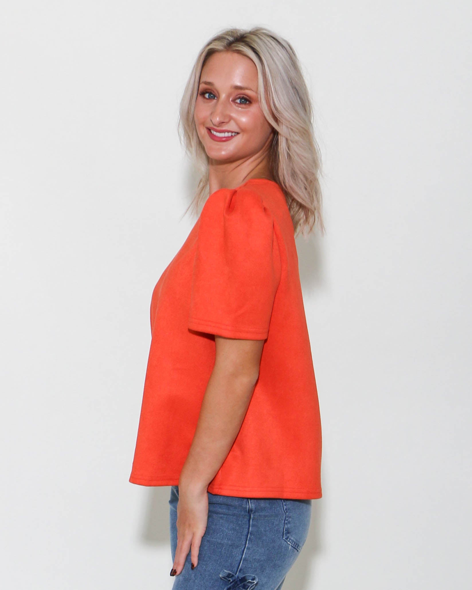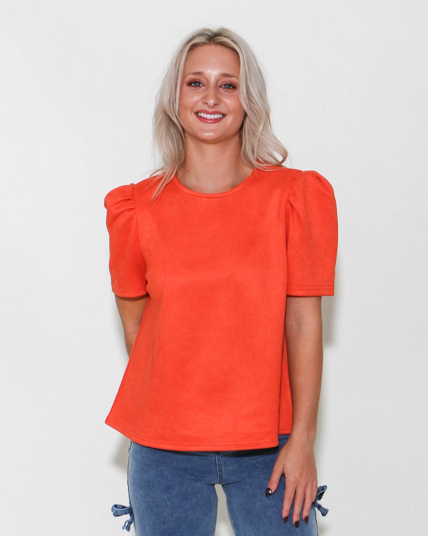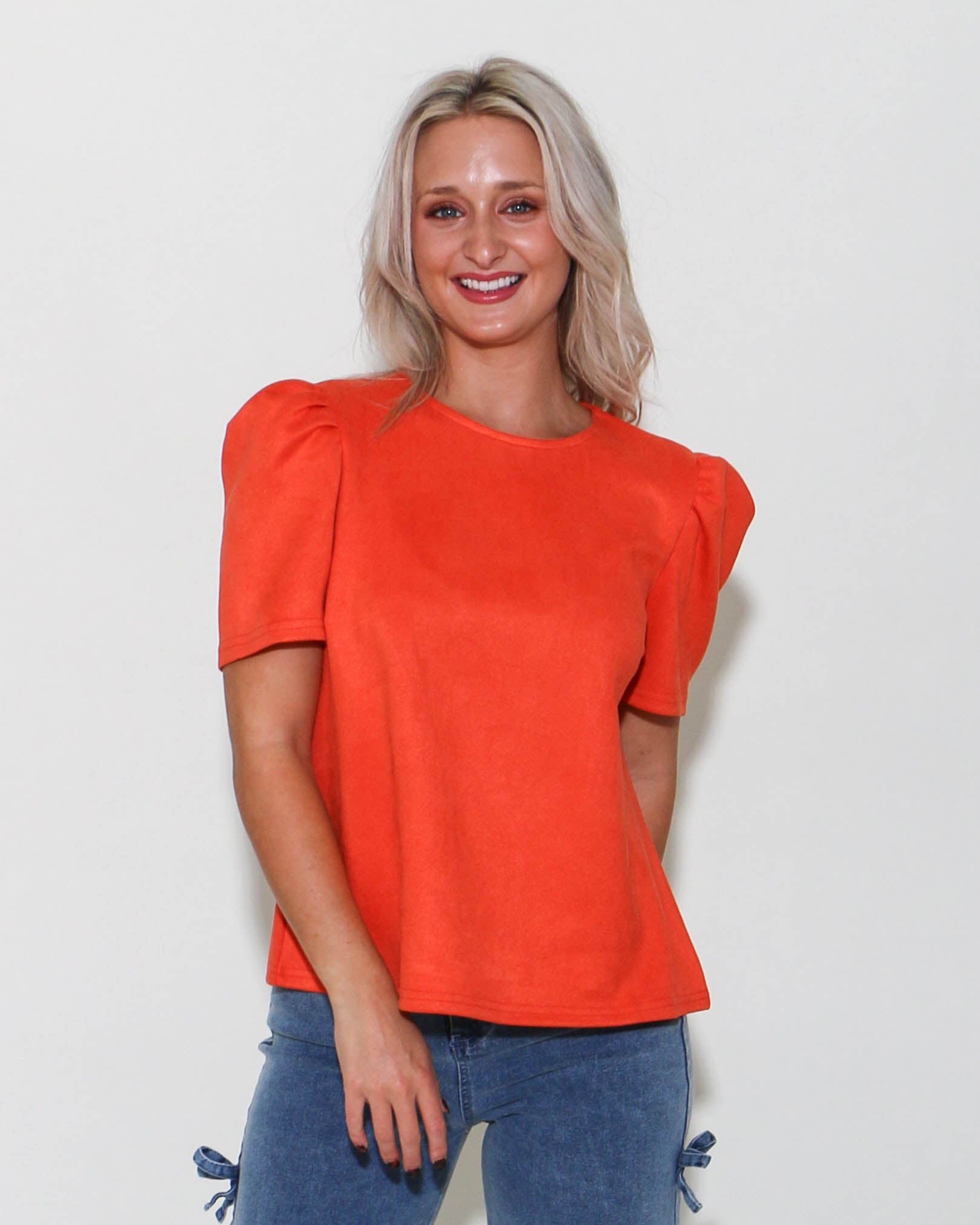 Unleash your inner fashionista with our THML Puff Sleeve Suede Top in Orange! Featuring luxurious suede fabric and trendy puff sleeves, this top is the perfect addition to your wardrobe. Dress it up or down for any occasion and stand out in style. Don't miss out on this must-have piece!