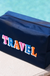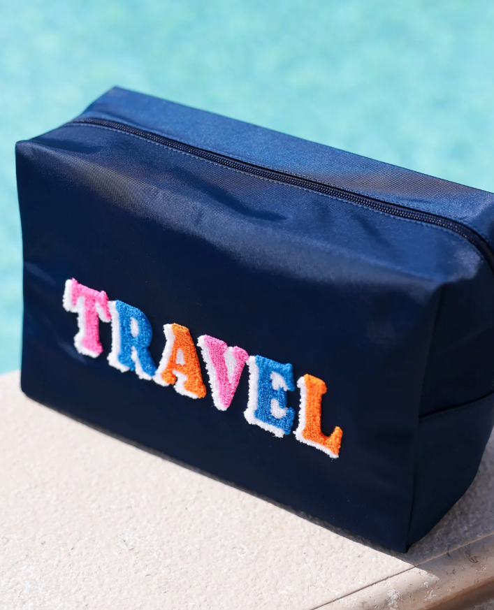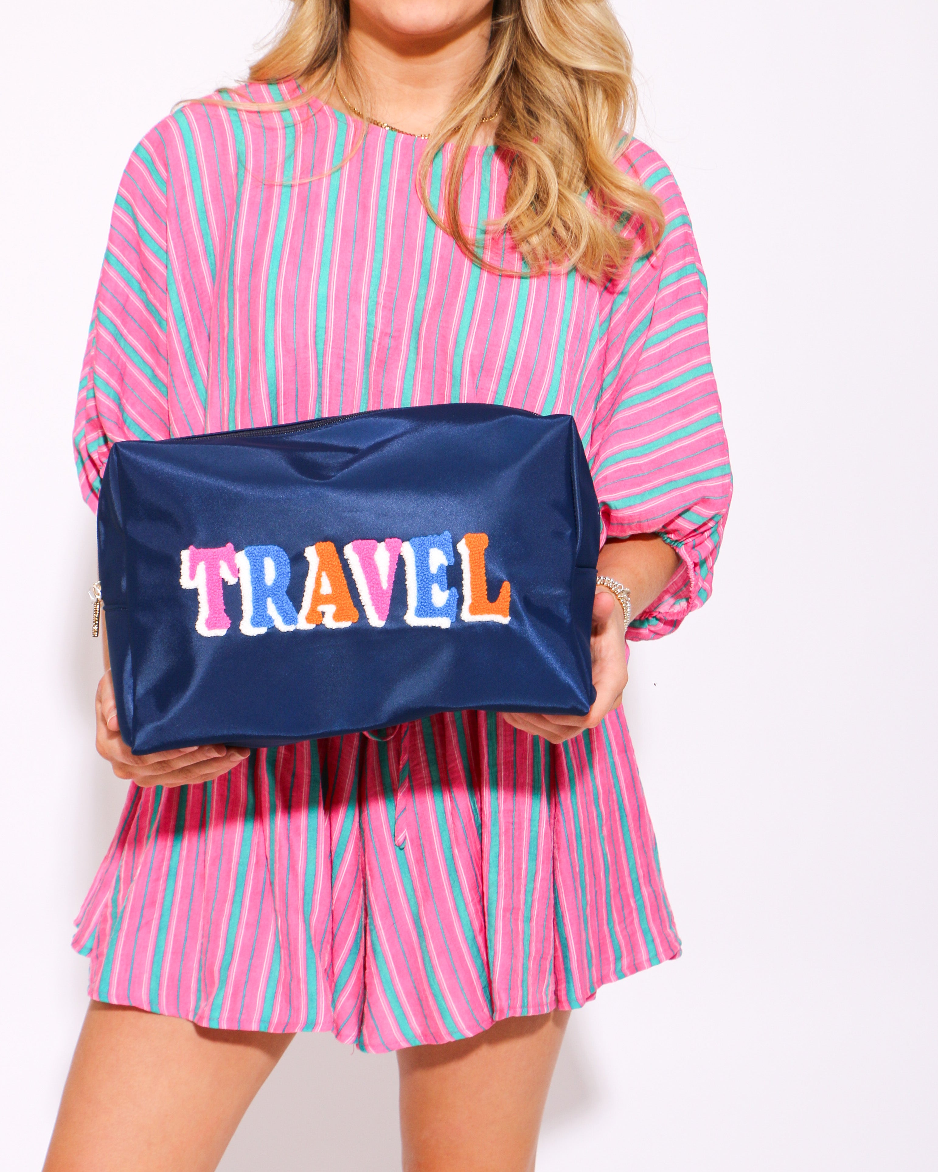 The "Travel" Oversized Zip Pouch is your ultimate travel buddy! With its roomy interior and bold, colorful chenille "TRAVEL" embroidery, this pouch keeps all your essentials neatly organized and ready for adventure. Whether it's toiletries, tech gear, or travel-sized goodies, this navy blue pouch is stylishly functional. Designed for both convenience and durability, it's the perfect companion for jet-setters and road trippers alike.