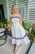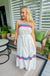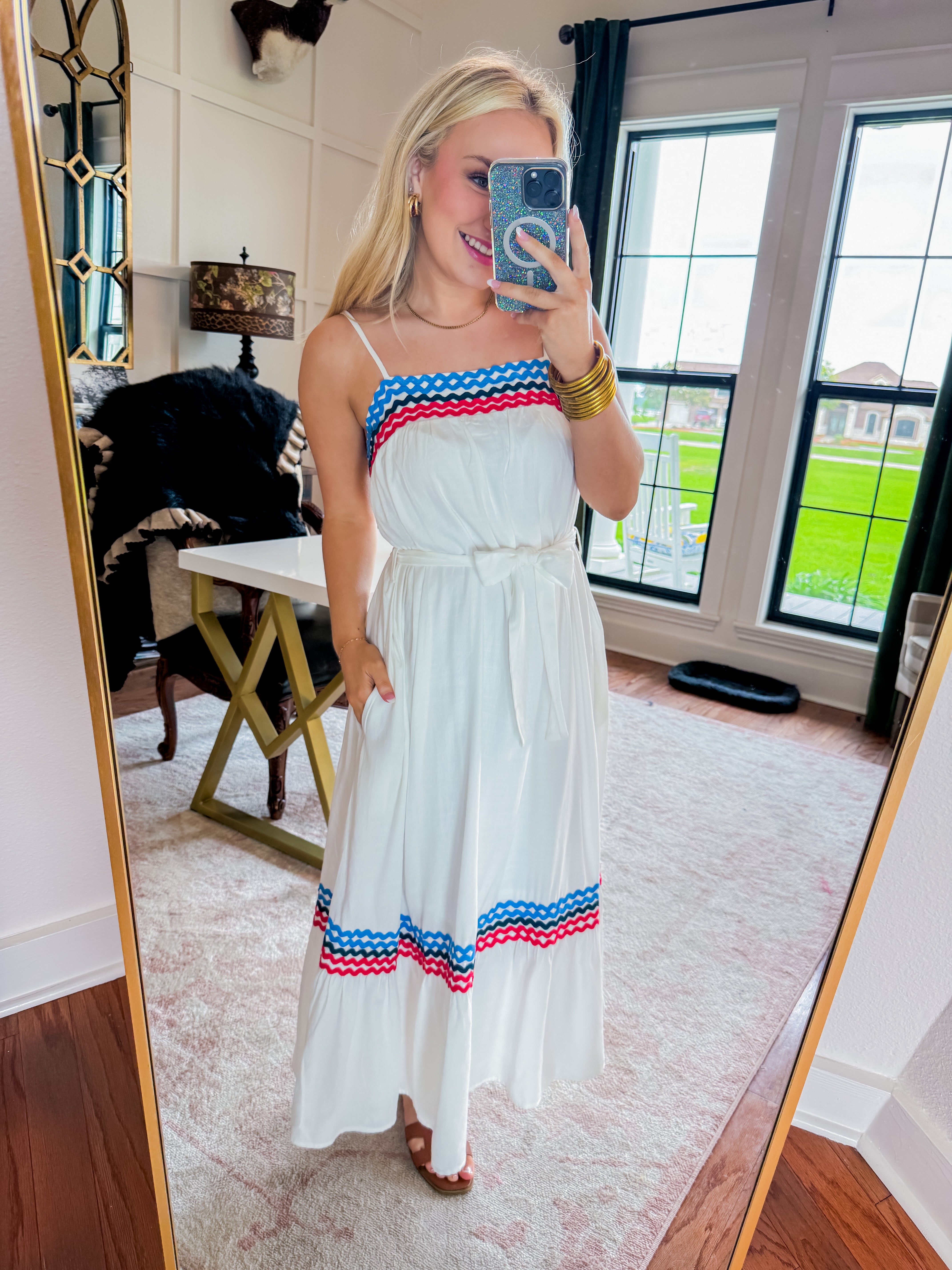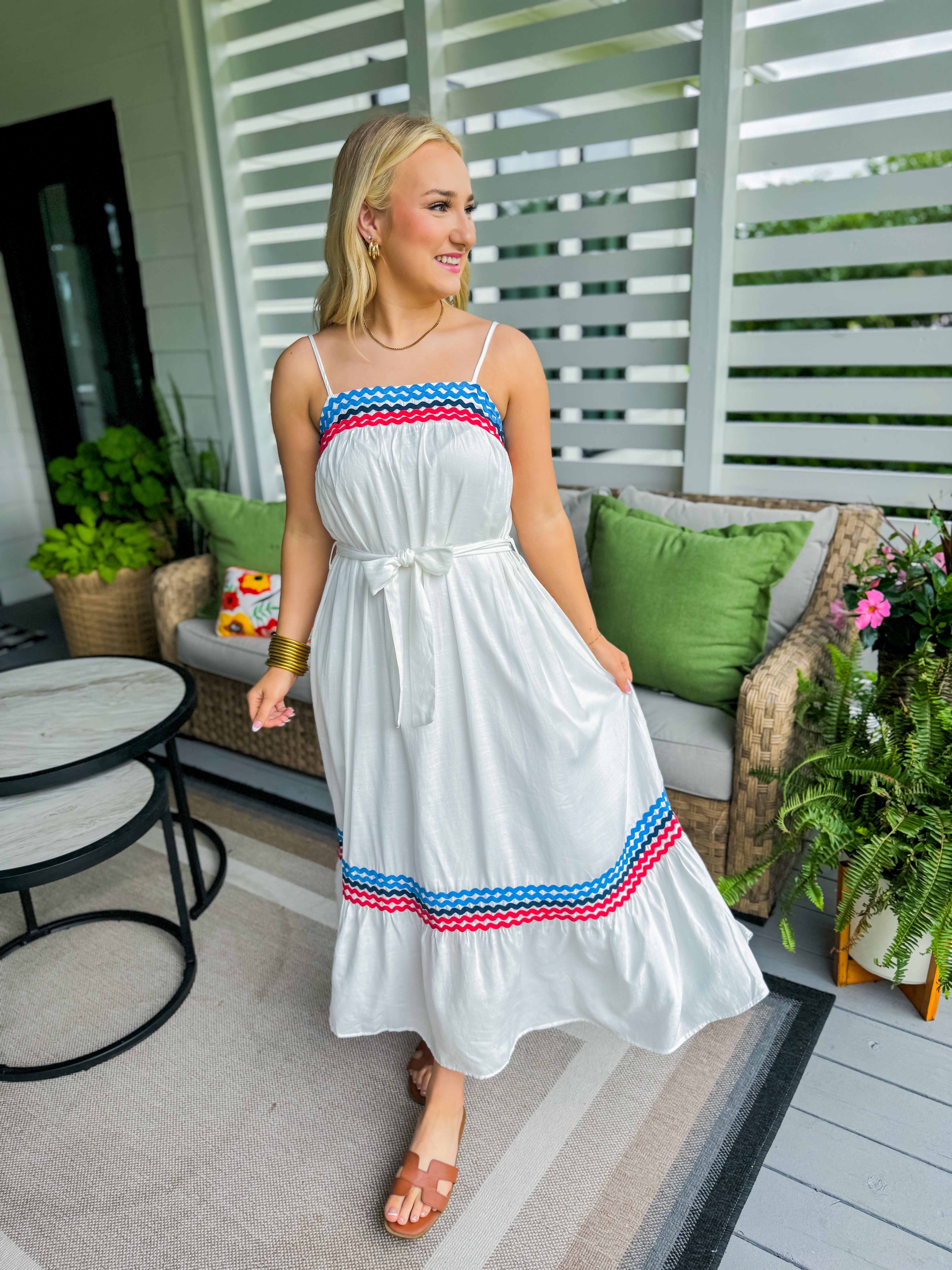 This off-white solid square neck sleeveless midi dress is both elegant and practical. The ric rac trim detail adds a charming touch, while the self-tie waist allows for a customizable fit. Belt loops and adjustable straps provide additional styling options. With pockets at the sides for added functionality, this dress is perfect for everyday wear. Crafted from a blend of polyester and cotton woven fabric, it's lightweight and breathable, making it ideal for warmer days. Plus, its non-sheer nature ensures confidence with every wear.