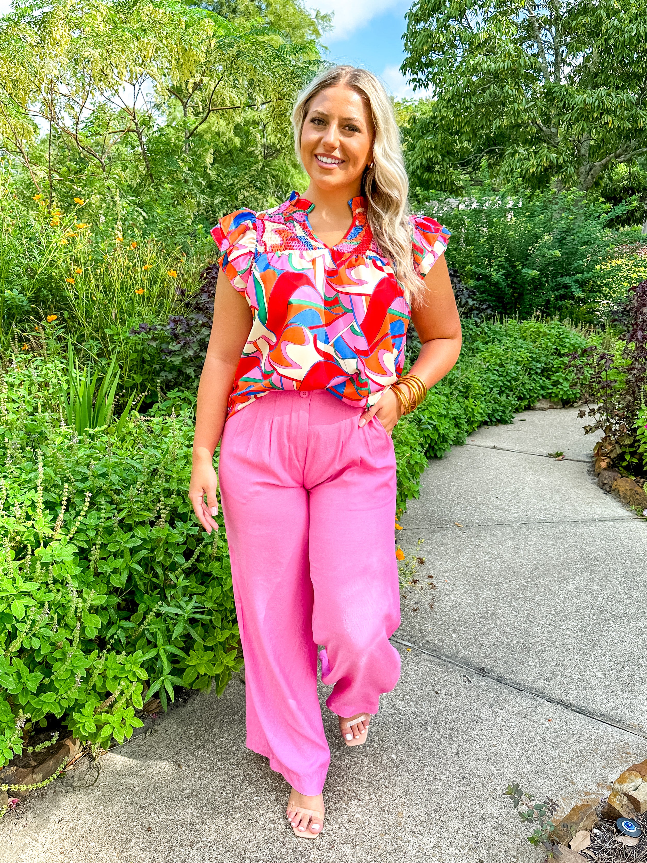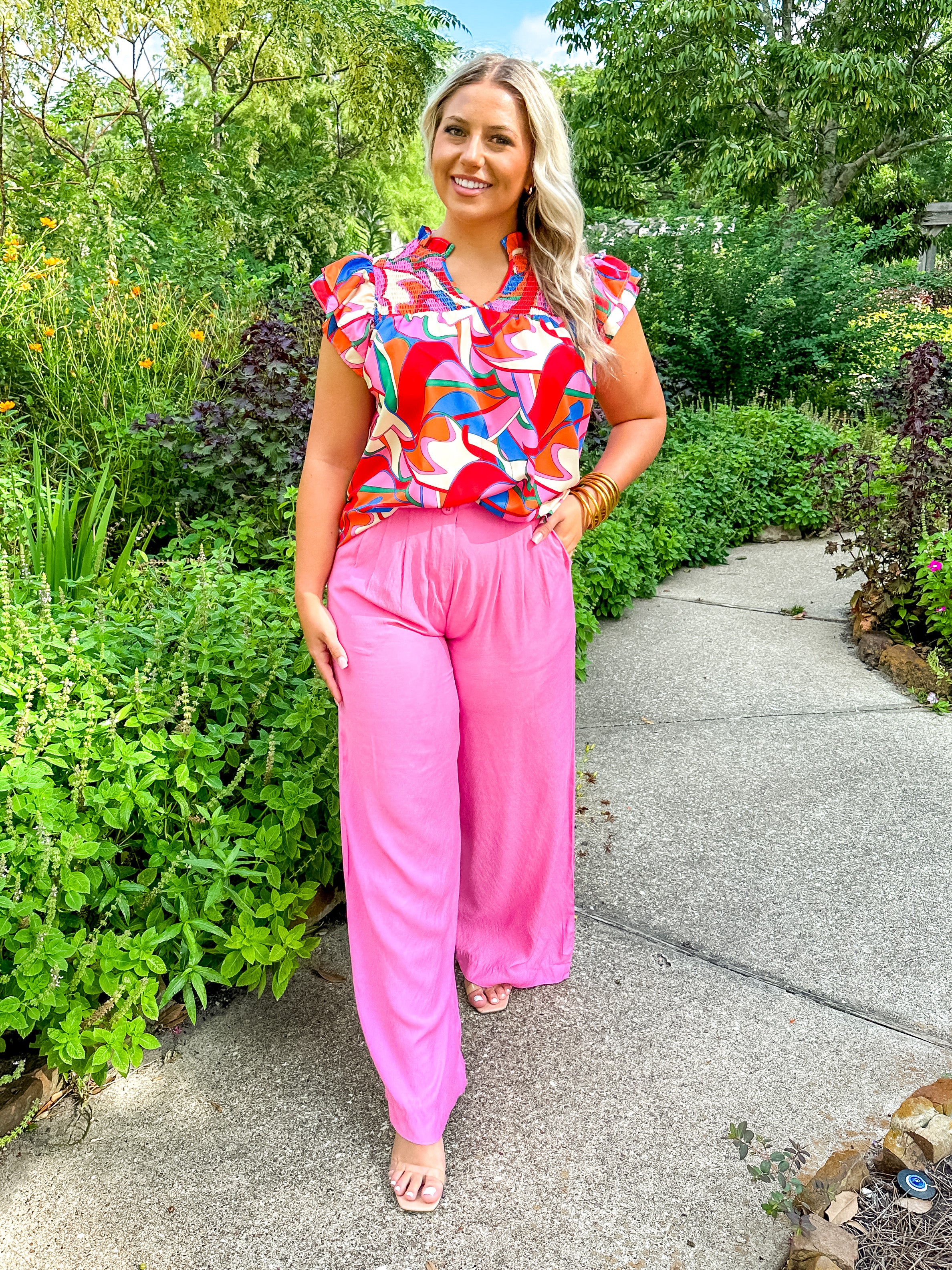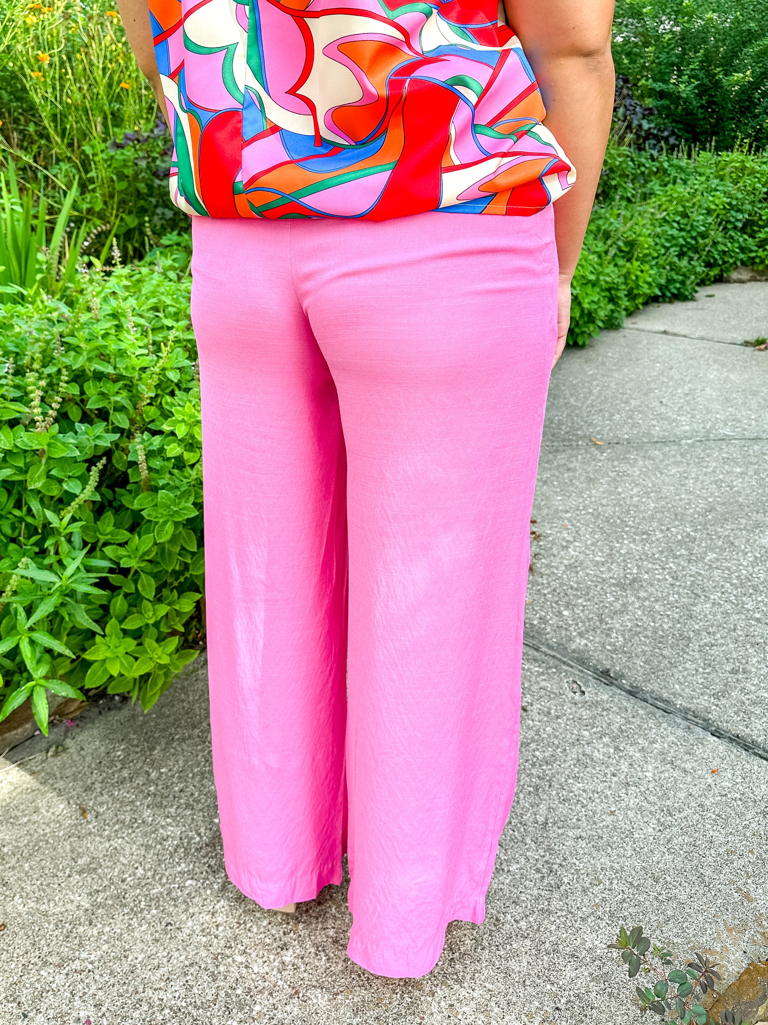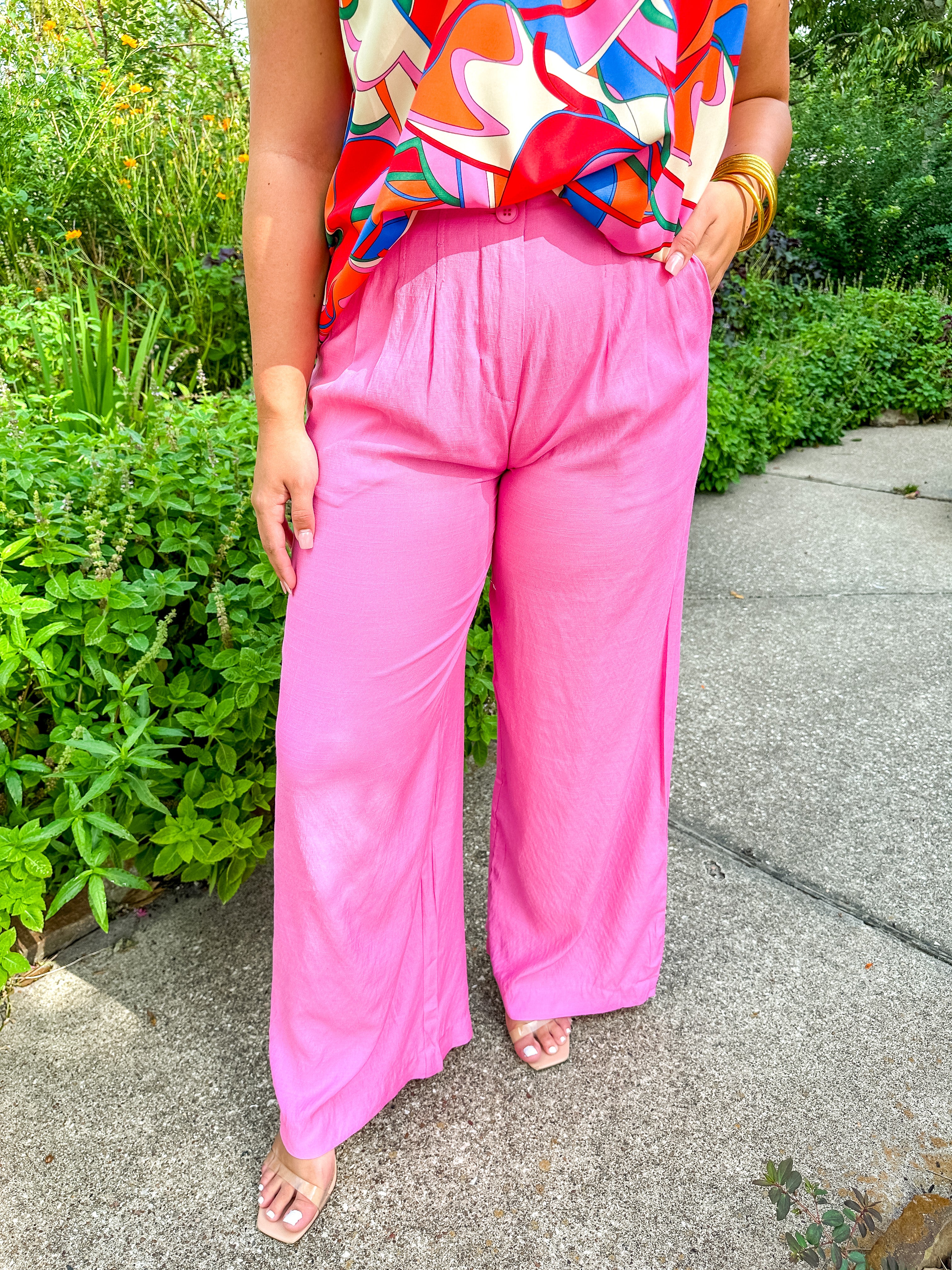 + Wide leg trousers + Pleated high rise waist + Zip up closure with button + Elastic waistband on back + Pockets