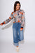 This long-sleeve knit sweater features a heather gray base adorned with bold abstract floral accents in pink, orange, gray, and navy. Its high neck and contrast-striped cuffs add a stylish touch while providing cozy warmth. Perfect for elevating your casual wardrobe with a distinctive, eye-catching design.